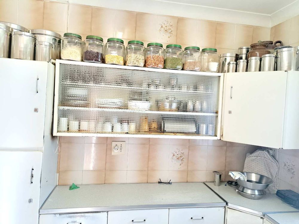 Kitchen: Small, old-fashioned kitchen equipped with steel cupboards and a 4-plate gas stove, offering a quaint and functional space for meal preparation.