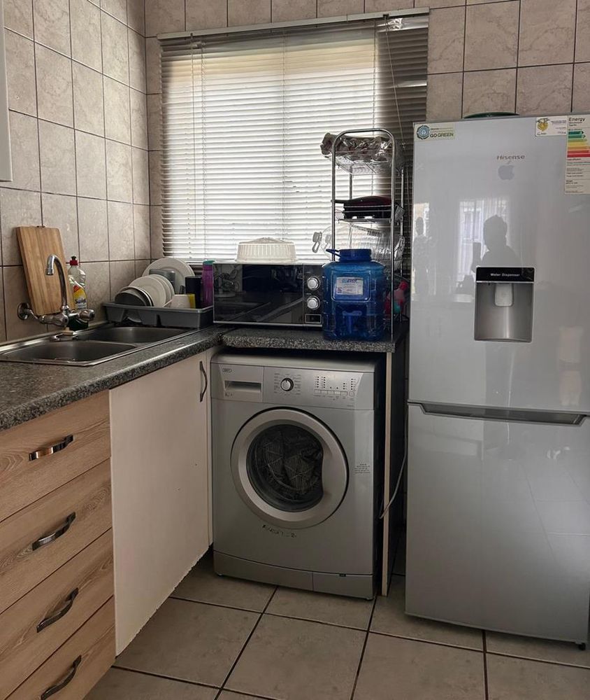 The kitchen is a culinary delight, boasting built-in cupboards with melamine tops, a double basin sink, and a convenient breakfast table. It comes equipped with a four-plate stove and an under-counter oven, all set against the backdrop of stylish wall tiles that reach the ceiling. There's also space allocated for a front-loading washing machine, ensuring laundry tasks are effortless.