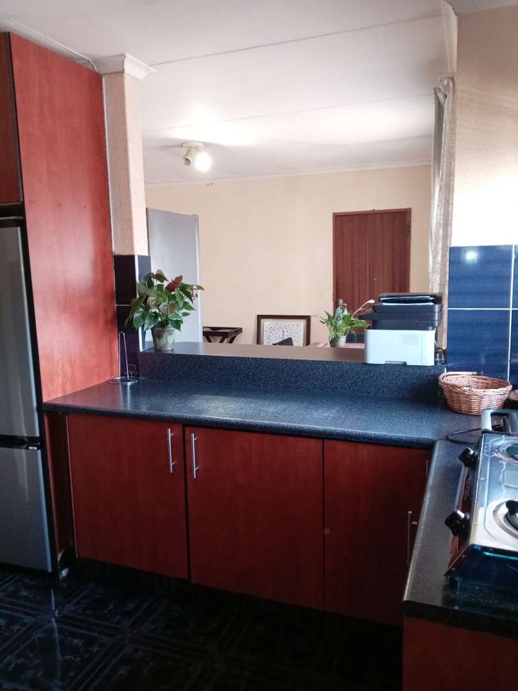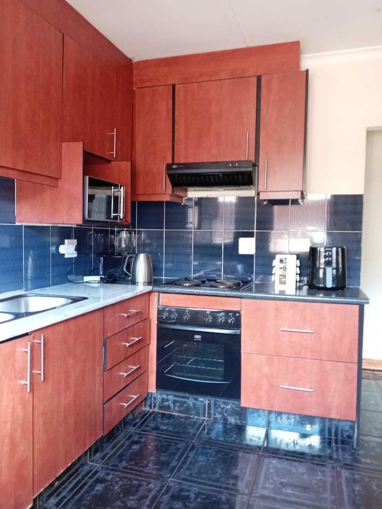 The heart of the home is its beautifully tiled kitchen, equipped with a four-plate stove, undercounter oven, and extractor fan. You'll find ample space for all your culinary needs, including a single sink, room for an electrical appliance, and space for a single-door fridge. The elegant granite countertops and built-in cupboards provide both practicality and a touch of sophistication.