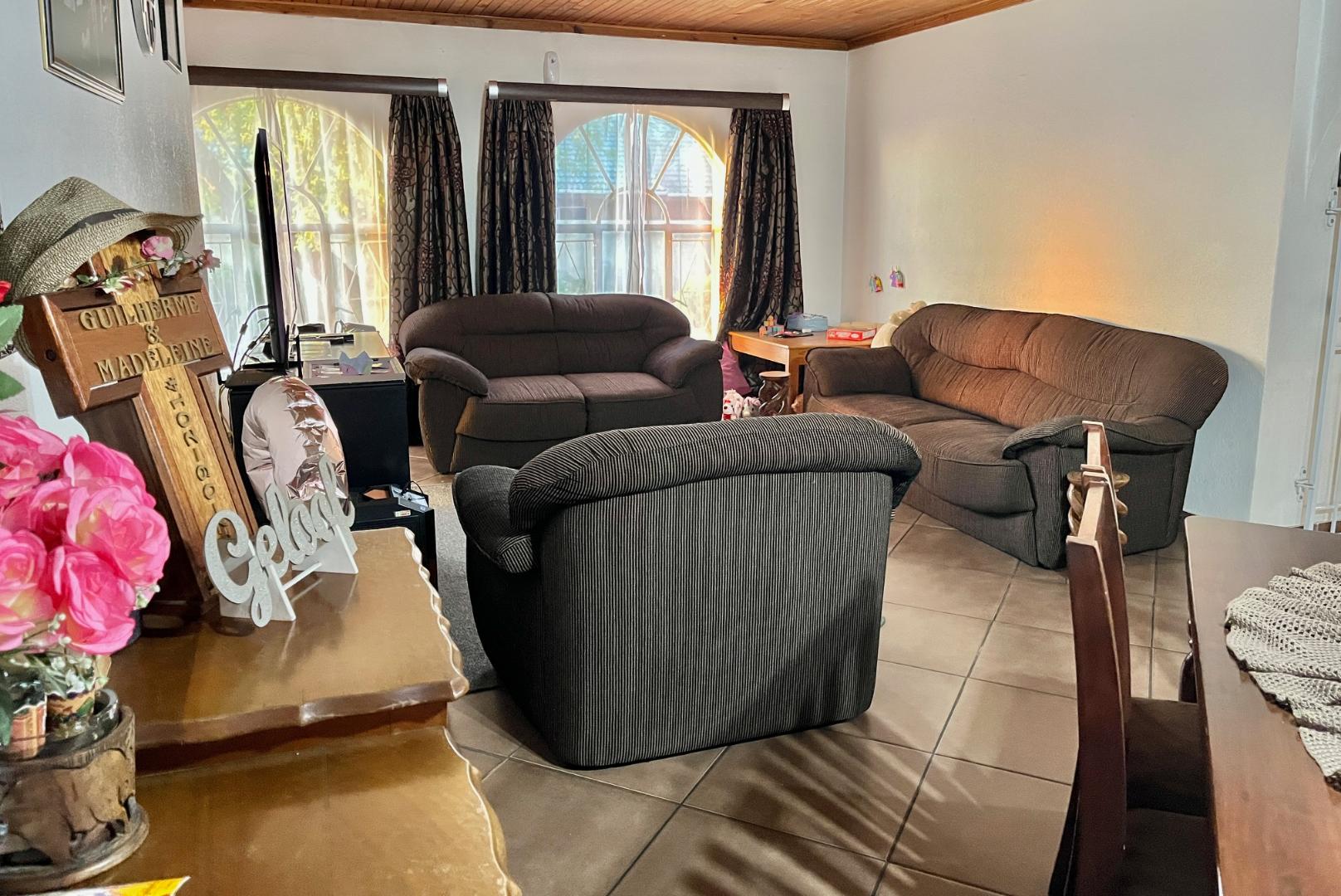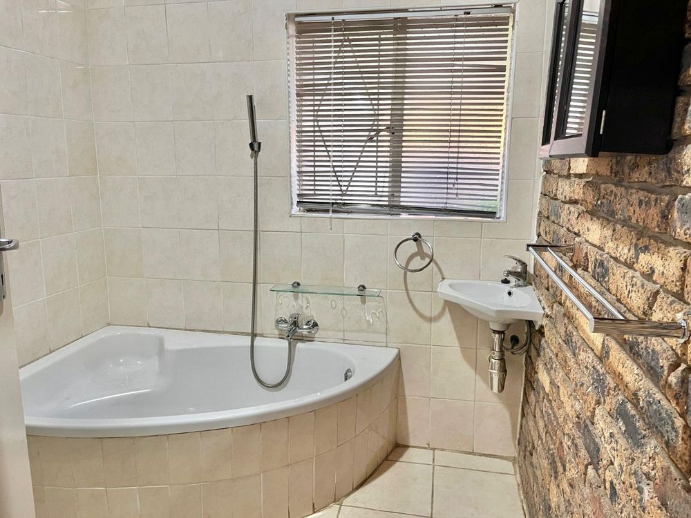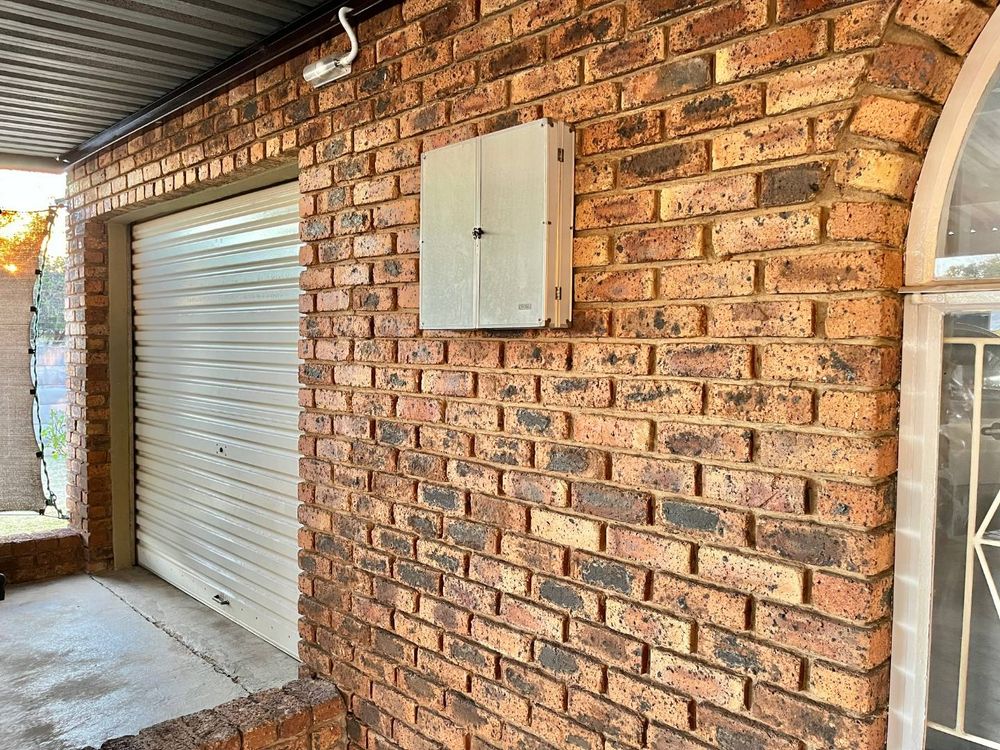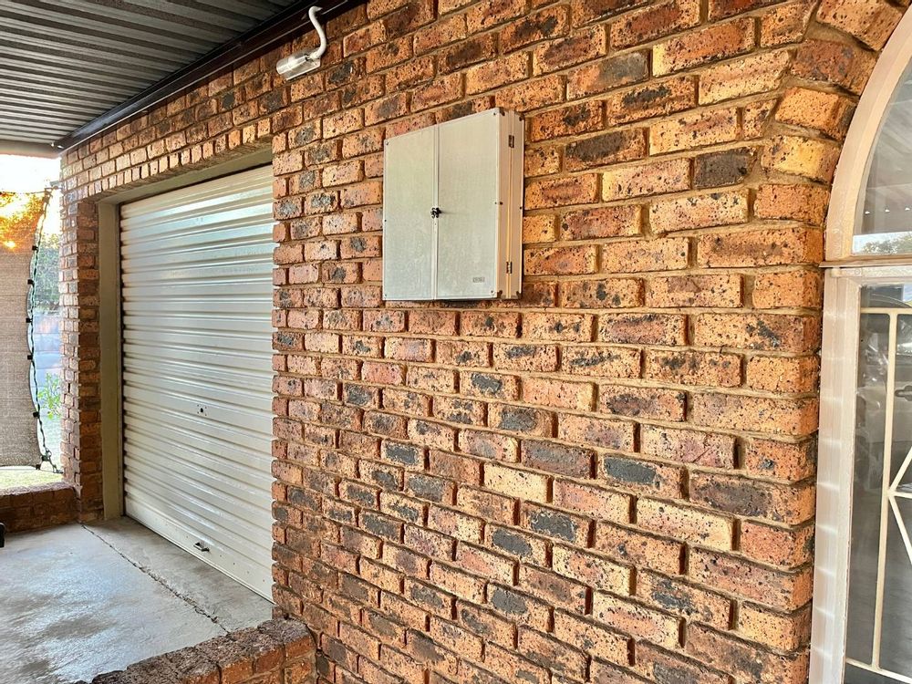 Low maintenance house with face brick walls, pitched tiled roof, steel windows, and a brick-paved driveway. Motorized gate. A 1.8-meter wall surrounds the property: three sides with pre-cast walls and one side with a brick-built wall. Large, open, level garden with grass.