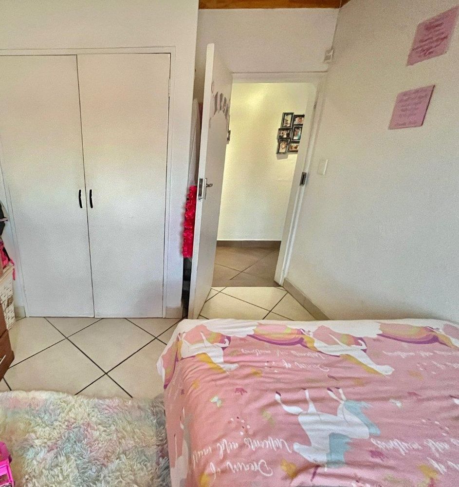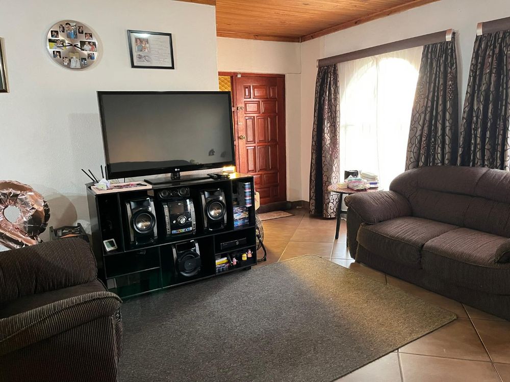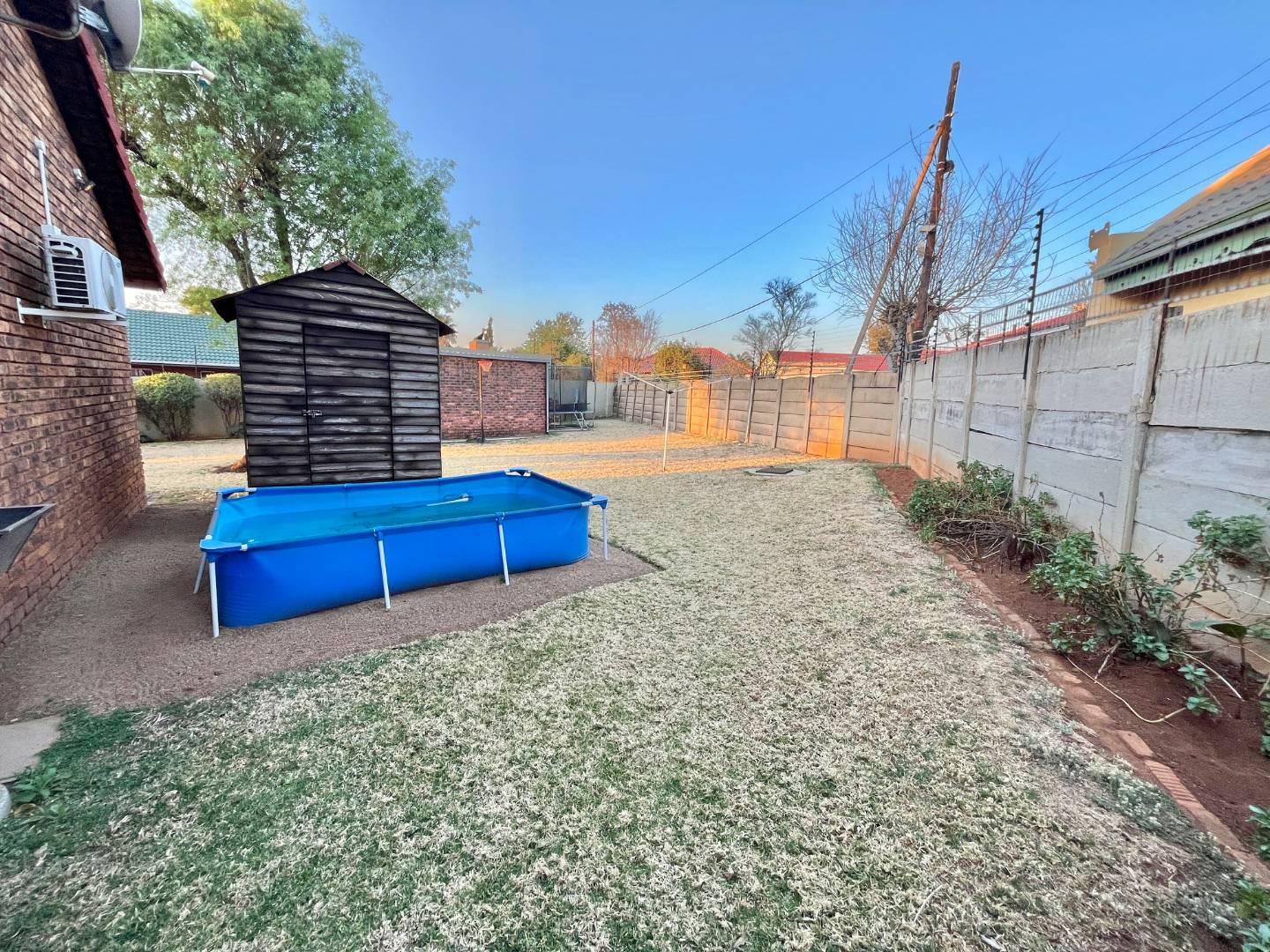 Low maintenance house with face brick walls, pitched tiled roof, steel windows, and a brick-paved driveway. Motorized gate. A 1.8-meter wall surrounds the property: three sides with pre-cast walls and one side with a brick-built wall. Large, open, level garden with grass.