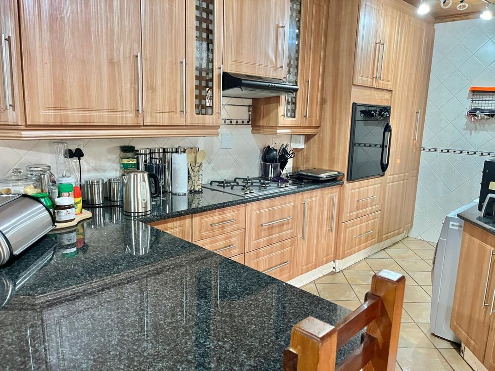 Open-plan kitchen with breakfast corner, granite countertops, tiled walls and floors, wrapped wooden cupboards, four-plate stove, and single ELO. Connection points for a dishwasher and washing machine, single sink, and pantry cupboard.