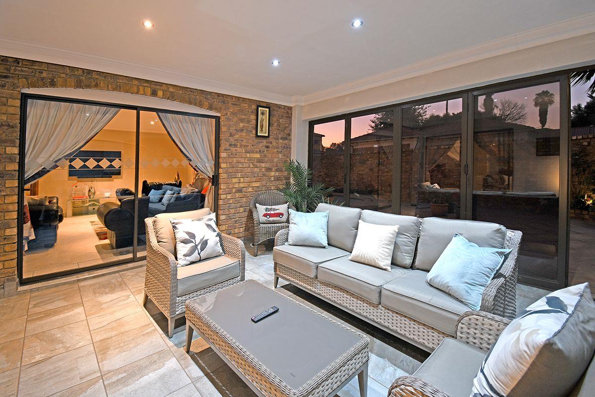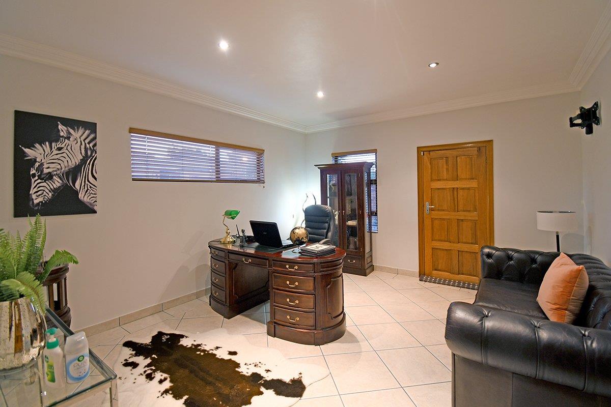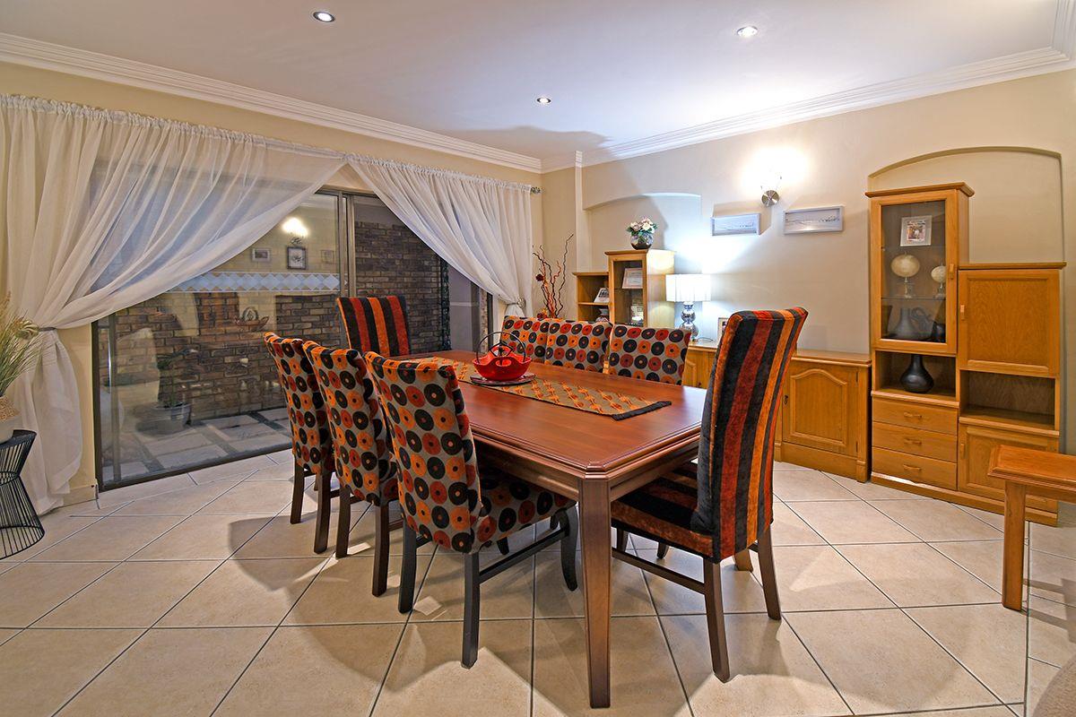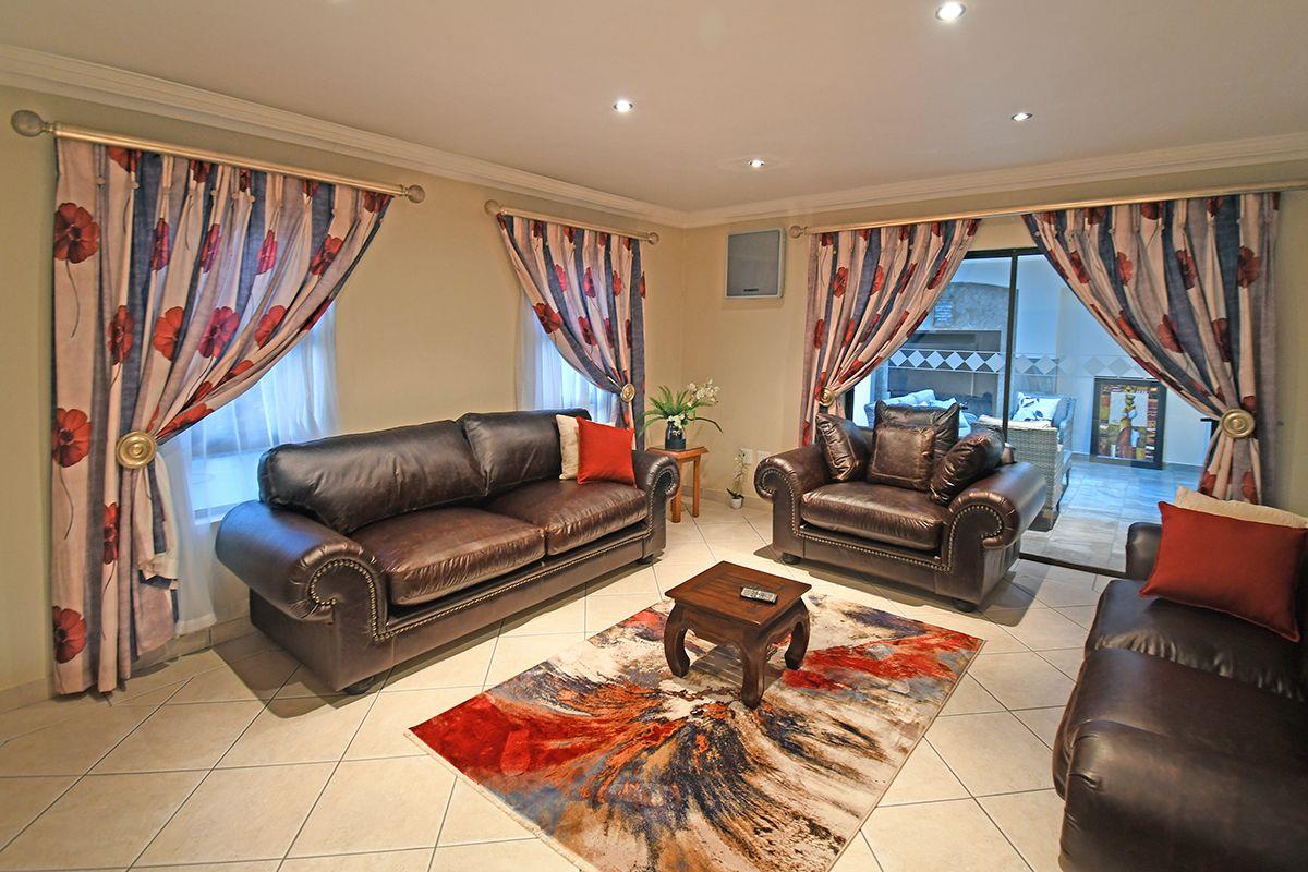 This home boasts a formal lounge, TV lounge, and dining room, all equipped with underfloor heating for added comfort. The kitchen with a scullery connects to the double garage. For those who love to entertain, an enclosed patio with a built-in braai awaits, with stacker doors that open up to reveal the serene garden and solar-heated swimming pool.