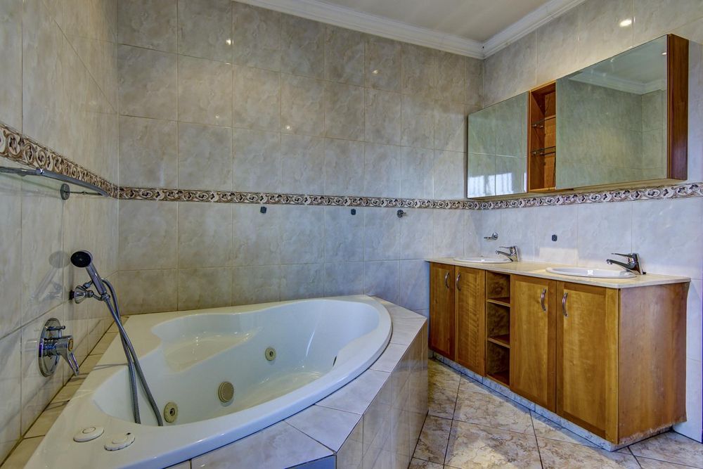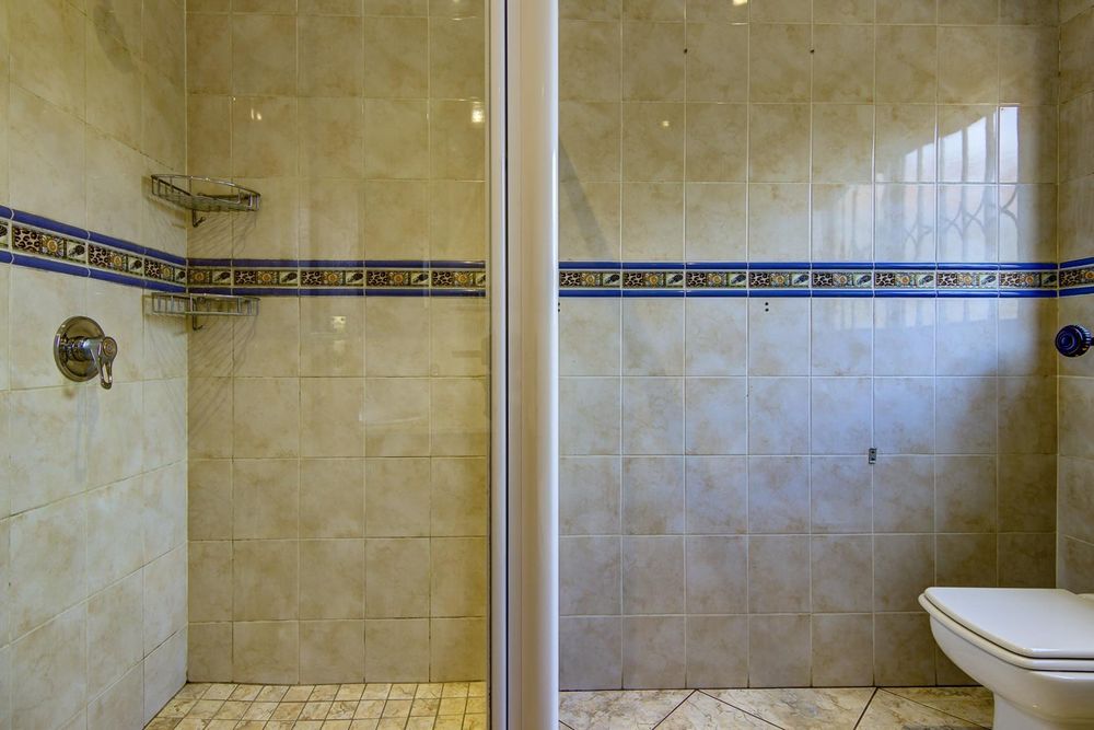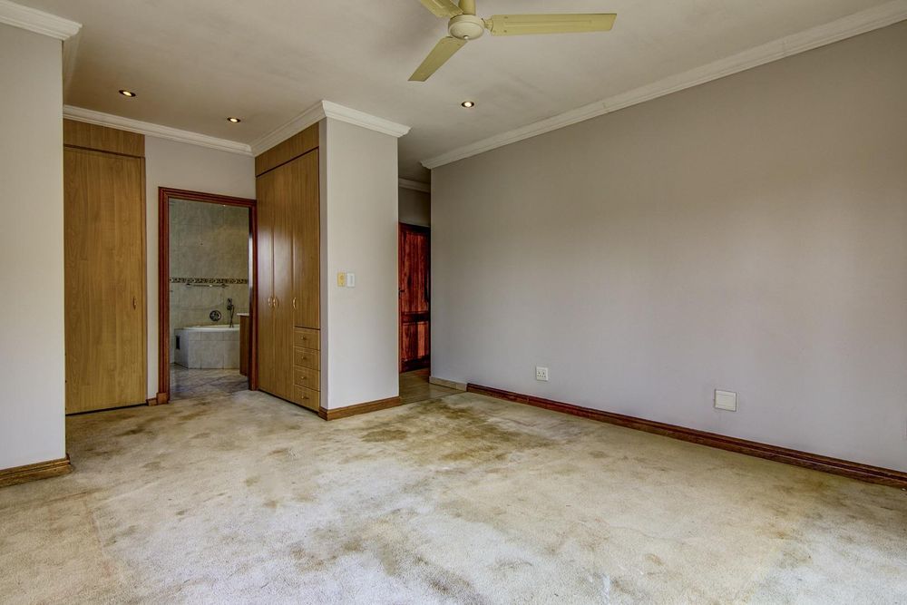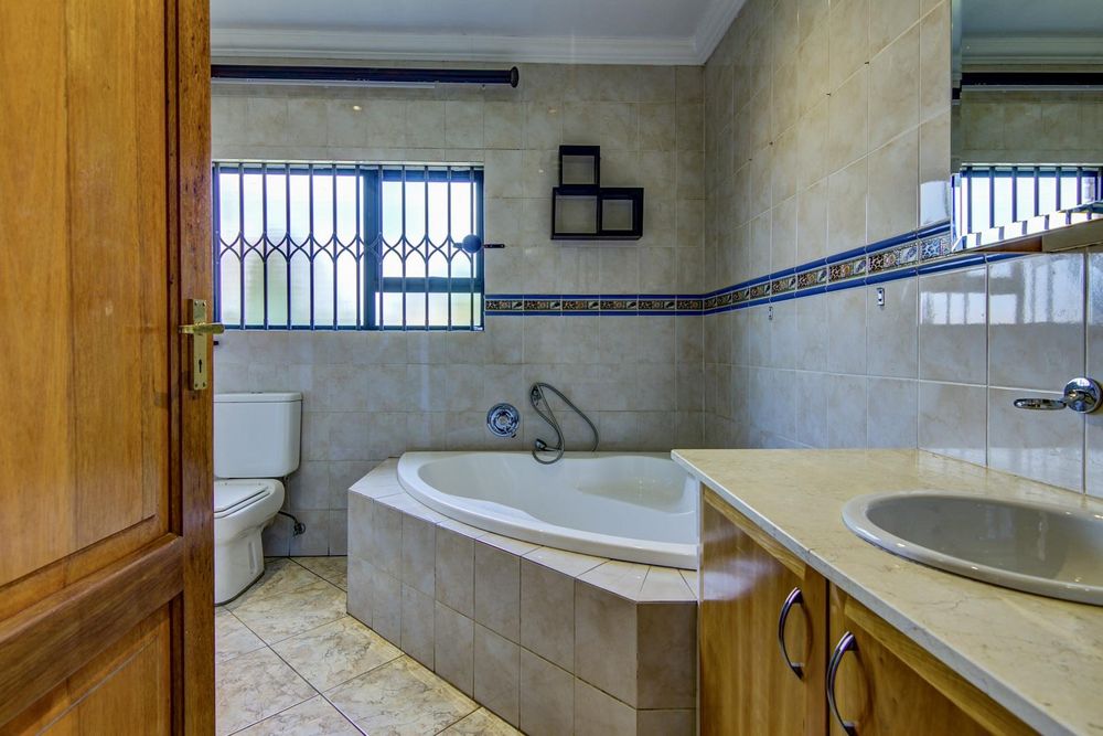 This welcoming, north facing home has an appealing layout ideal for relaxed family living. Downstairs, open plan living areas flow onto a long covered patio with built-in braai and a lovely view of the pool and landscaped garden. Watch the children swim and play from the open plan kitchen and scullery. Guest bathroom.