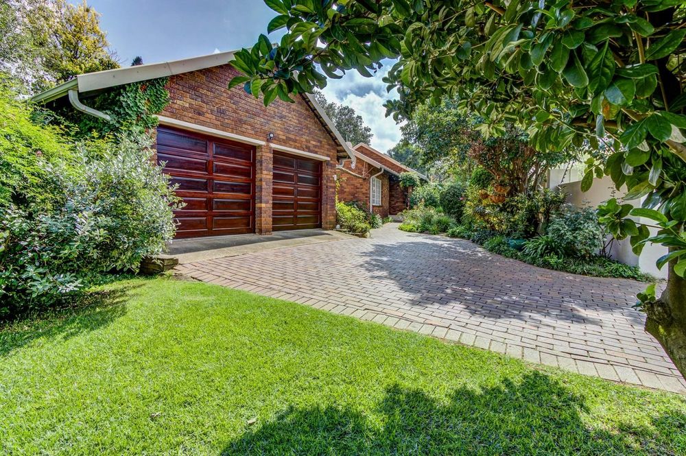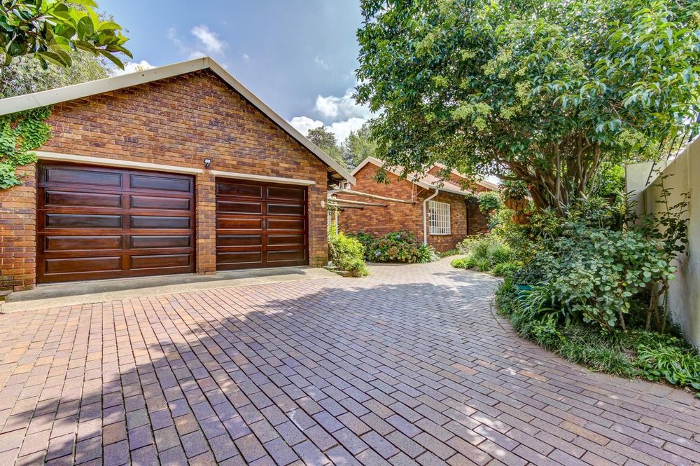 Double automated garage and paved extra parking under a pergola for an additional vehicle.