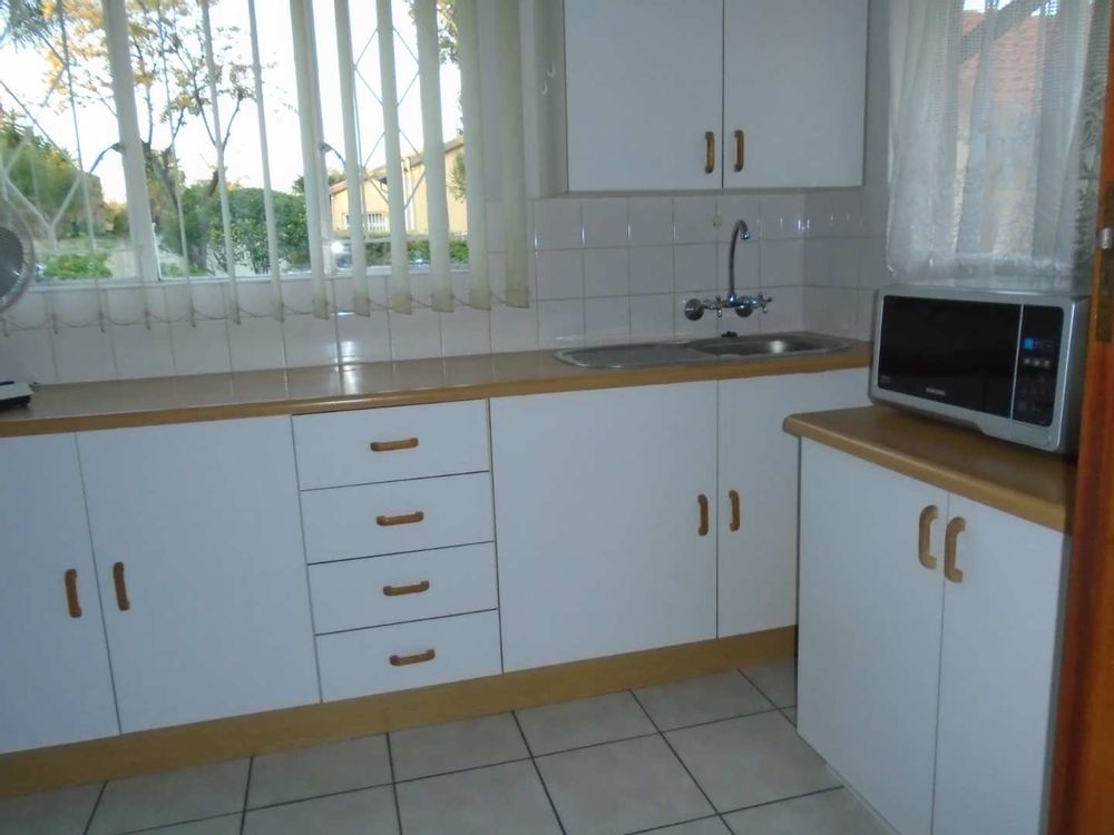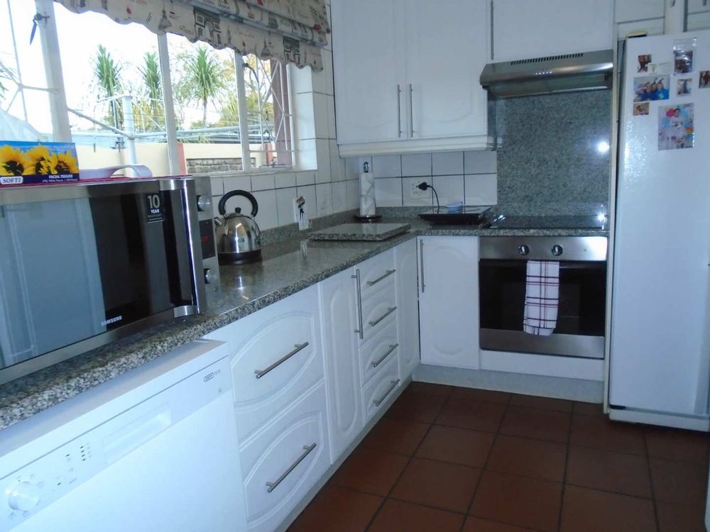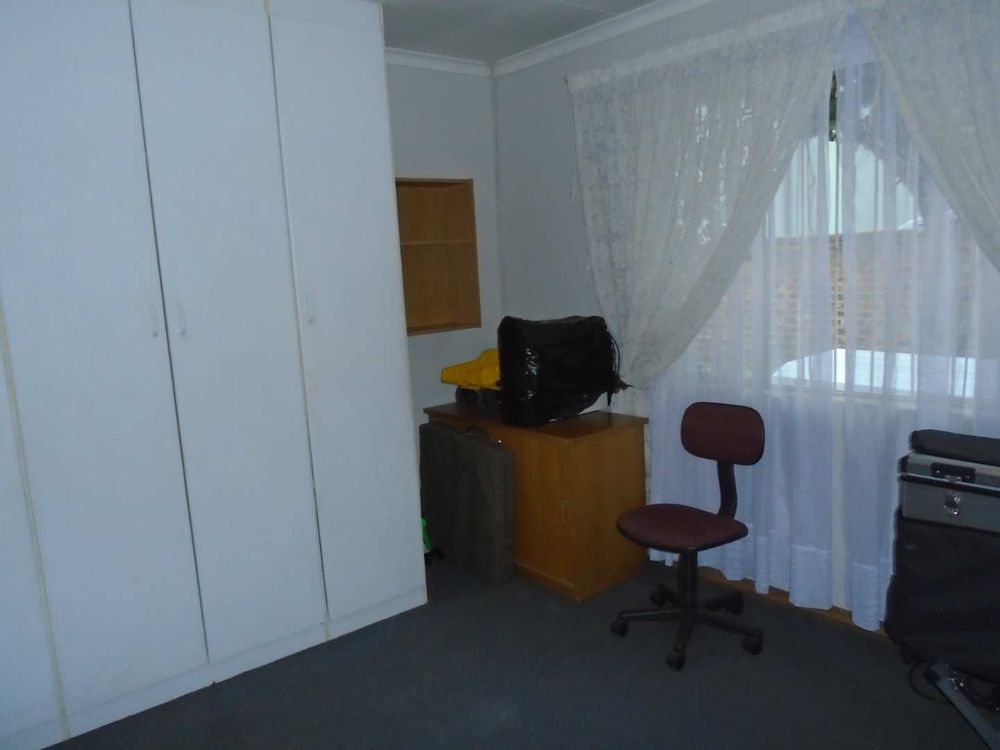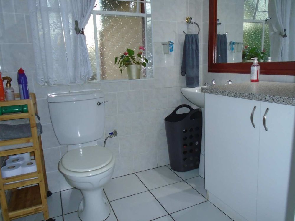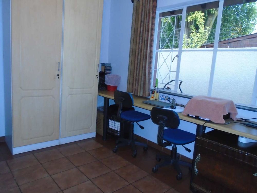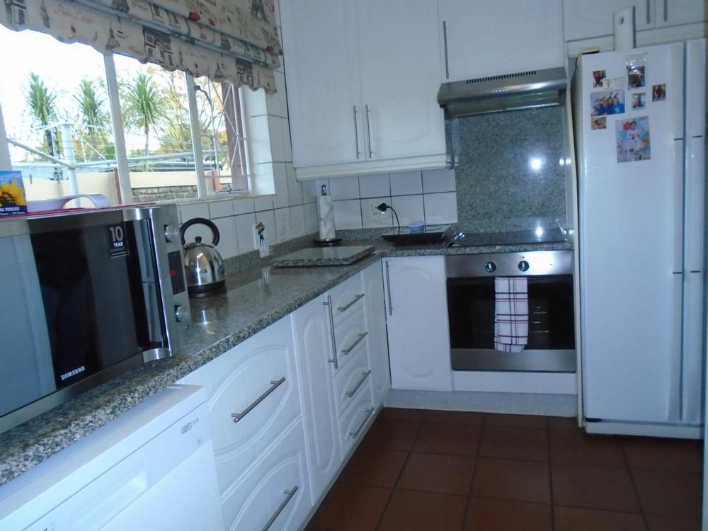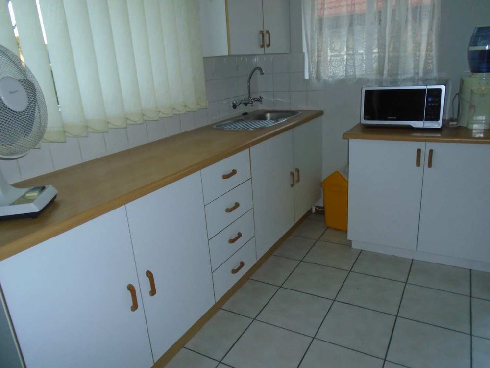 The open-plan dining area flows into a well-appointed kitchen, featuring melamine units and granite countertops, providing ample space for all your appliances. A convenient scullery complements the kitchen, adding extra functionality. For those who work from home, a tiled study with a movable cupboard, which is included with the property, offers a quiet workspace.