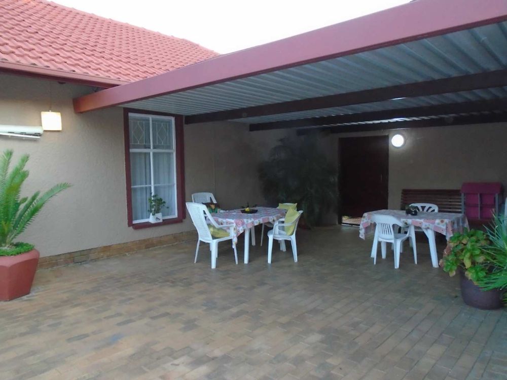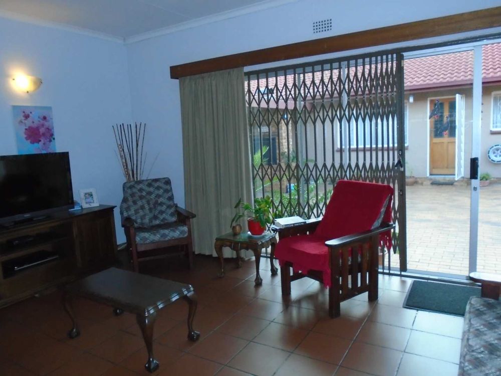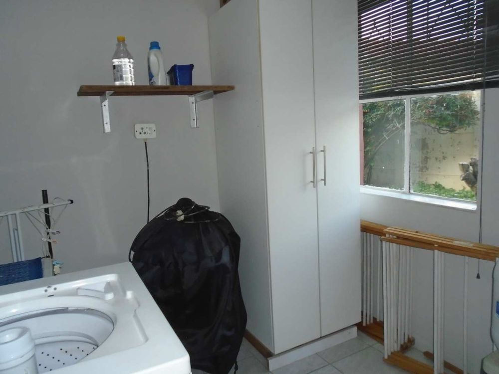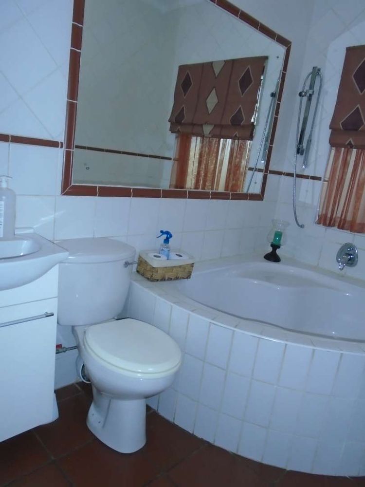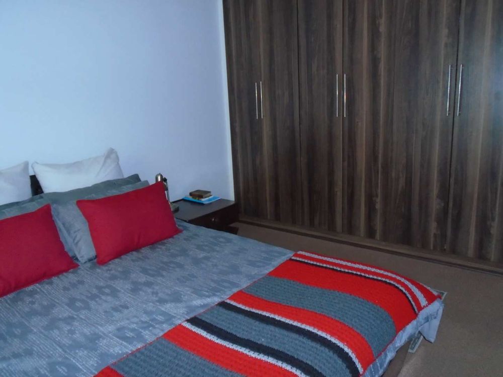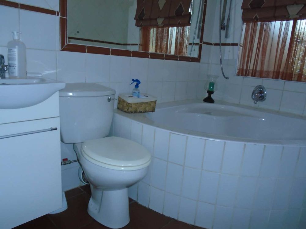 The open-plan dining area flows into a well-appointed kitchen, featuring melamine units and granite countertops, providing ample space for all your appliances. A convenient scullery complements the kitchen, adding extra functionality. For those who work from home, a tiled study with a movable cupboard, which is included with the property, offers a quiet workspace.