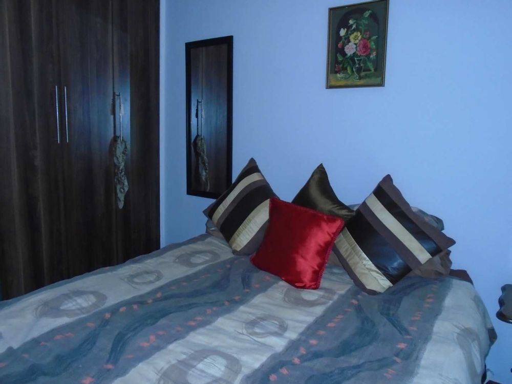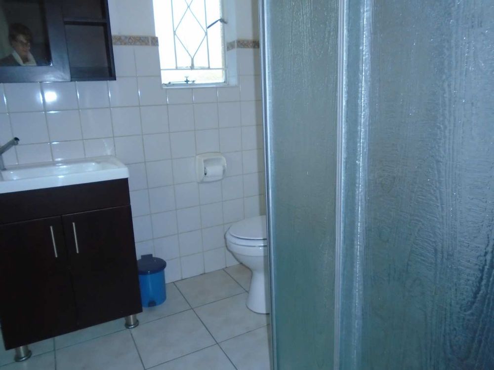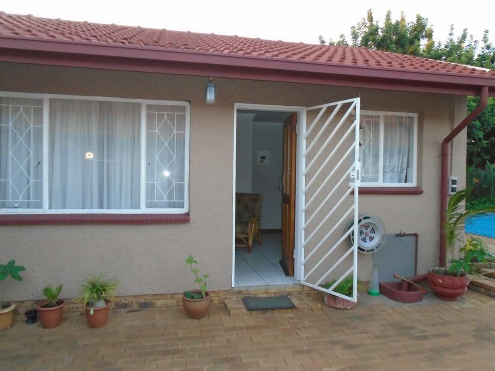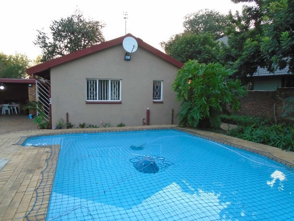 Step outside to enjoy a large swimming pool equipped with a safety net, ideal for family fun during warmer months. Additionally, the property includes a one-bedroom granny flat with a tiled lounge and an open-plan kitchen with melamine units. The bedroom offers built-in cupboards and is accompanied by a bathroom featuring a shower, toilet, washbasin, and vanity unit.