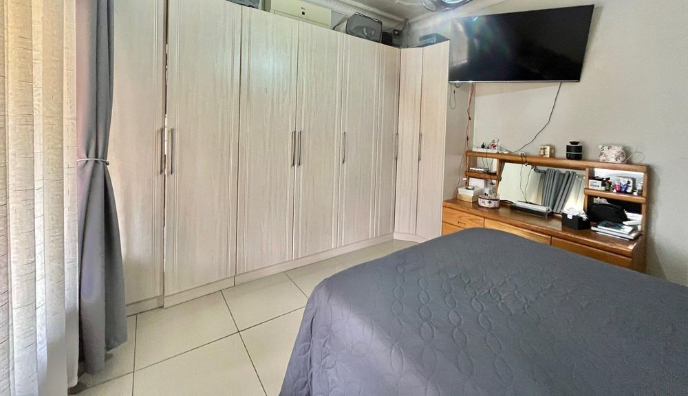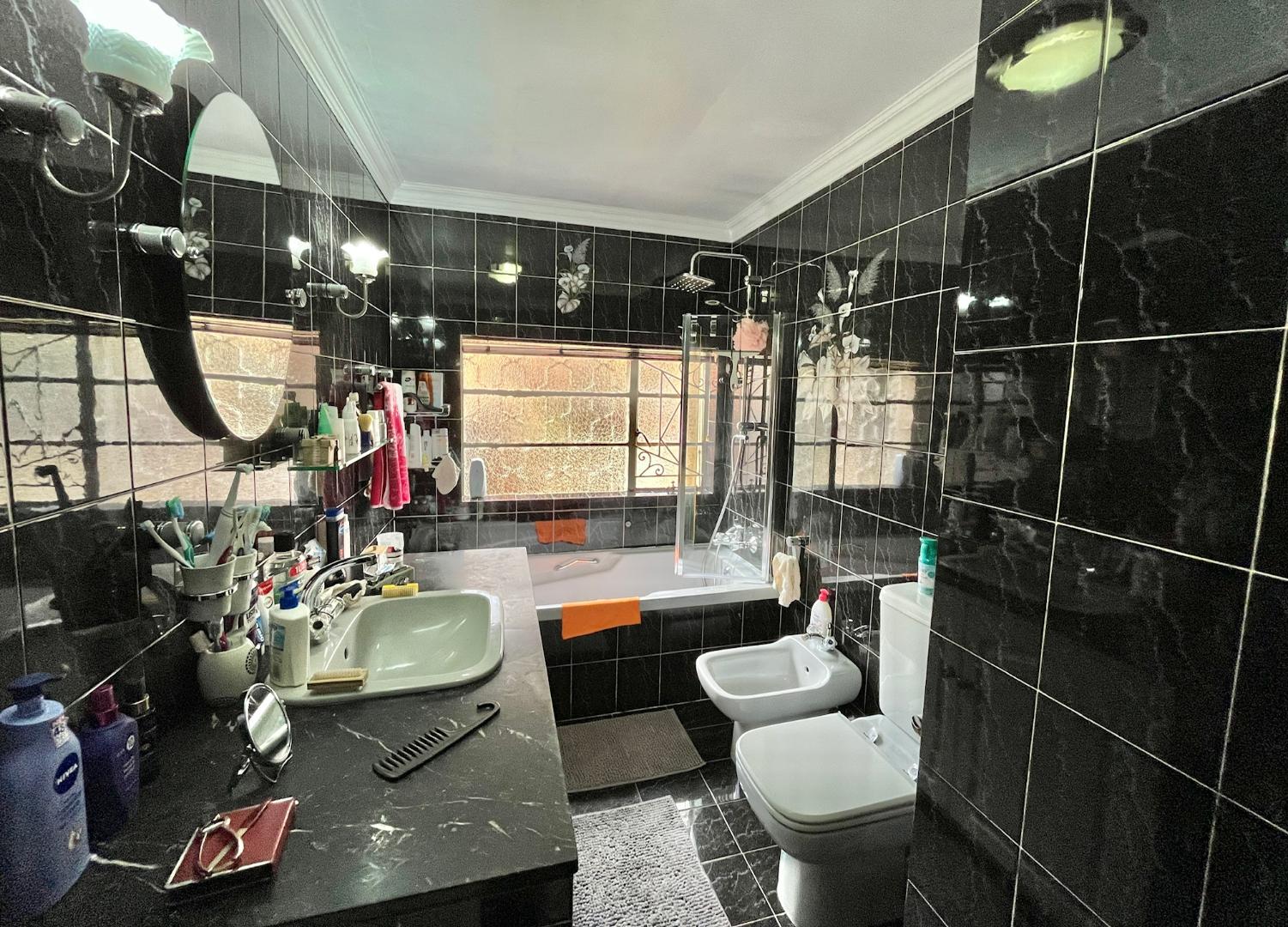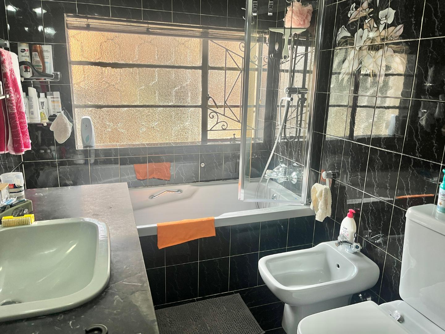 The home boasts three generously sized bedrooms, each with tiled floors and built-in cupboards. The main bedroom is a standout feature, equipped with an air conditioner and a TV connection. A unique aspect of this room is the large built-in cupboard that opens directly into the en-suite bathroom, offering convenience and a touch of luxury. The other two bedrooms are equally comfortable, sharing access to two modern, renovated bathrooms within the house, both fitted with a bath, shower, basin, and toilet.
