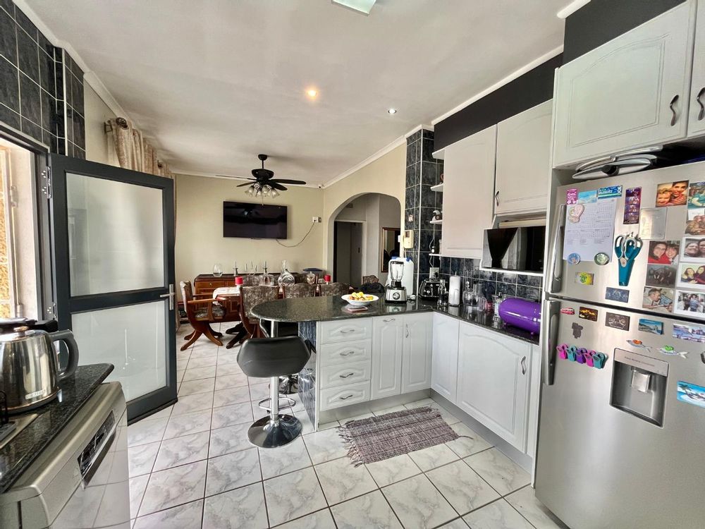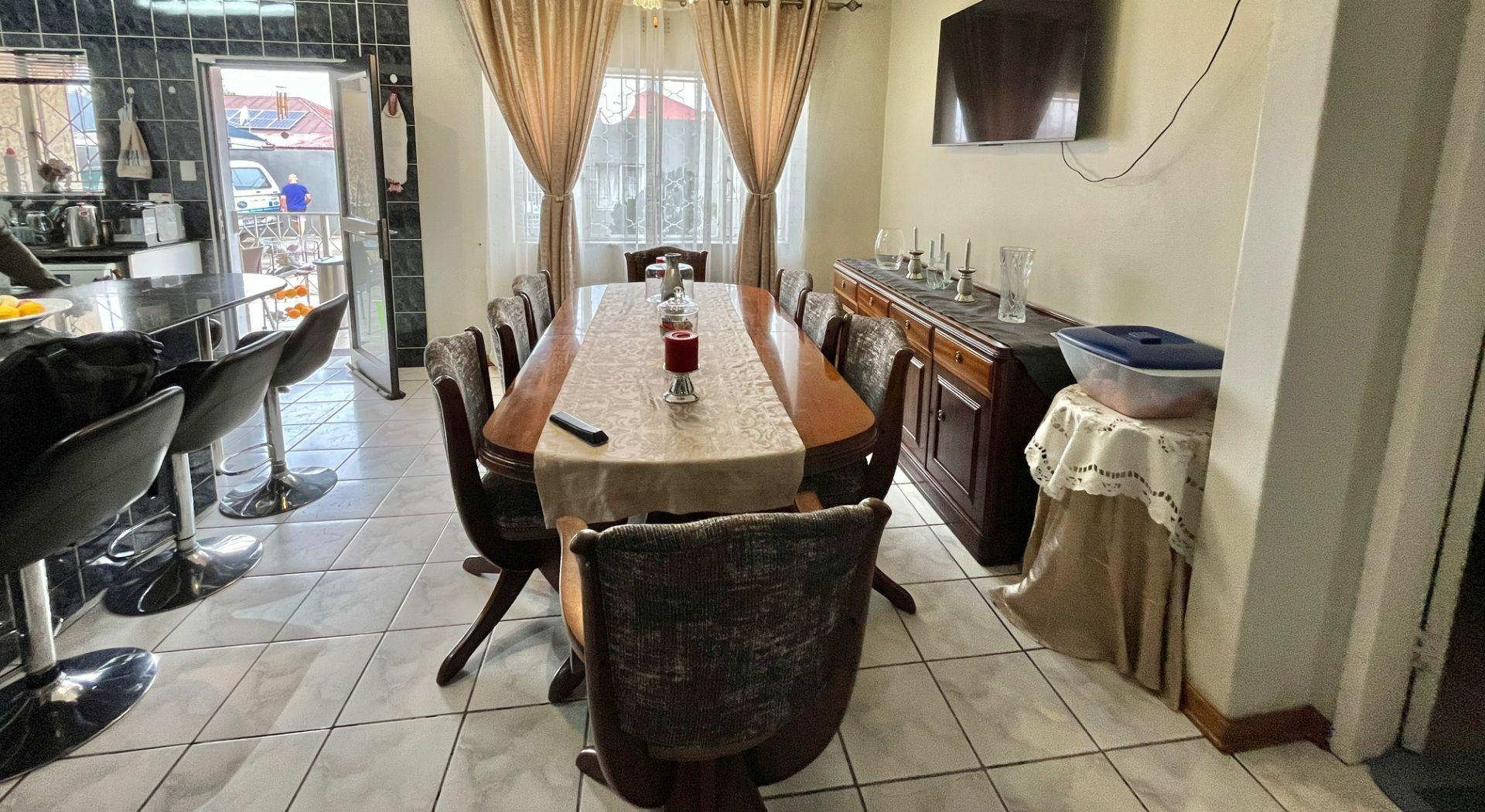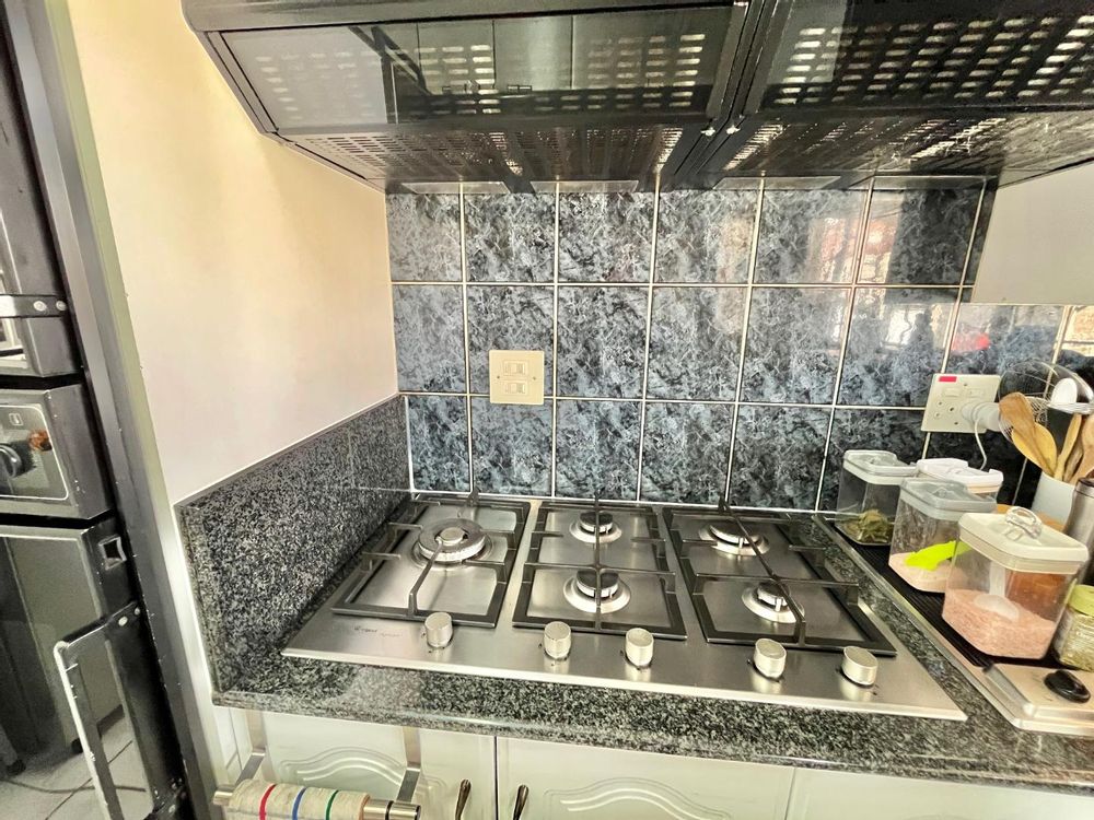 Step inside through the front door into a medium-sized entrance hall that seamlessly flows into an open-plan lounge equipped with an air conditioner, ensuring year-round comfort. Adjacent to the lounge is a dining room that adjoins a beautifully renovated open-plan kitchen. The kitchen is a chef's dream, featuring granite countertops, elegant wooden cupboards, and a versatile gas stove with five burners. A breakfast corner and a pantry cupboard add to the functionality and charm of this culinary space, complete with tiled floors and walls for easy maintenance.