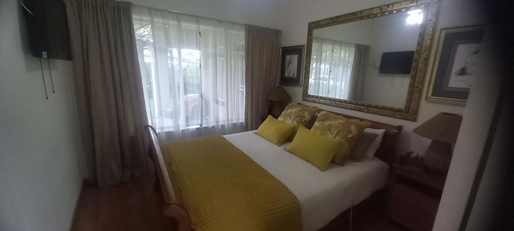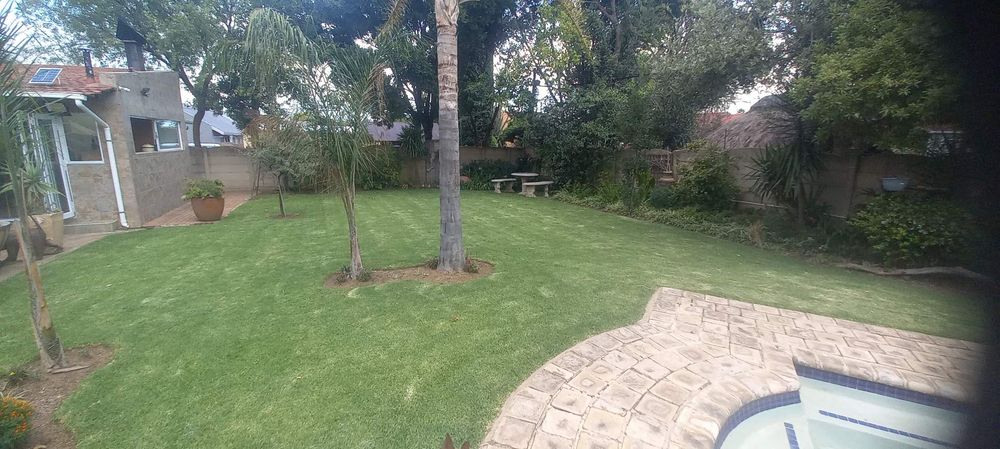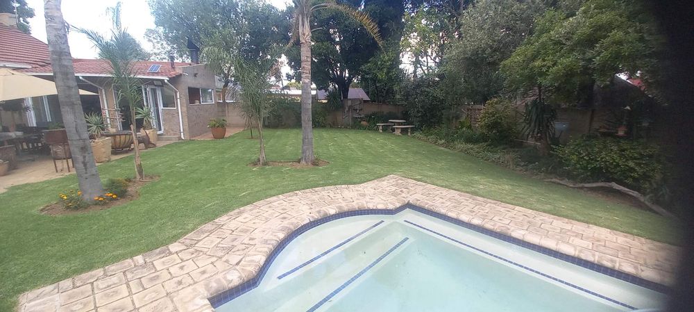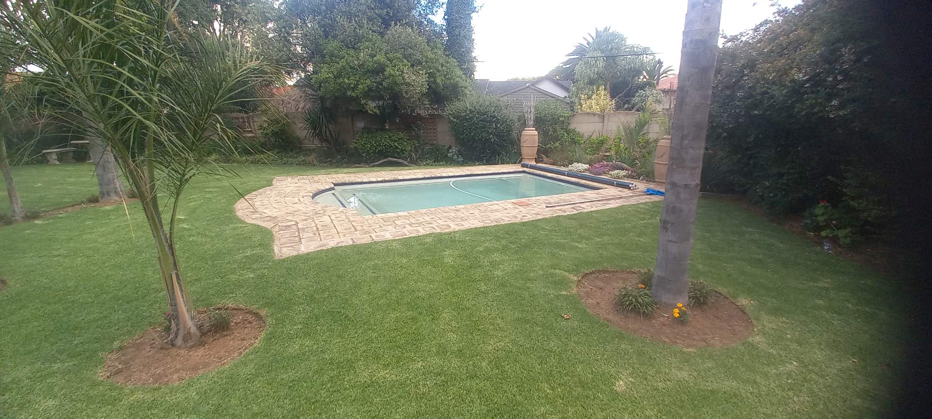 The entertainment area is gorgeous. It offers a built-in braai and a clay oven, perfect for a Sunday roast or a home made pizza. It is totally closed off and opens up to the garden with stacker doors. The garden is established with a sparkling pool.