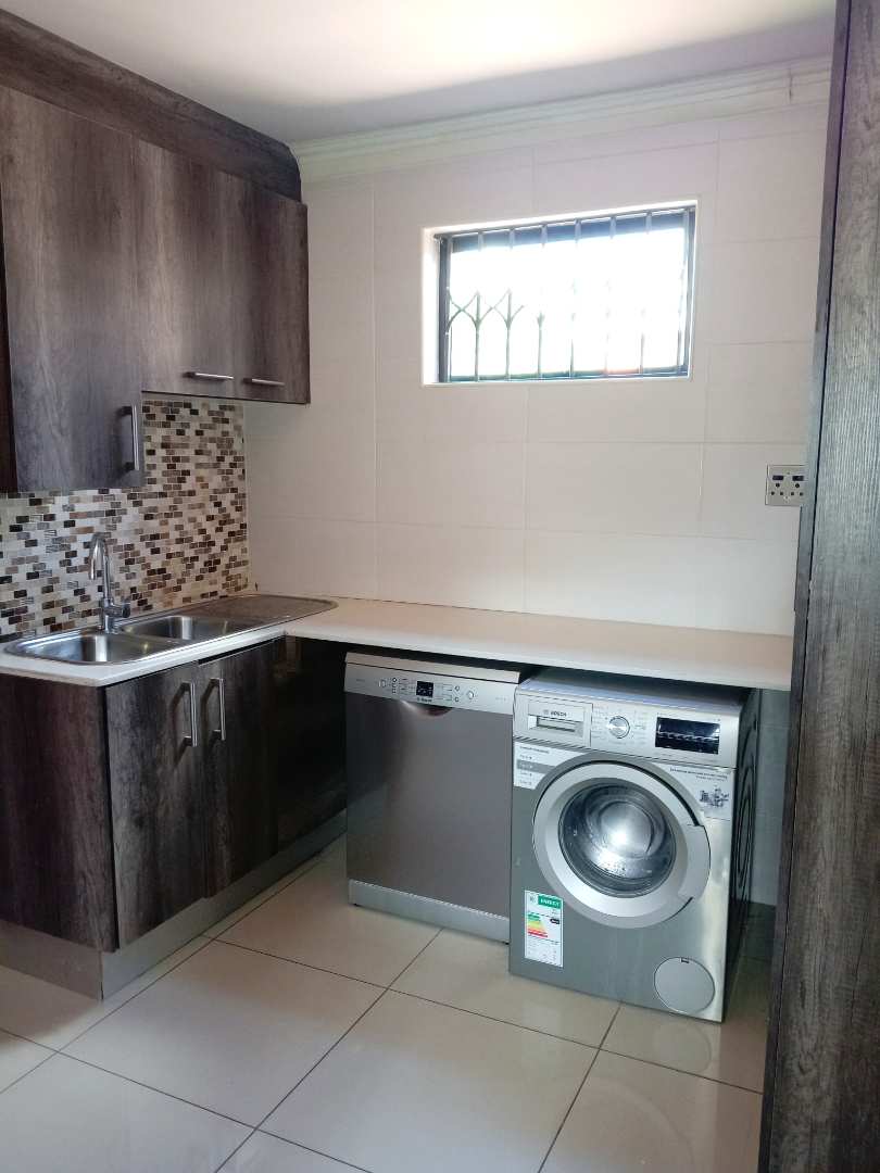 The spacious kitchen is a chef's delight, boasting granite countertops and a six-plate stove with both gas and electric options, along with an extractor fan. It also includes a single sink, space for a double-door fridge, built-in cupboards, a shelved pantry, and a convenient breakfast counter. Adjacent to the kitchen, the scullery offers a double sink, space for an electric appliance, a shelved pantry, and a door leading directly to the double garage.