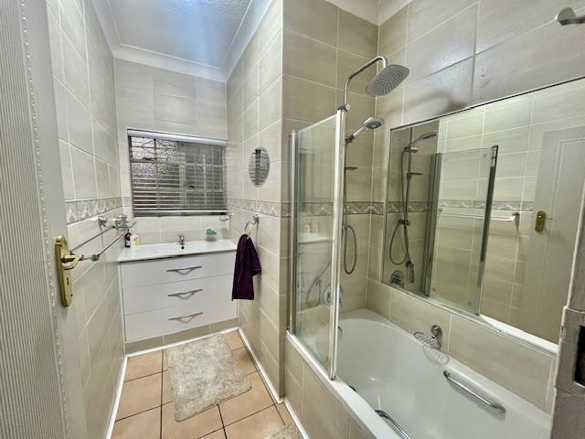 This home offers four generously-sized bedrooms, with three facing northeast. Each bedroom is equipped with ceiling fans, tiled floors, and built-in cupboards. The main bedroom stands out with its extra-large size and sliding door that opens onto the swimming pool area. It also includes a TV connection. Two bedrooms feature blinds, while the other two have curtain rails. The property includes two modern, newly renovated bathrooms. The ensuite bathroom is fully tiled with a bath, double vanity basin, separate shower, and toilet. The second bathroom features a vanity basin, bath with an overhead shower, and a separate guest toilet.