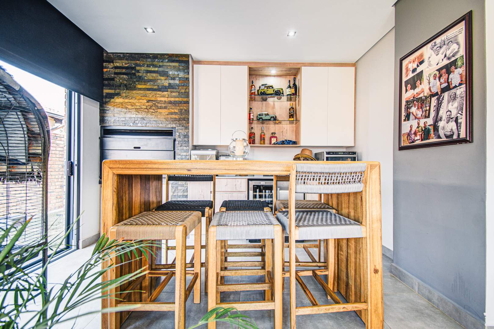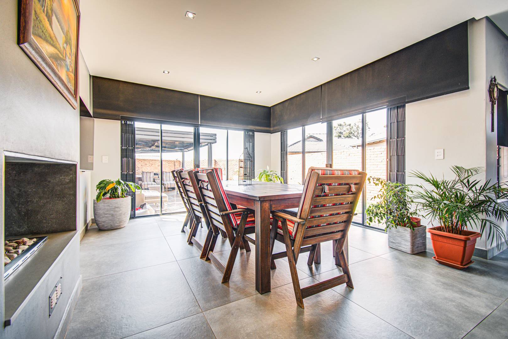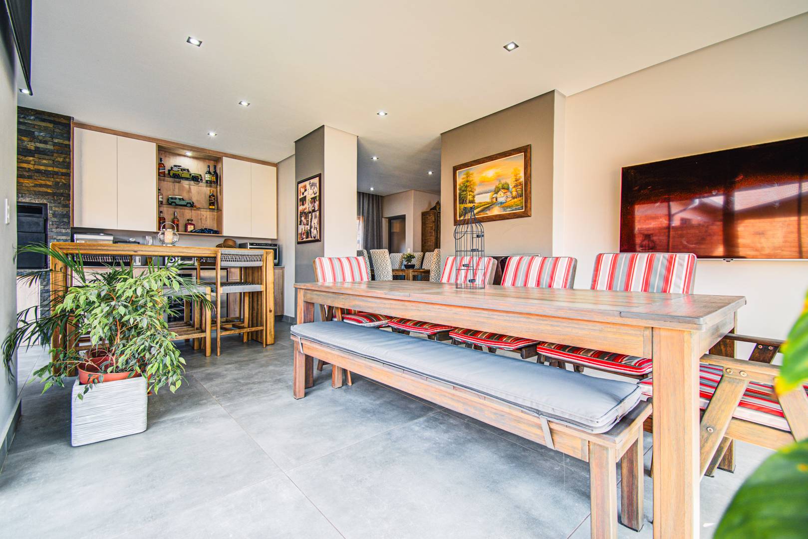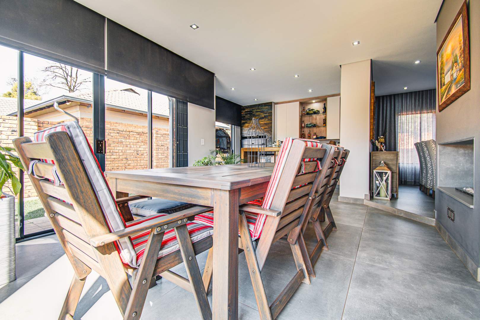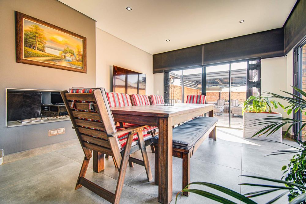 The awesome entertainment room has a built-in wet bar, a built-in braai as well as a bar counter. The room has space for an 8-seater table. There are sliding doors leading onto the outside entertainment area.