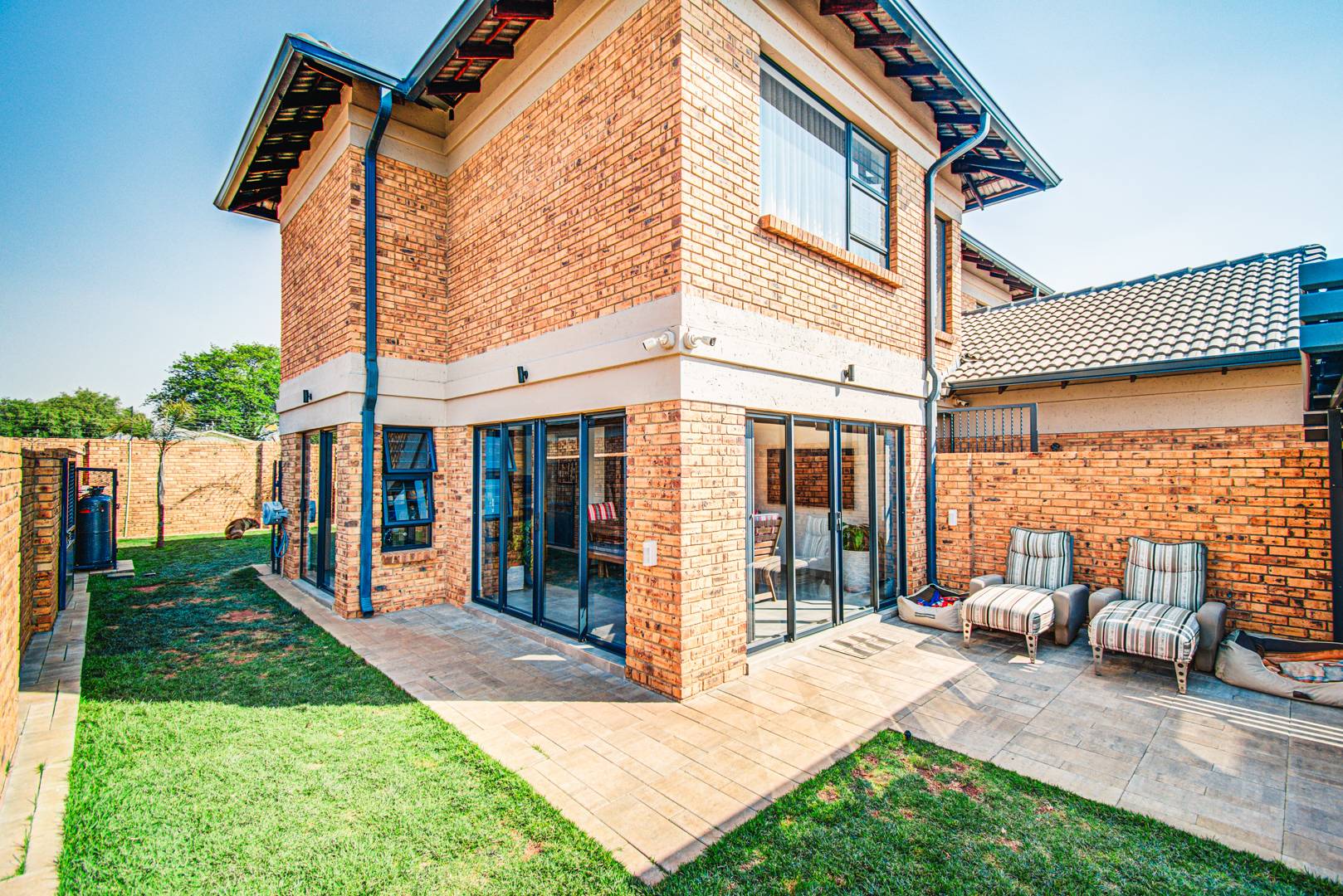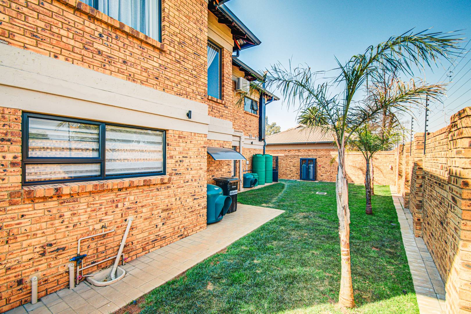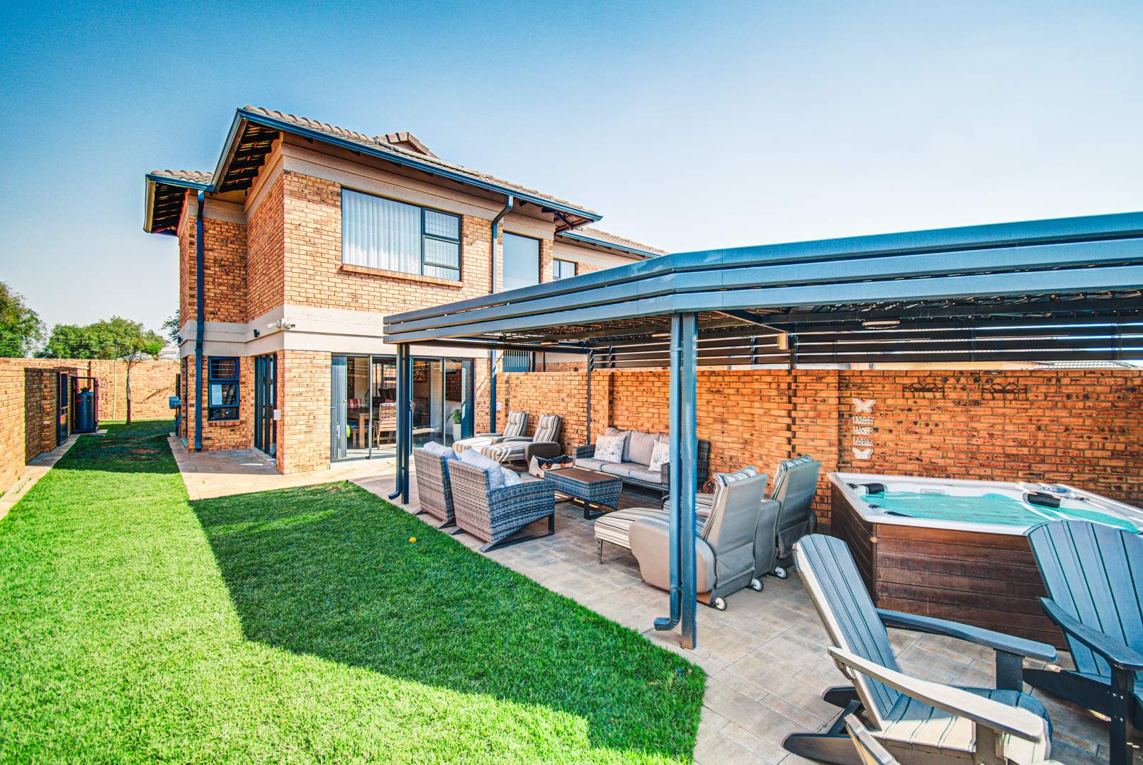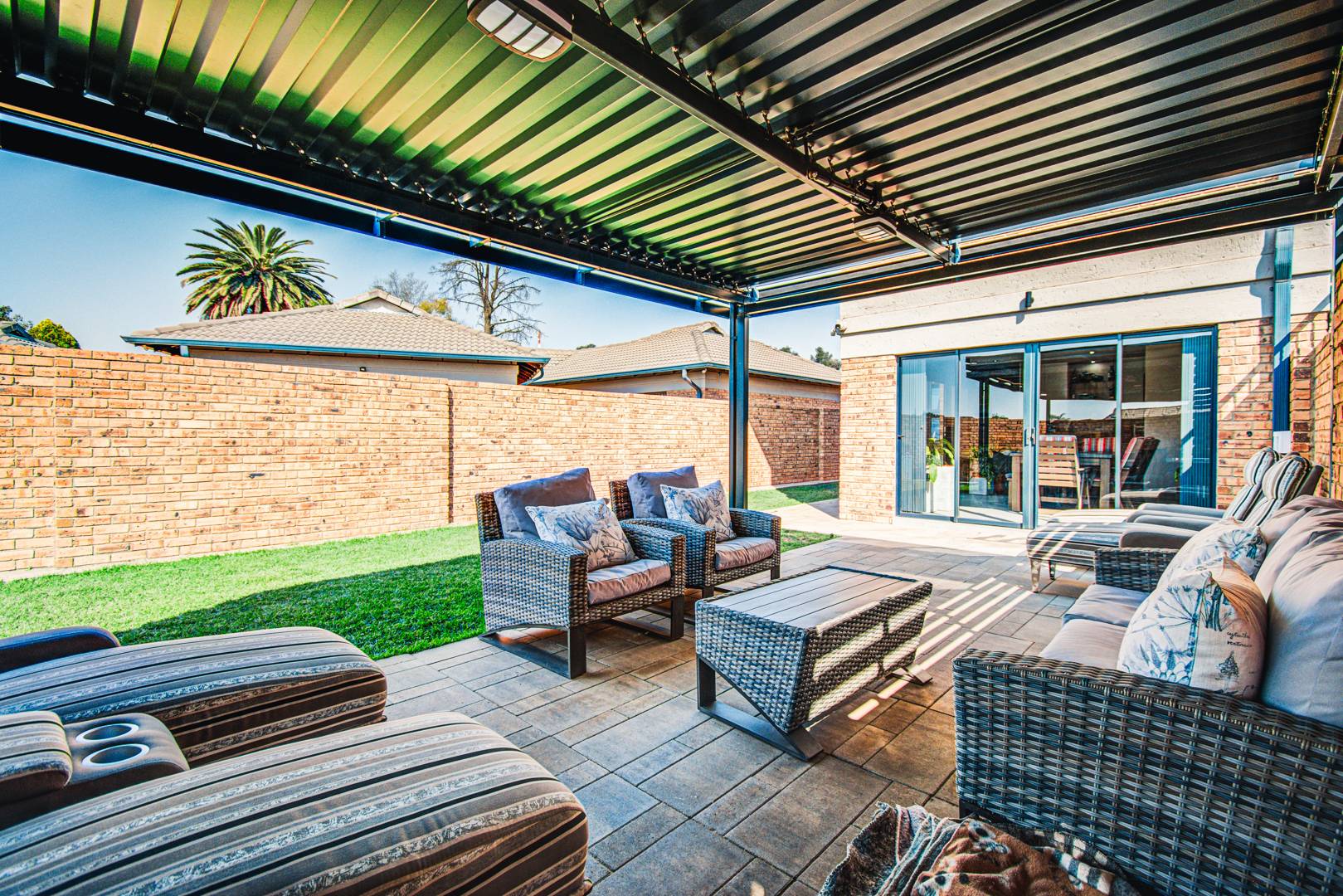 The outside entertainment area contains an automated louvre lapa. The lapa is automated using the Rain Bird system which will automatically close the louvre when it rains. The area is partly paved. This area is extremely secluded as there are no double story units built in close proximity.