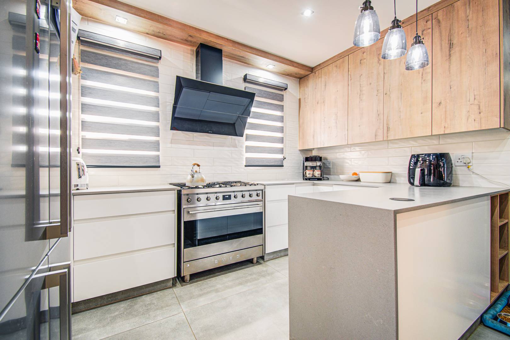 The kitchen has a Smeg electric oven and a 6-plate gas hob. There is a built-in Smeg microwave/grill oven. There is a separate scullery area which has space for 3 machines. There is space in the kitchen for a double door fridge.