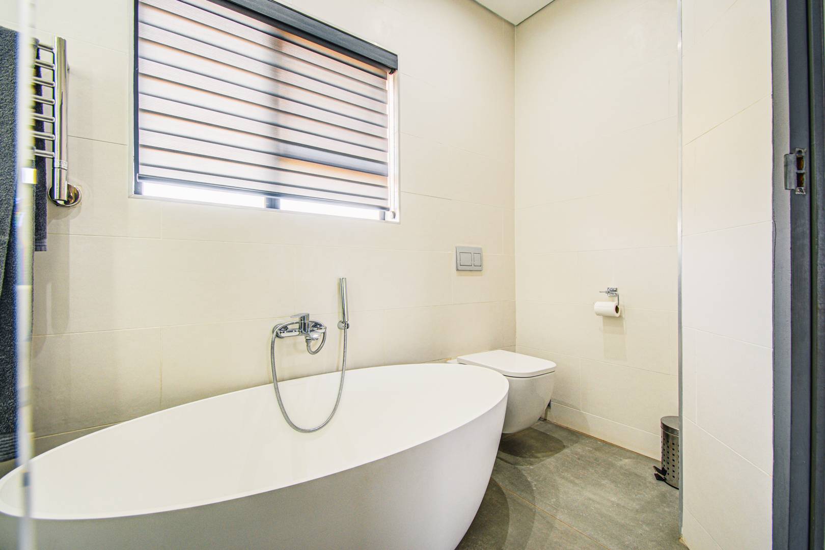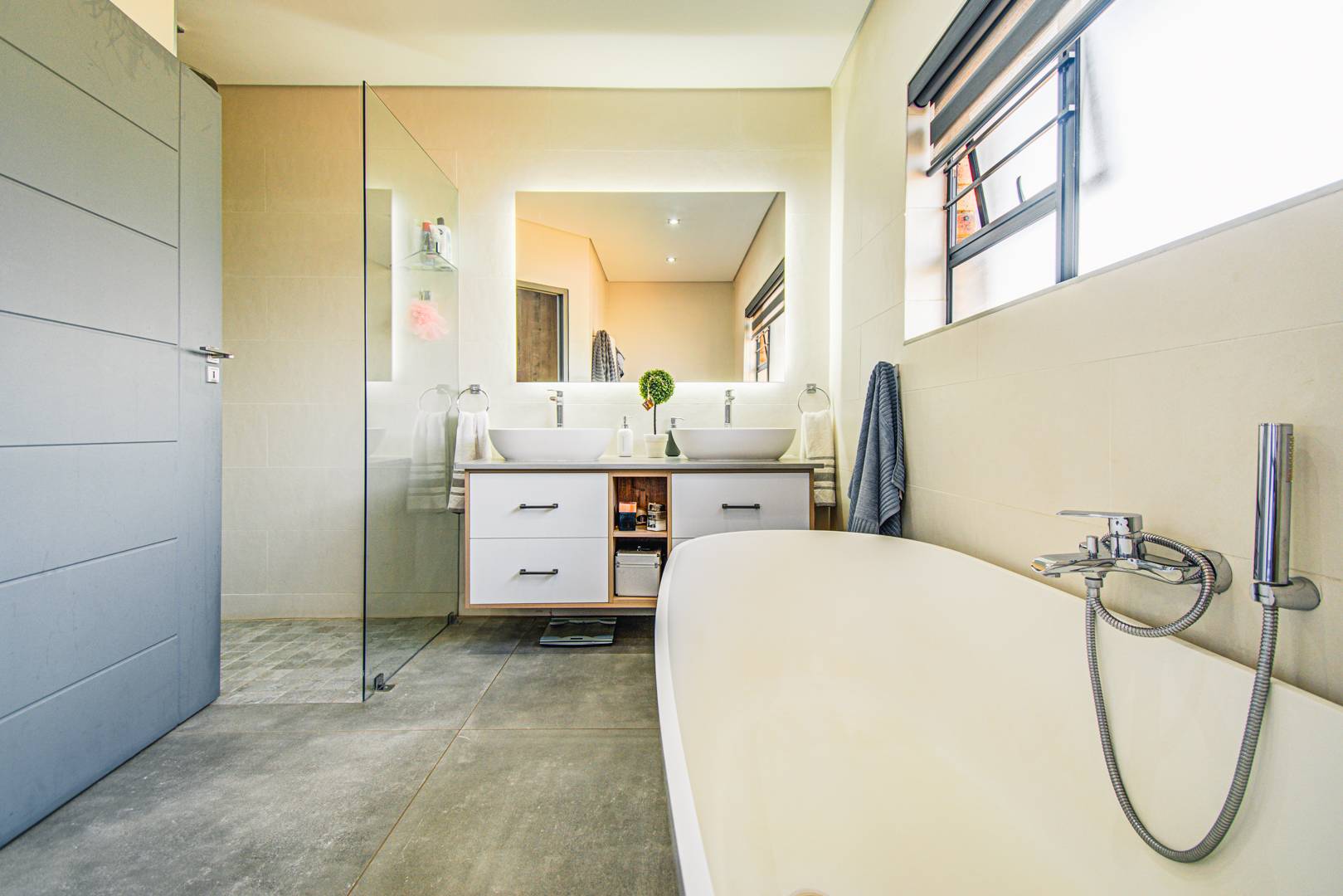 The main bedroom is en suite with a full bathroom, a walk-through dressing area and space for a king size bed. The bathroom has a large luxurious shower with an impressive oval free-standing bath and double basin. The curtains in the main bedroom are automated.