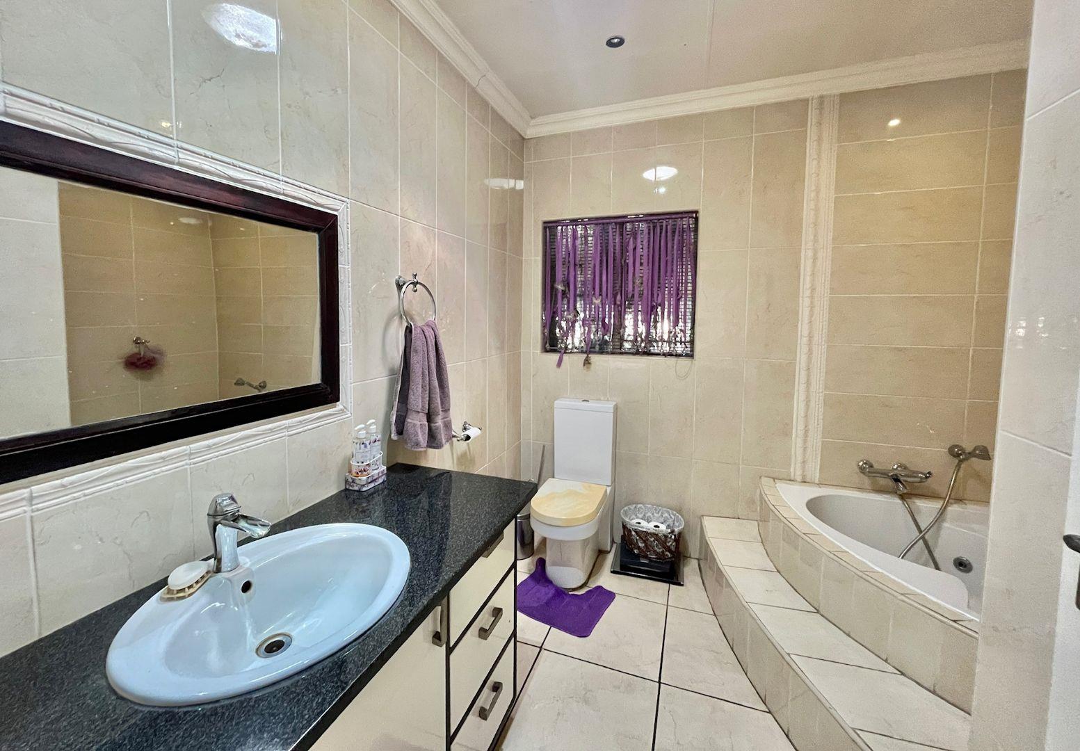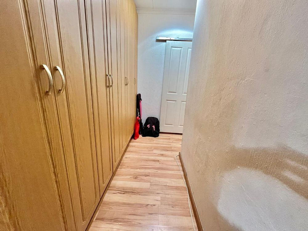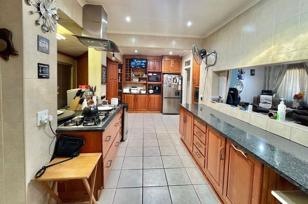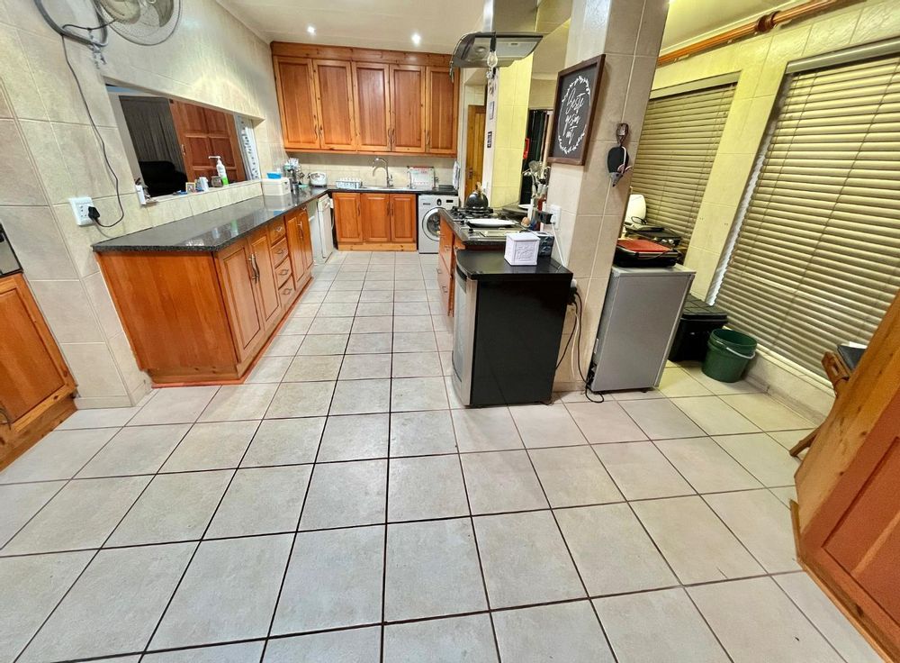The heart of the home is the spacious kitchen, which features tiled floors and walls, complemented by beautiful wooden cupboards. Home chefs will appreciate the 5-plate gas stove with an extractor fan, granite countertops, and a convenient dishwasher connecting point. A serving hatch opens to the lounge, making entertaining a breeze.