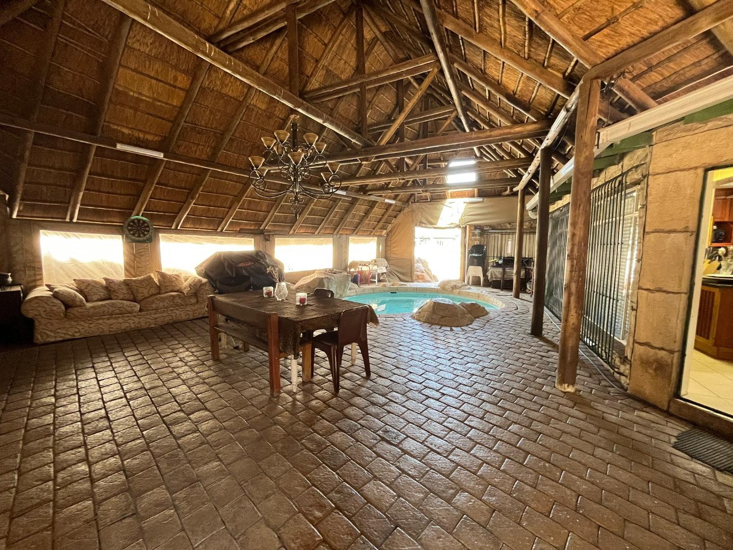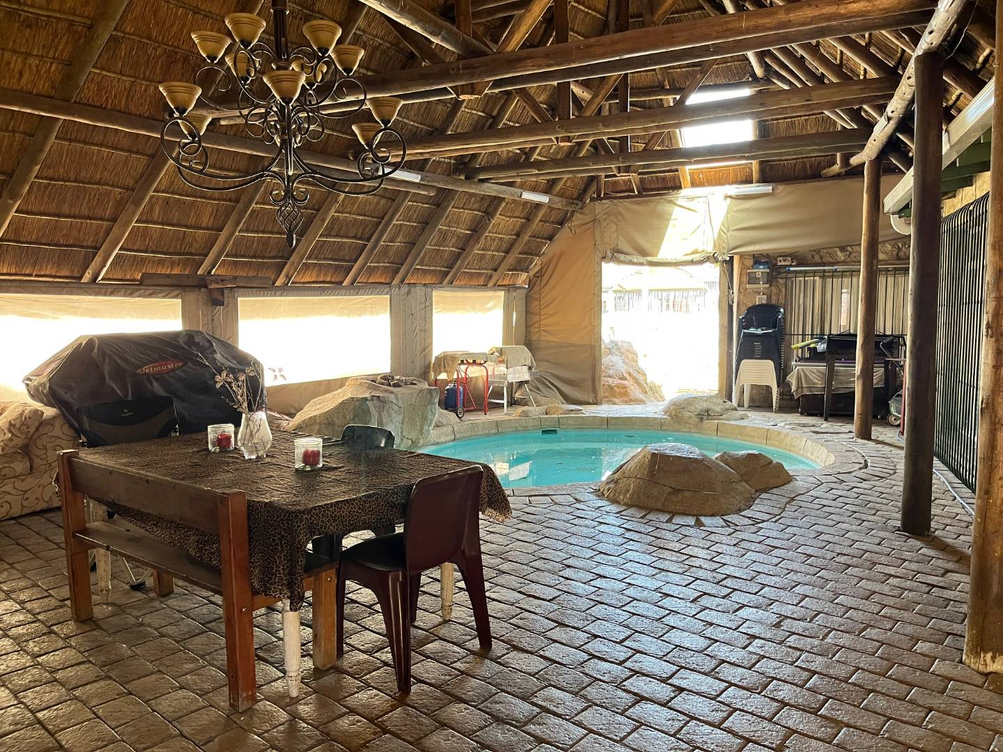 One of the standout features of this property is the magnificent, large thatch roof seamlessly connected to the house. Beneath this charming structure, you'll find a swimming pool, offering a delightful escape from the sun with its shaded protection. The pool area is equipped with canvas roll-up sides, allowing for versatile use in different weather conditions.