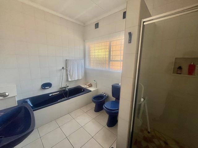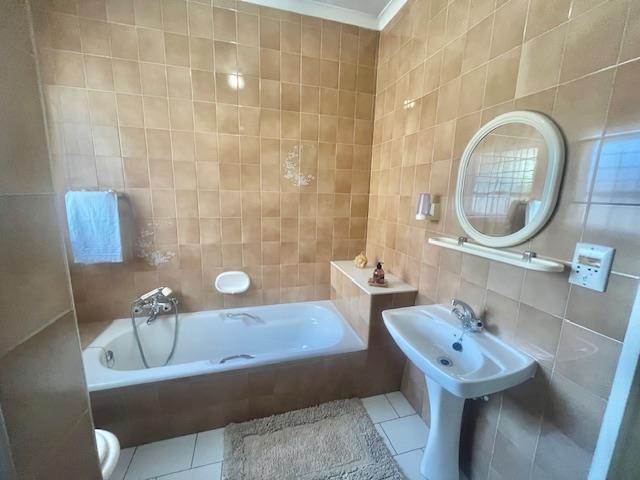 The property boasts two full bathrooms, thoughtfully designed for convenience. The spacious en-suite bathroom includes a shower, bath, basin, and toilet, all beautifully tiled to the ceiling. The second bathroom also offers a bath, shower, single vanity basin, and toilet, complemented by an additional guest toilet in the passage—all with tiled floors and walls for easy maintenance.