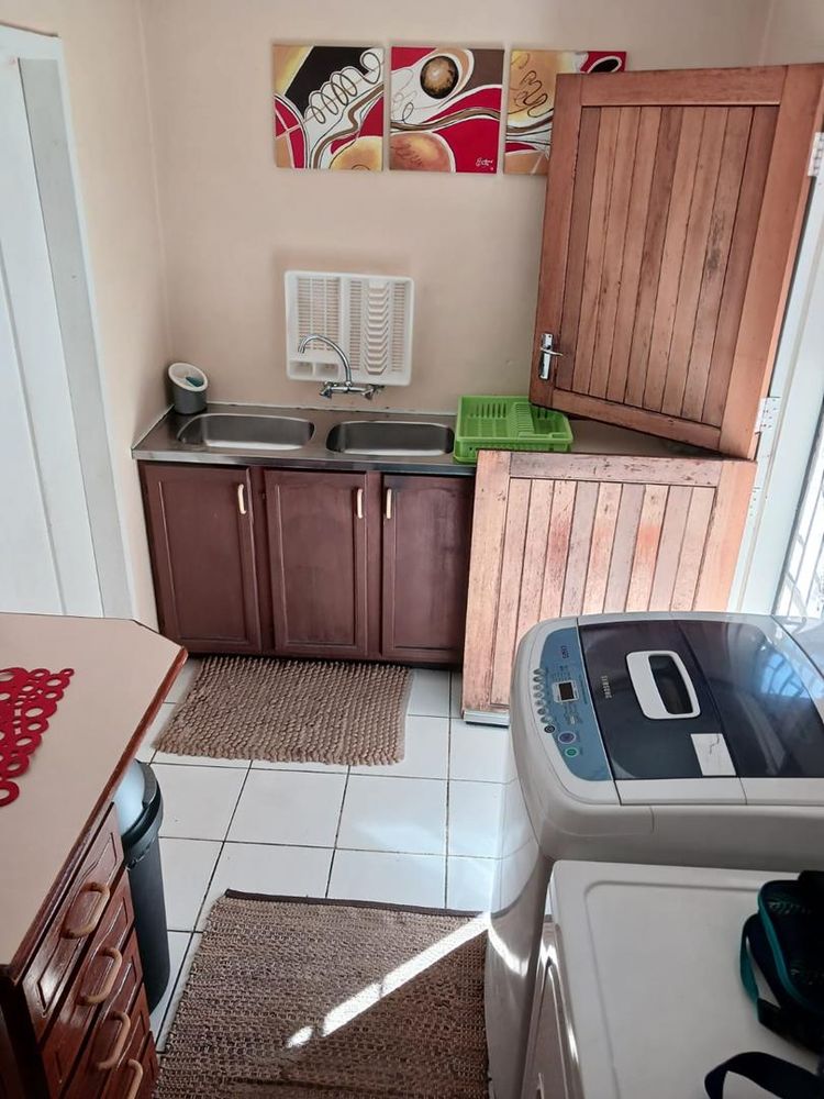 The well-appointed kitchen is equipped with wooden cabinets, a convenient breakfast counter, and a practical serving hatch. Cooking enthusiasts will appreciate the double eye-level oven for preparing delicious meals. For added convenience, there is a separate laundry/scullery area complete with a double sink.