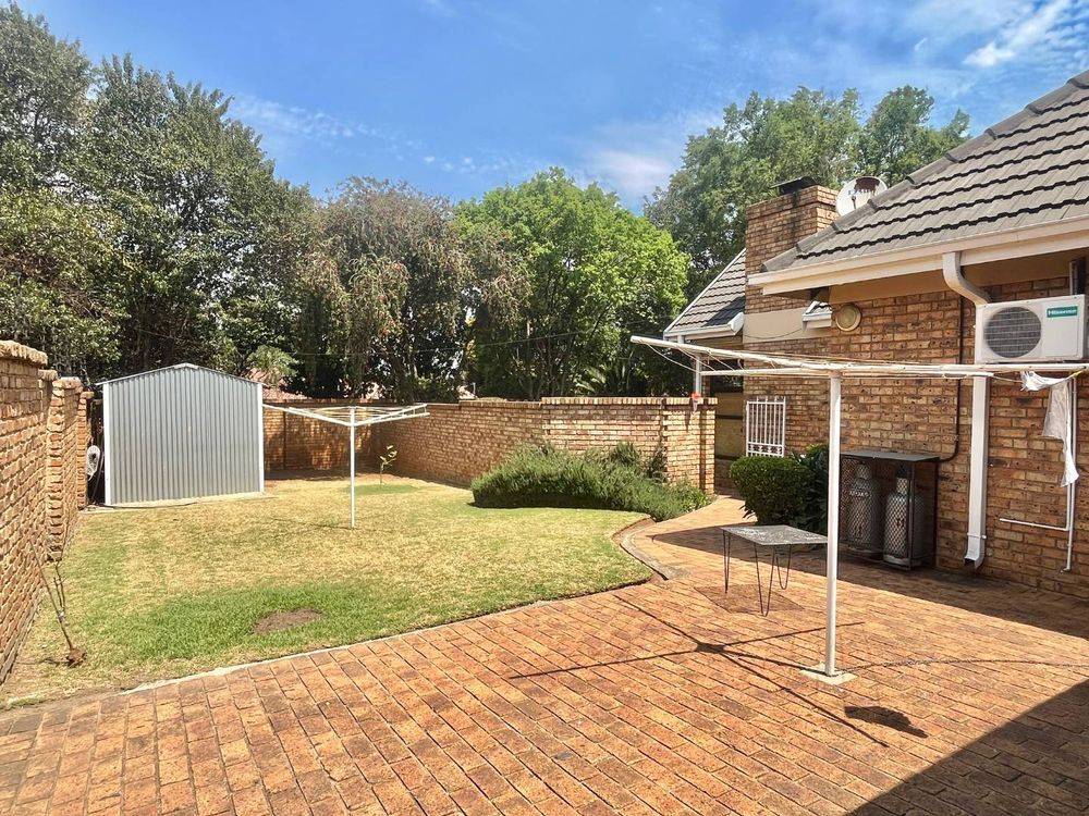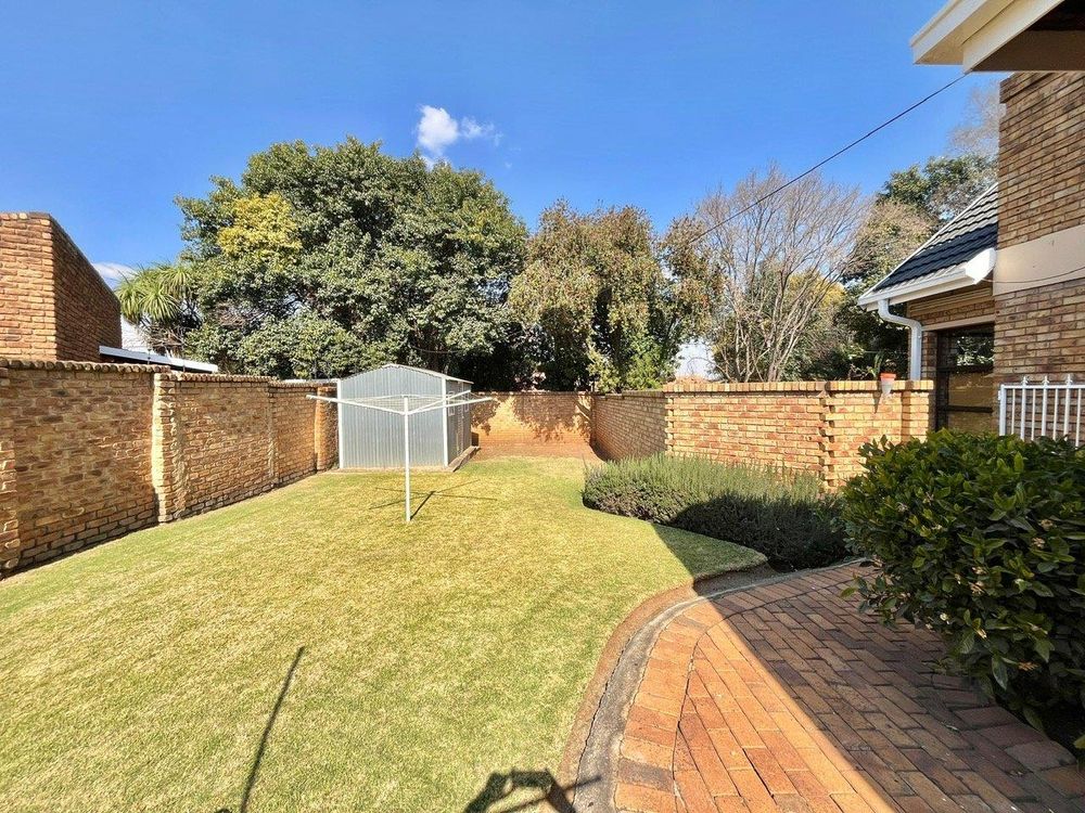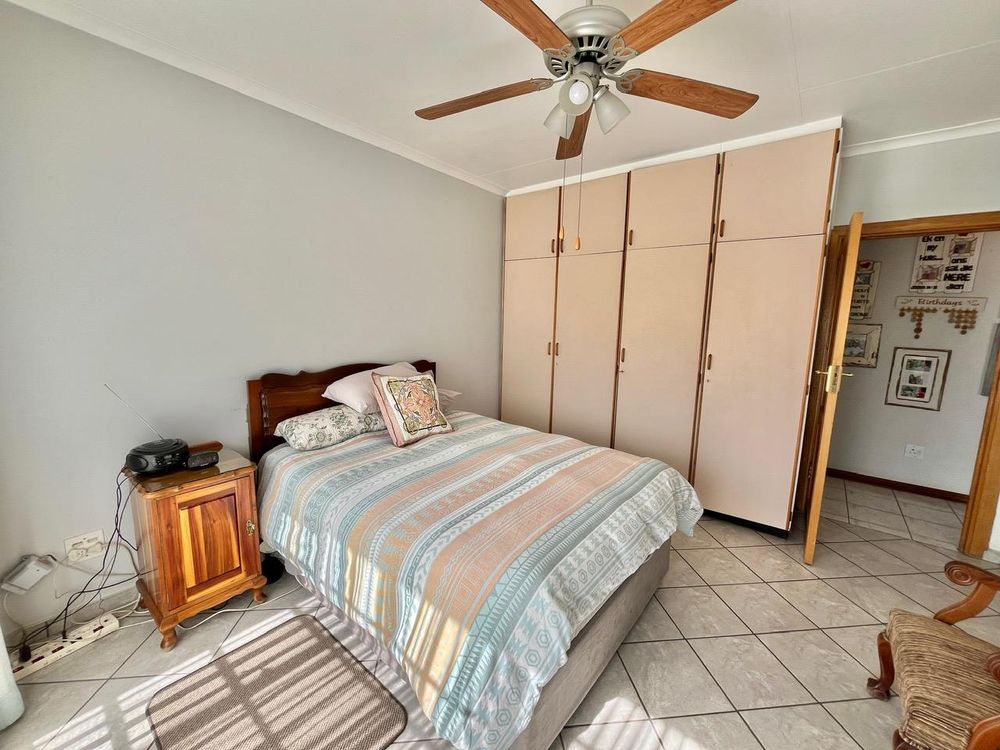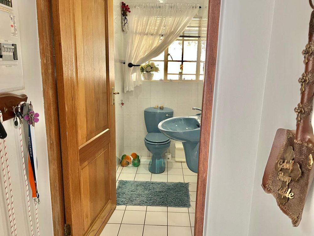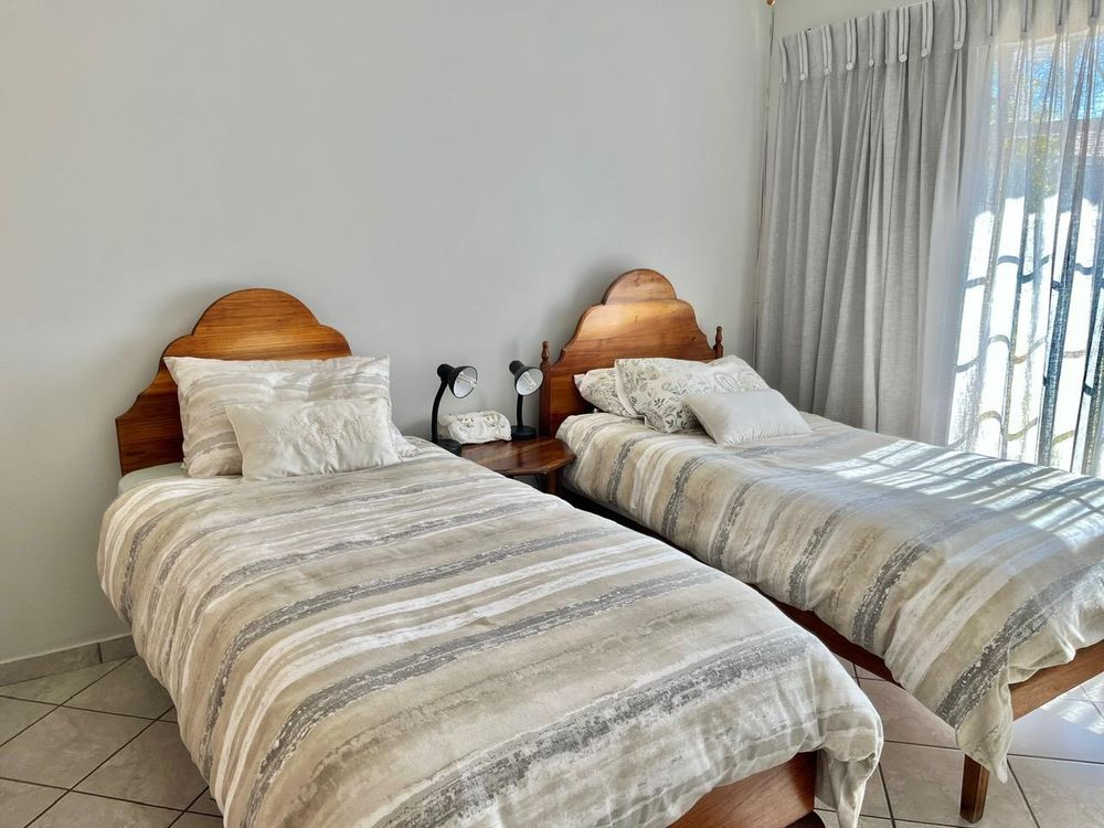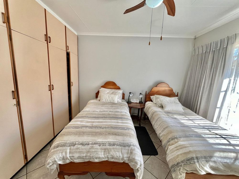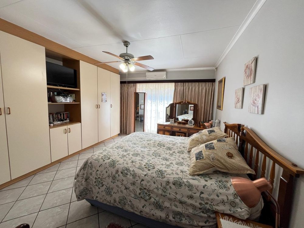 The home boasts four spacious and inviting bedrooms, each with tiled floors, built-in cupboards, and ceiling fans. Three of these sun-drenched bedrooms face north, filling the rooms with natural light. The master suite is a true sanctuary, complete with a glass door opening onto the garden, a TV connection point, walk-in cupboard, additional storage, curtain rails, and its own air conditioner.
