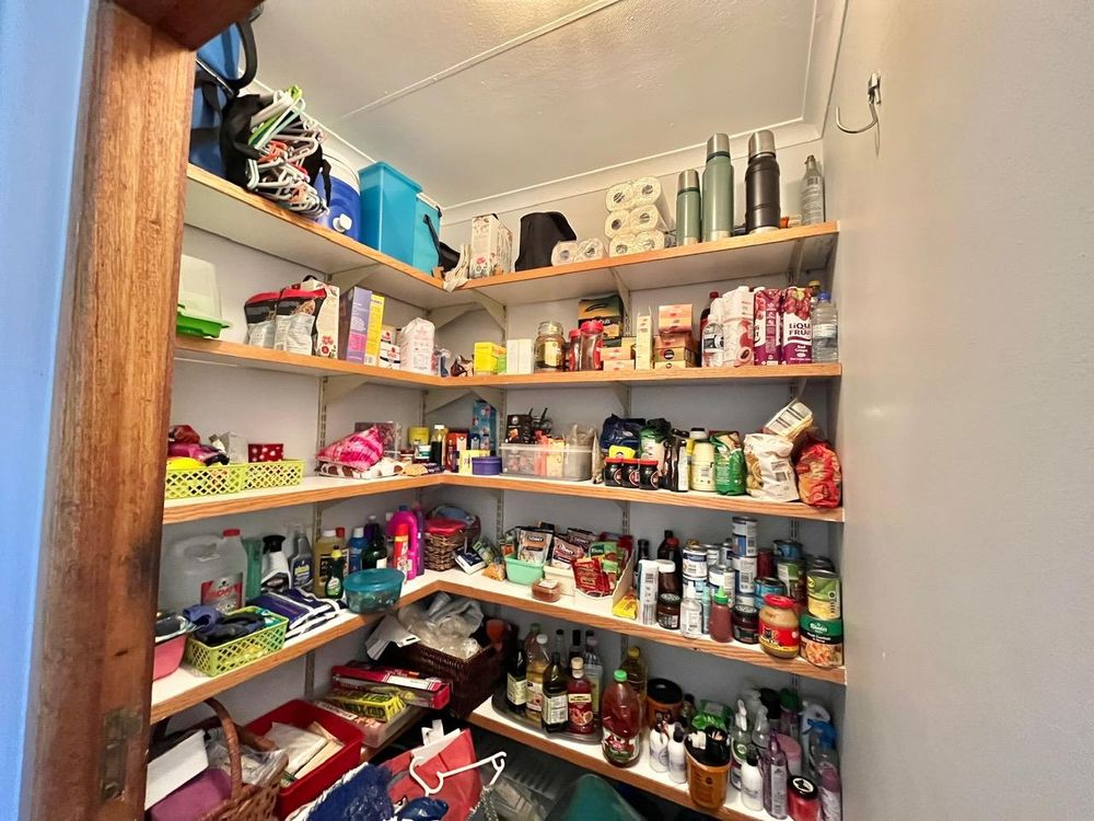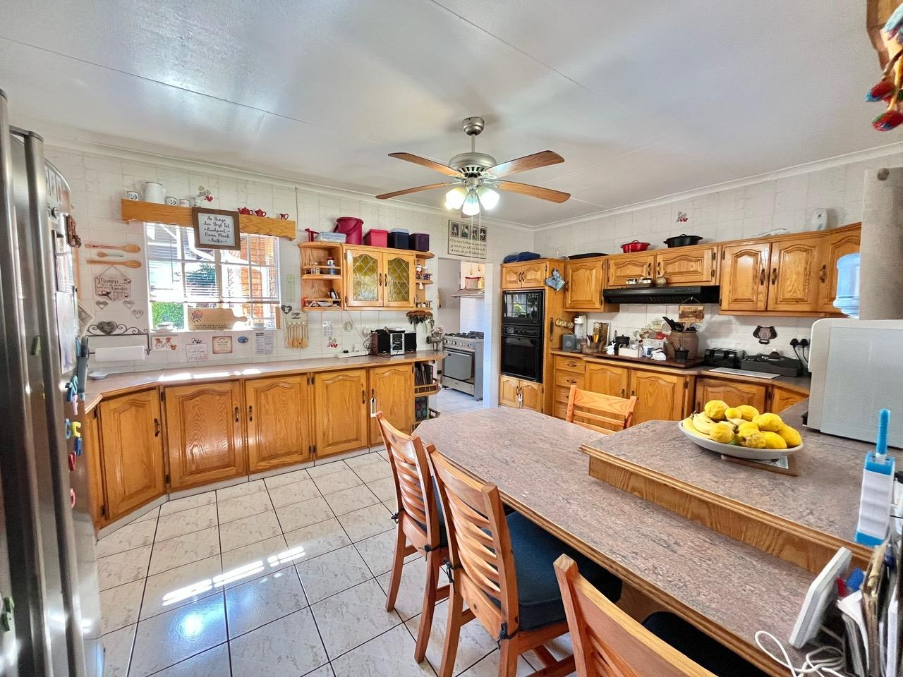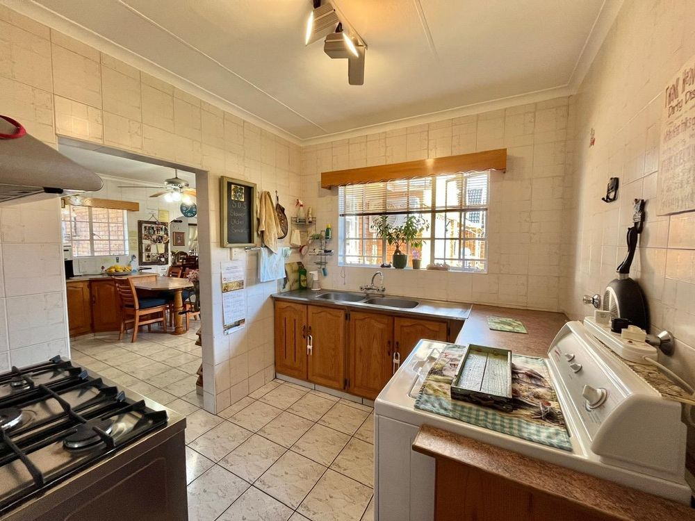 Culinary enthusiasts will adore the large kitchen, which comes equipped with wooden cupboards, a breakfast nook, melamine countertops, and tiled floor and walls. It hosts a four-plate electric stove, a double eye-level oven, as well as a five-plate gas stove with a gas oven. For added convenience, the separate scullery offers connection points for a dishwasher and washing machine, a double basin, and a walk-in pantry with ample shelving.