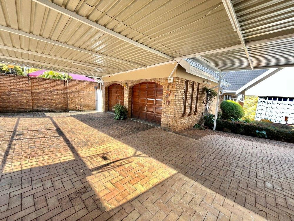 Automobile storage is no concern with an extra-deep double garage featuring motorized roll-up wooden doors and additional shelving for storage. The IBR carport accommodates up to four cars or even a caravan, with easy drive-through access via dual gates and brick paving throughout the area.
