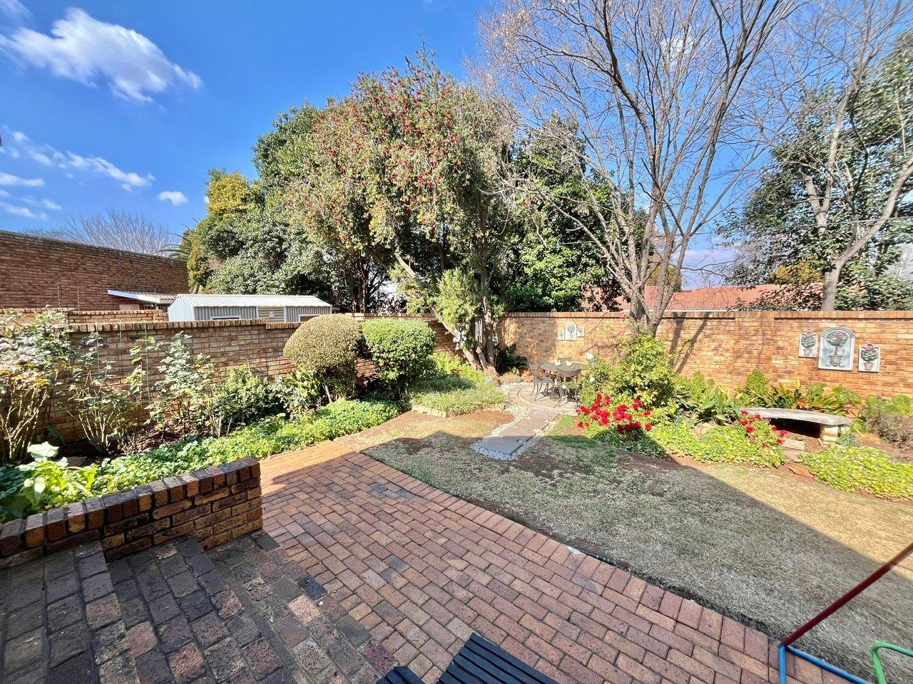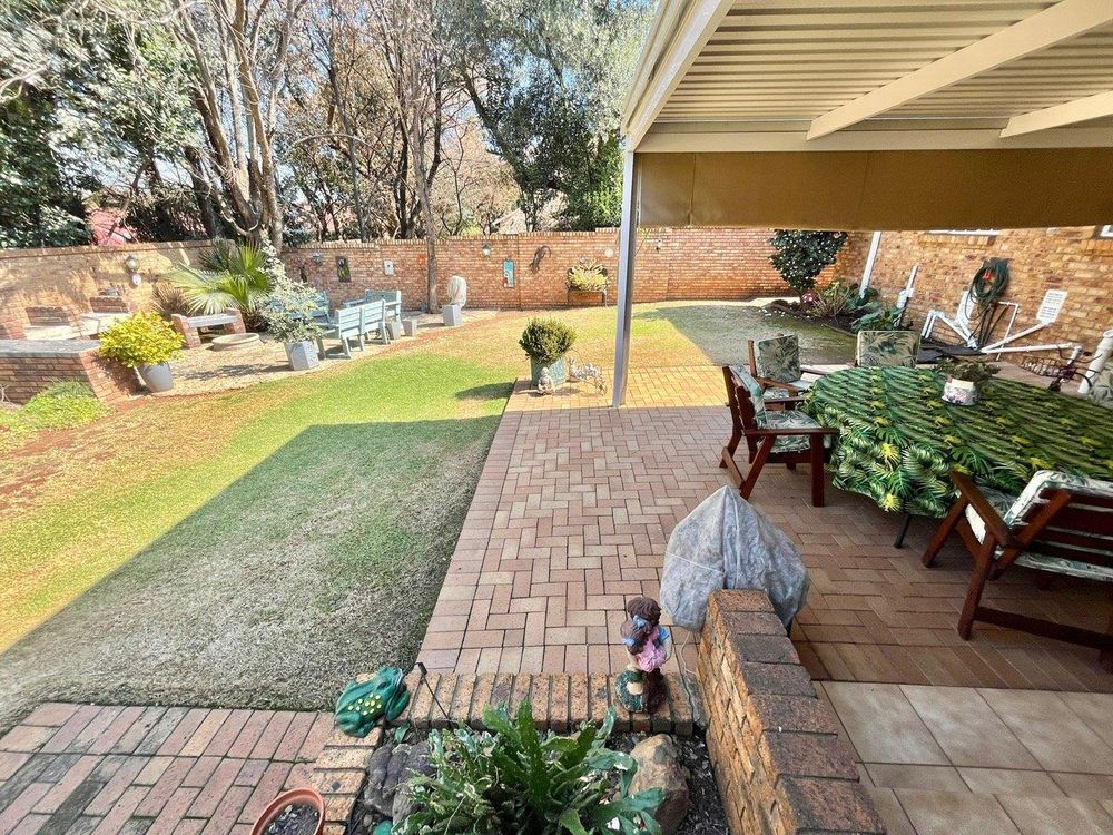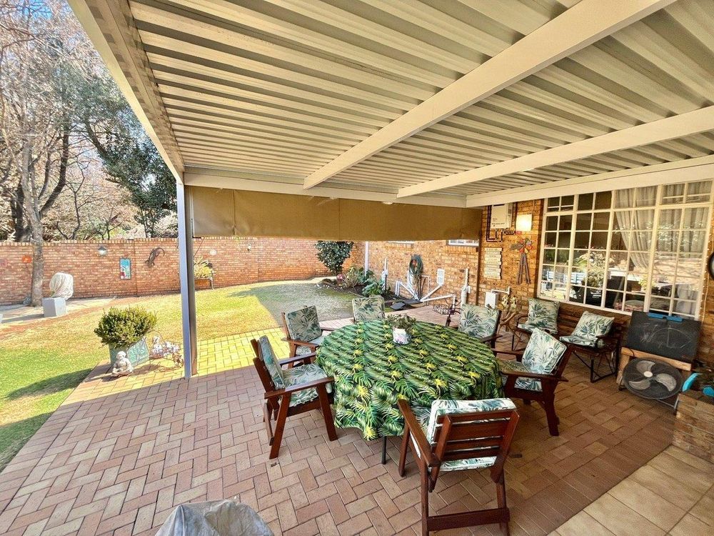 The beautifully landscaped private garden is an oasis of relaxation, featuring a boma and a covered patio with canvas sides. A built-in braai and sliding door open onto the back garden, perfect for outdoor entertaining.
