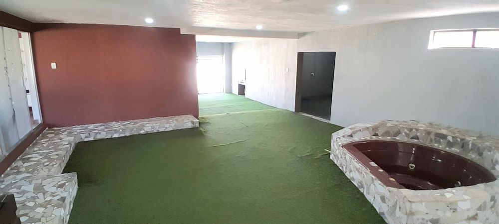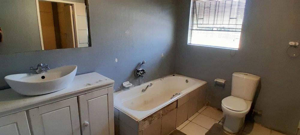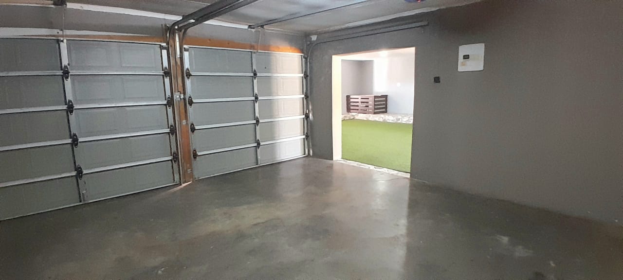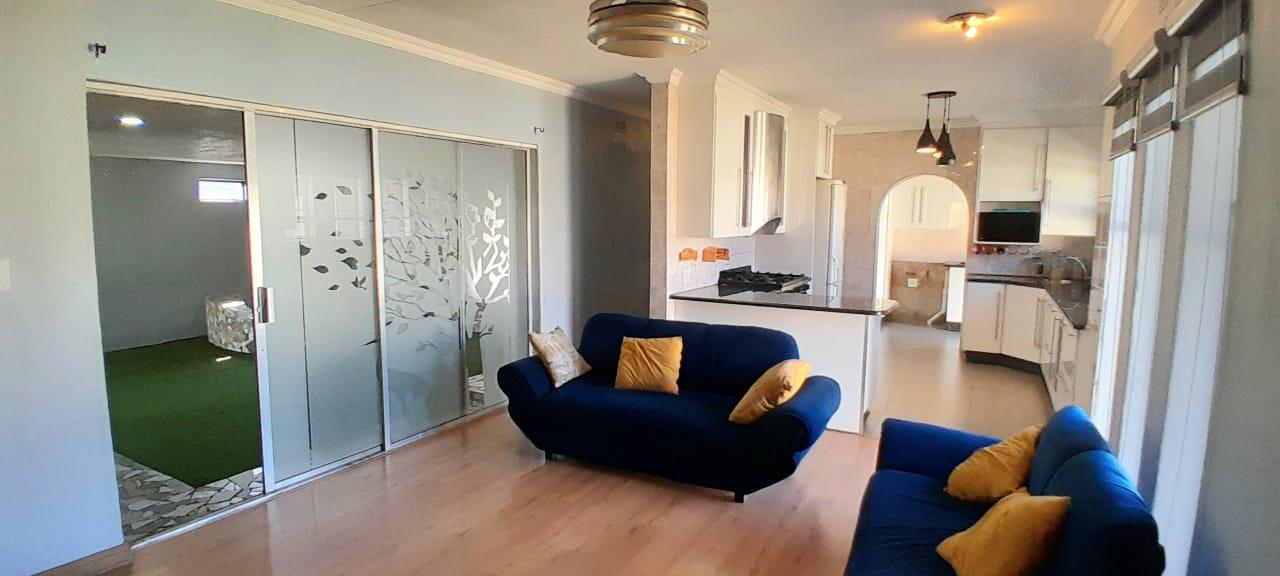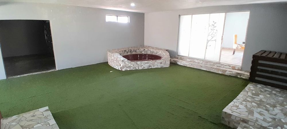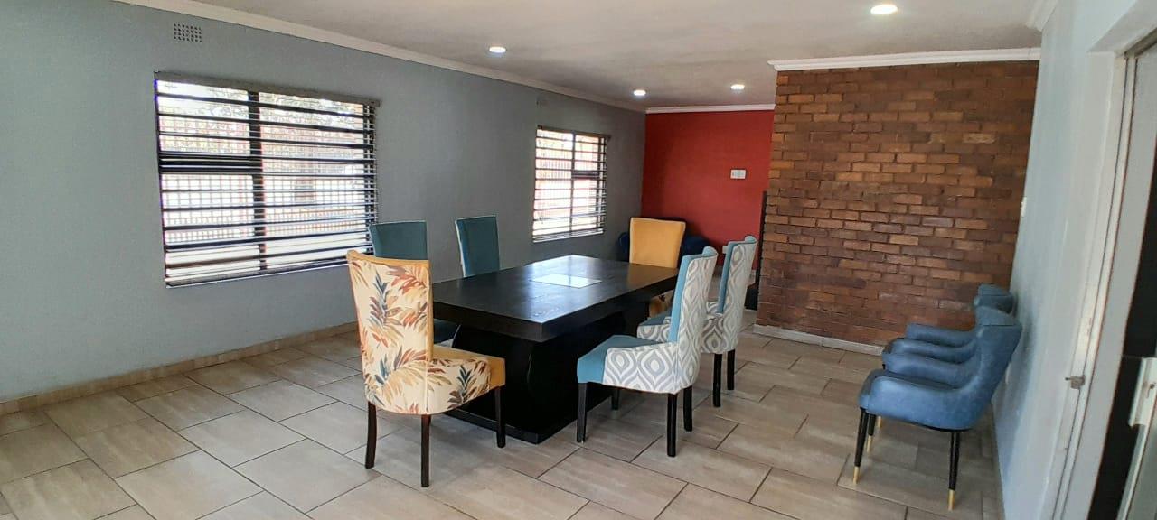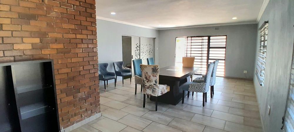The spacious open-plan living area seamlessly combines with the dining room, creating a welcoming atmosphere for family and friends. The sliding door opens to an expansive entertainment room, complete with a braai area and a relaxing jacuzzi, perfect for hosting gatherings.