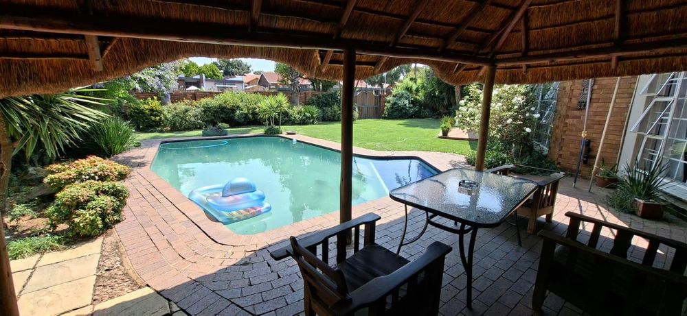 This home comes with a spacious kitchen featuring an island with a cozy breakfast nook, granite countertops, wrapped doors, and ample cupboard space. The kitchen connects to the open-plan dining area and bar, which extend to a covered outdoor entertainment area overlooking a sparkling pool and lush garden.