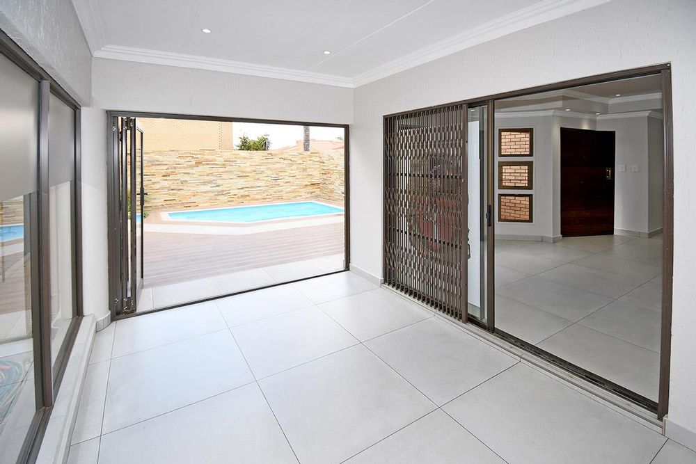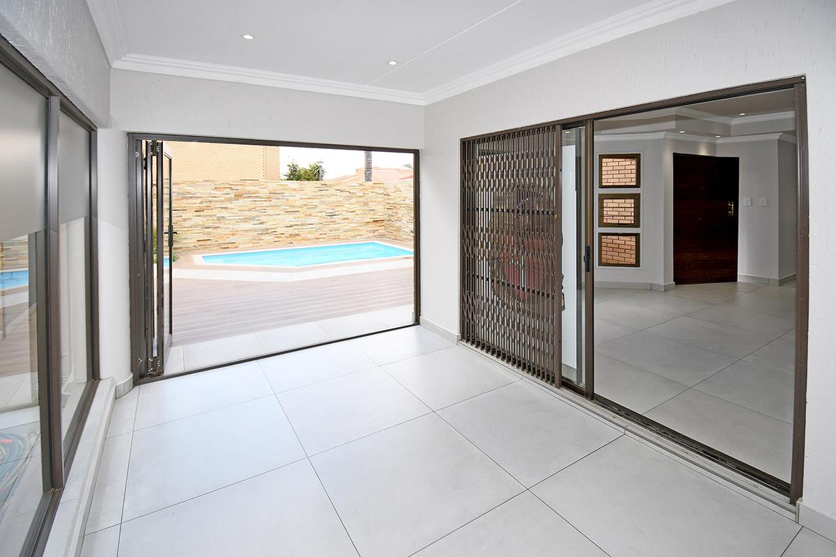 The patio is closed off with stacking doors, and leads to a low maintenance garden, with cool blue dazzling pool. It offers 3 garages, with one being drive through.