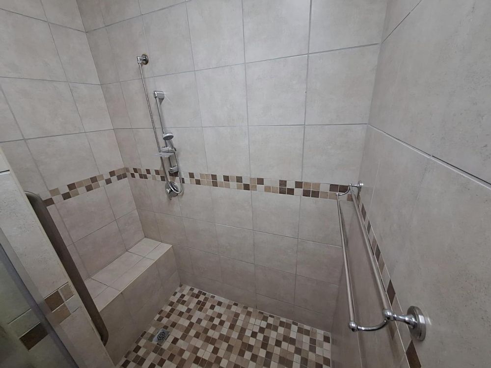 The spacious bedroom includes built-in cupboards and soft carpeting, while the modern bathroom offers a glass-enclosed shower with built-in seating and accessibility features. Sliding doors open onto a private, tiled balcony fitted with security bars.