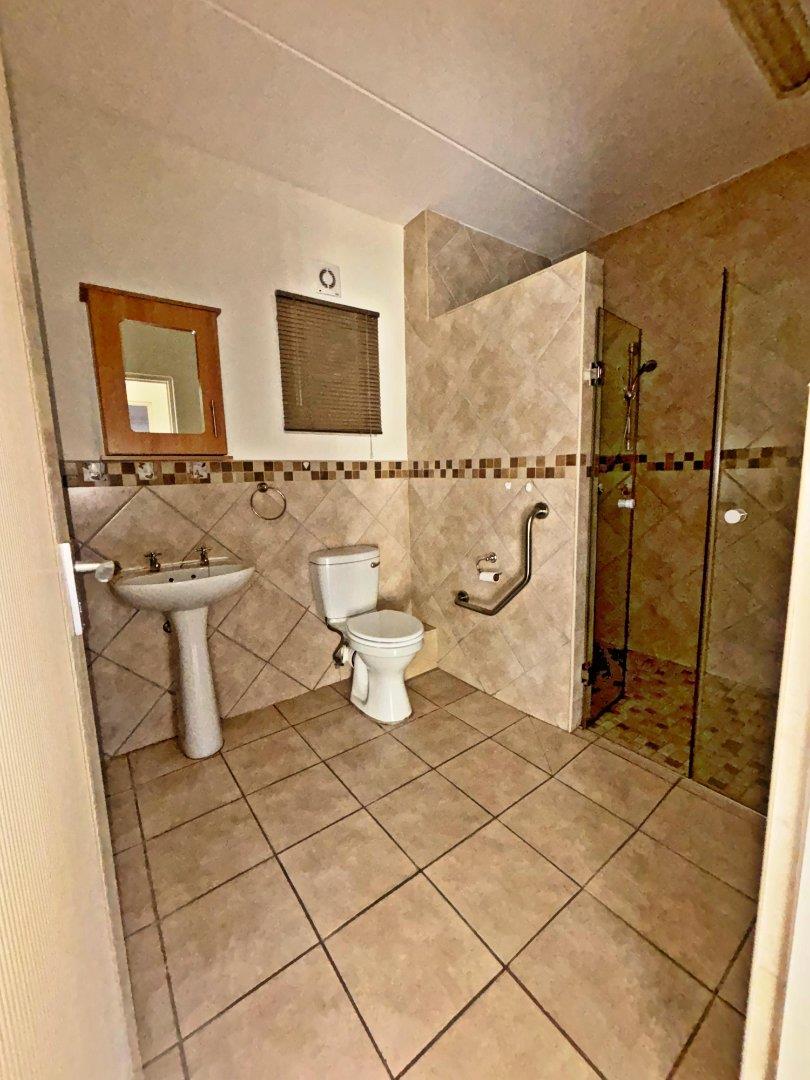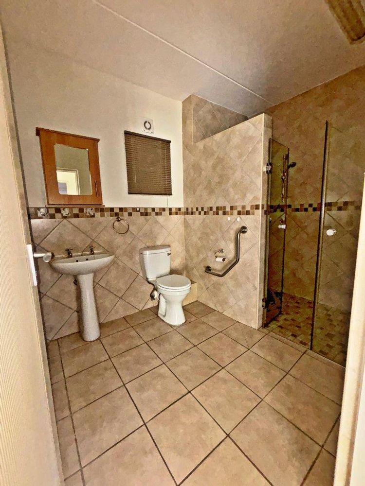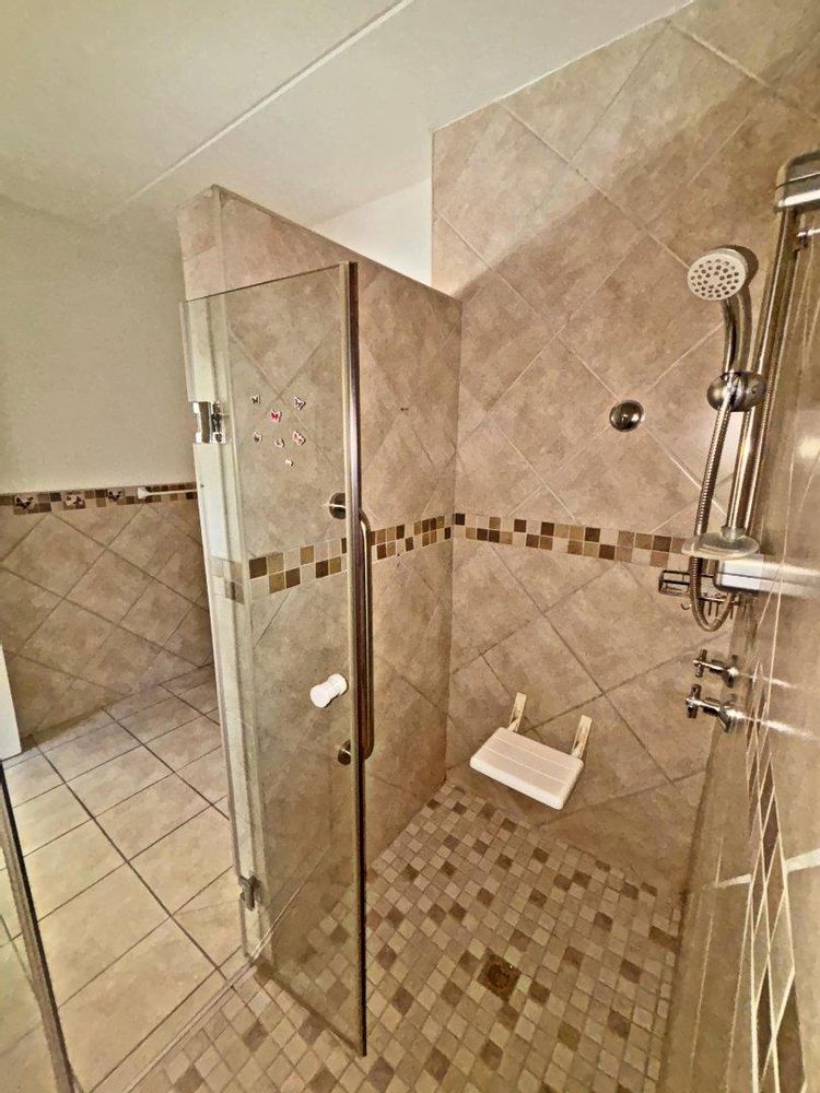 The modern bathroom exudes elegance with its exquisite wall patterns that evoke a golden touch of luxury. It includes a large shower with convenient railings and a seating area for ultimate relaxation. The toilet and sink are stylishly designed and equipped with safety railings for added support.