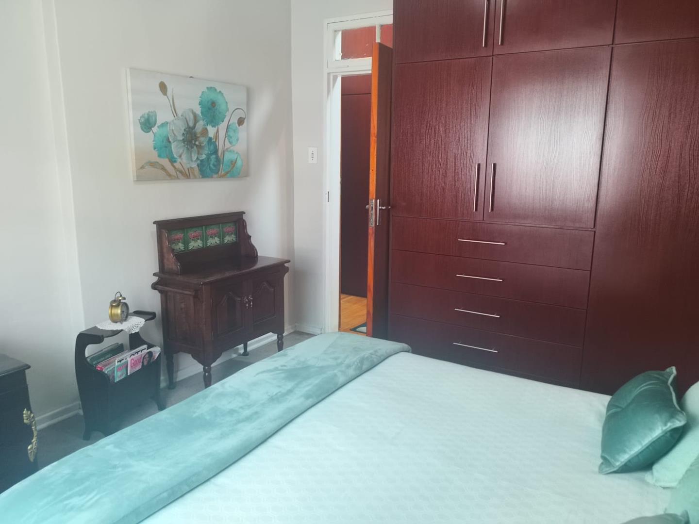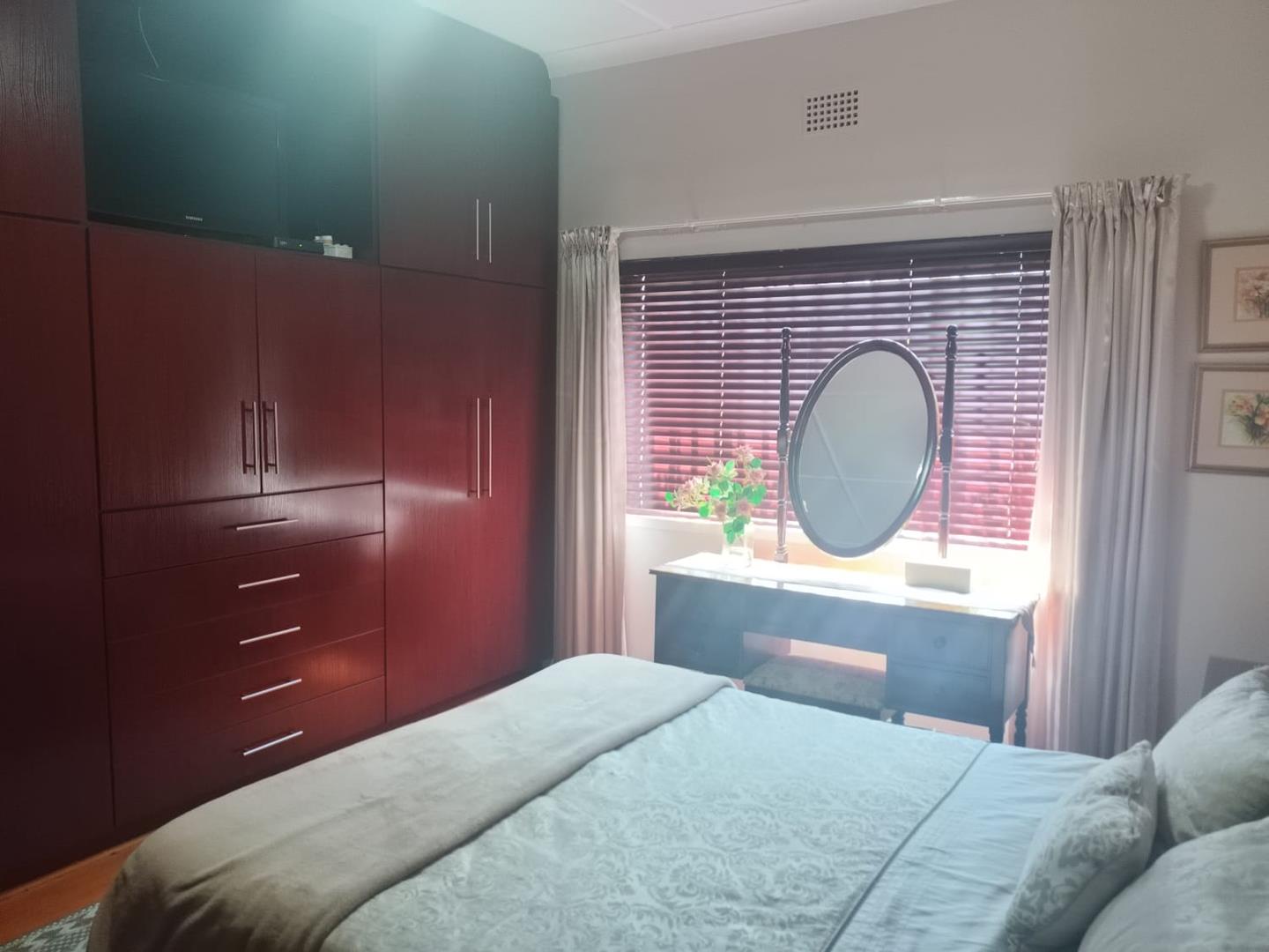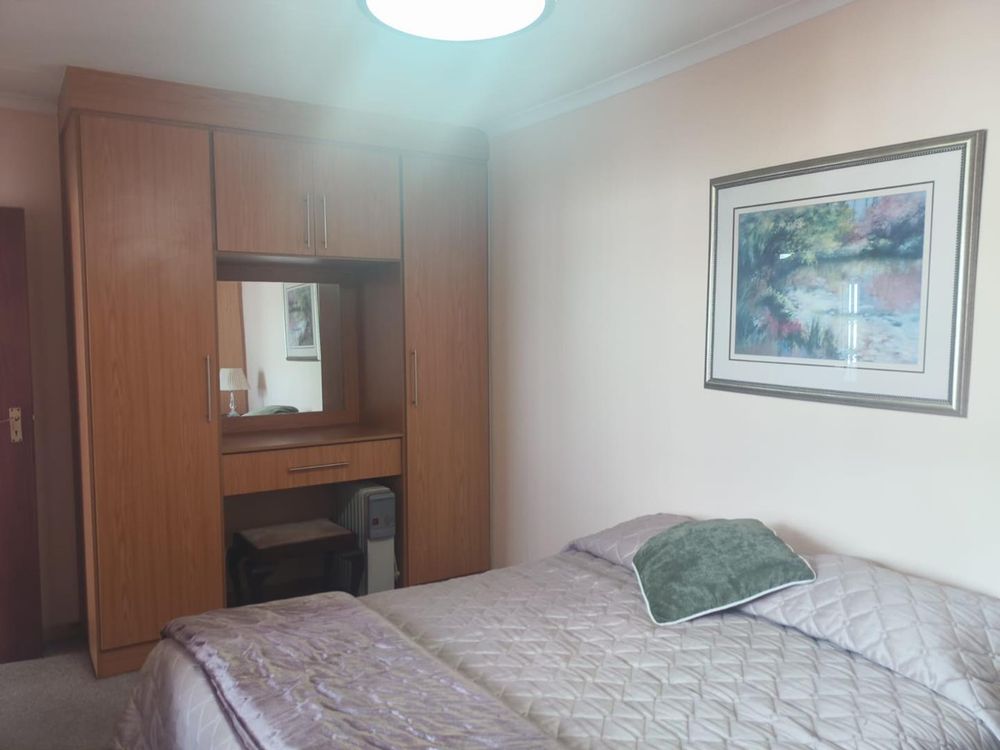 The open-plan kitchen in the flat offers abundant storage space, room for a single-door fridge/freezer, and an oven and stovetop. The flat includes a separate bedroom with generous cupboard space and a built-in dressing table with a mirror. The bathroom is equipped with a toilet, basin, and a wheelchair-accessible shower with a built-in seat. Like the main house, the flat is fitted with blinds and full Trellidor brand security.