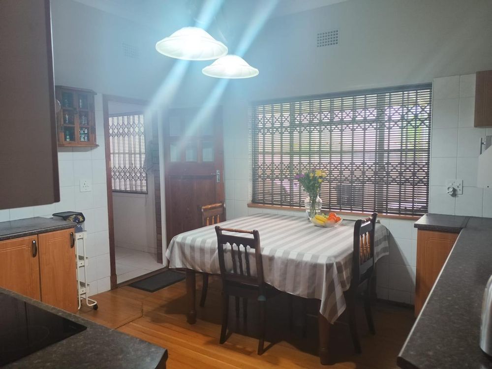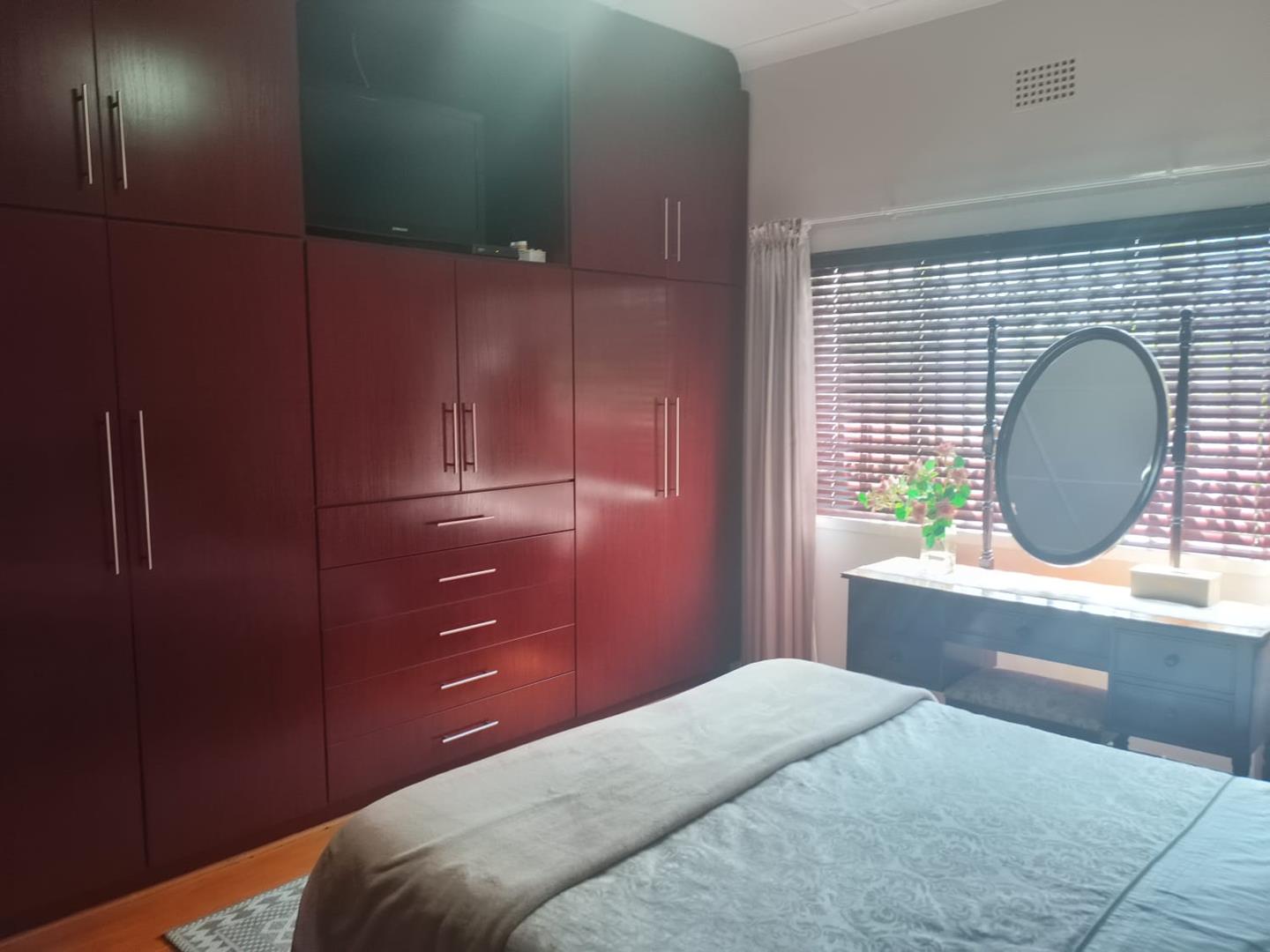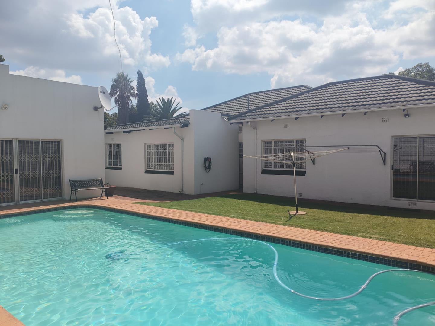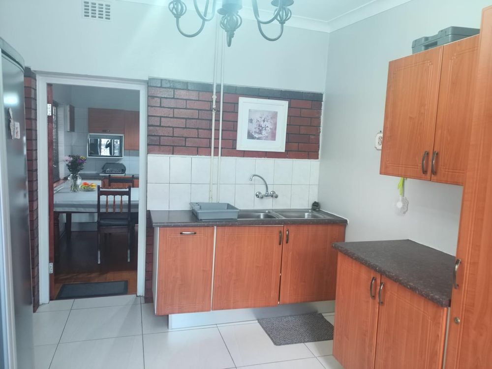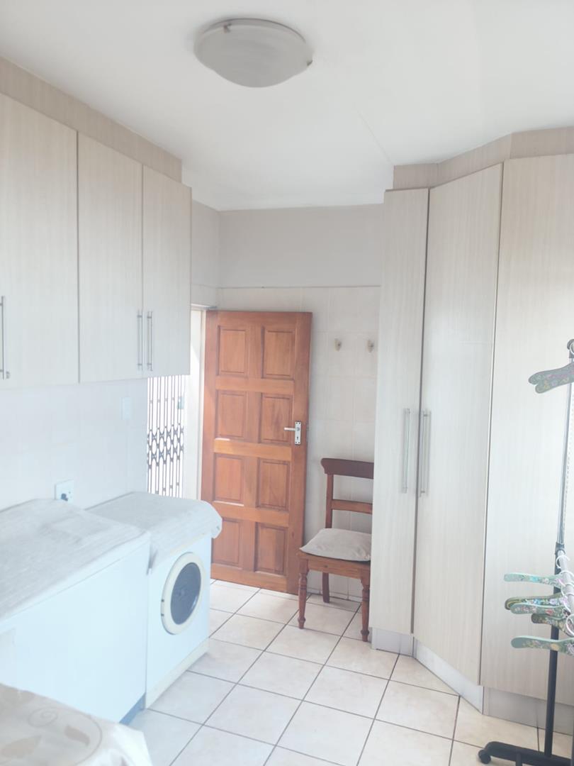 Bedroom 3 features a sliding door that opens to the backyard, offering a picturesque view of the swimming pool. The kitchen is thoughtfully designed with a breakfast nook and a large separate scullery, both boasting ample storage space. The scullery connects to a spacious laundry room with a double sink and additional cupboard space, ensuring functionality and ease of use.