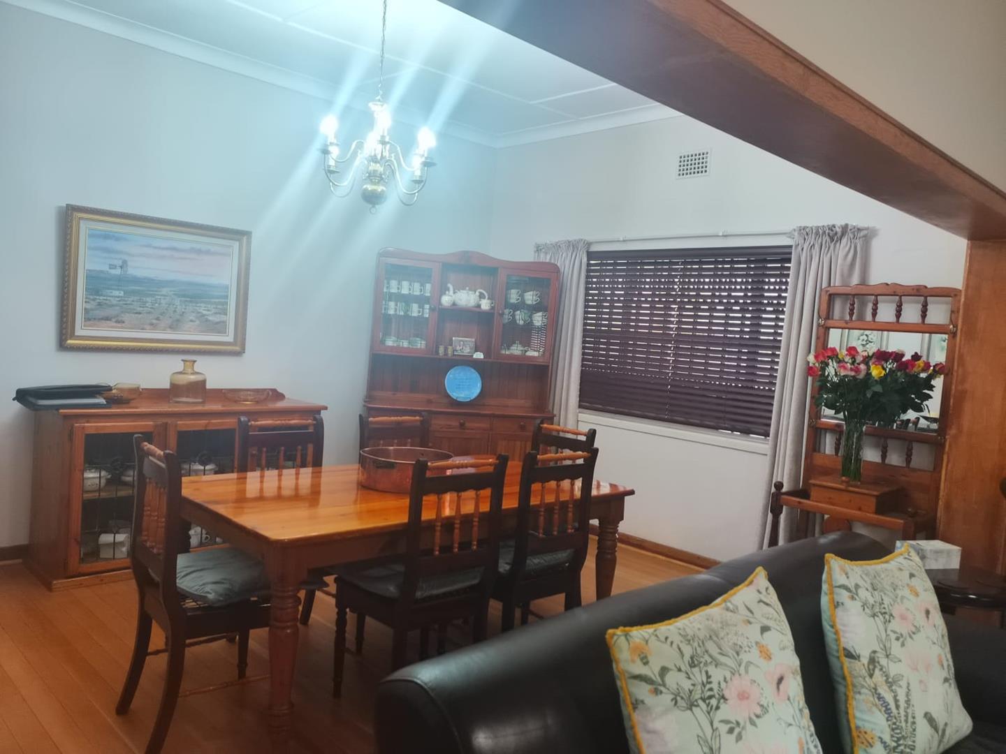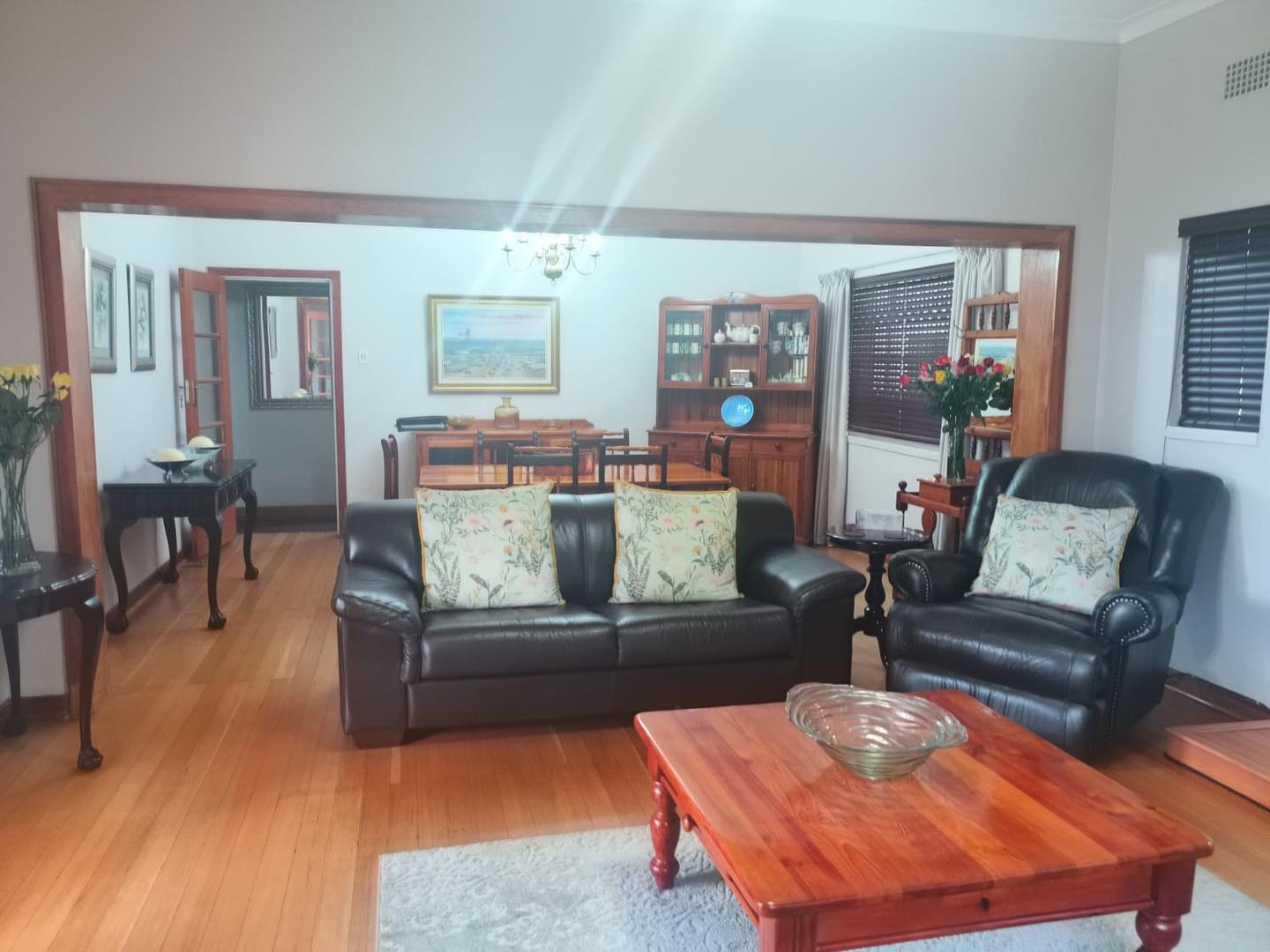 As you enter the home through the elegant double solid Oregon pine wooden front doors, you are greeted by the inviting lounge and dining room. These areas, along with the kitchen, study, main bedroom, and passage, are adorned with original Oregon pine flooring, adding timeless character and modern structural stability. The home also includes fully fitted blinds throughout and a charming Dimplex electric fire heater in the lounge for cozy evenings.