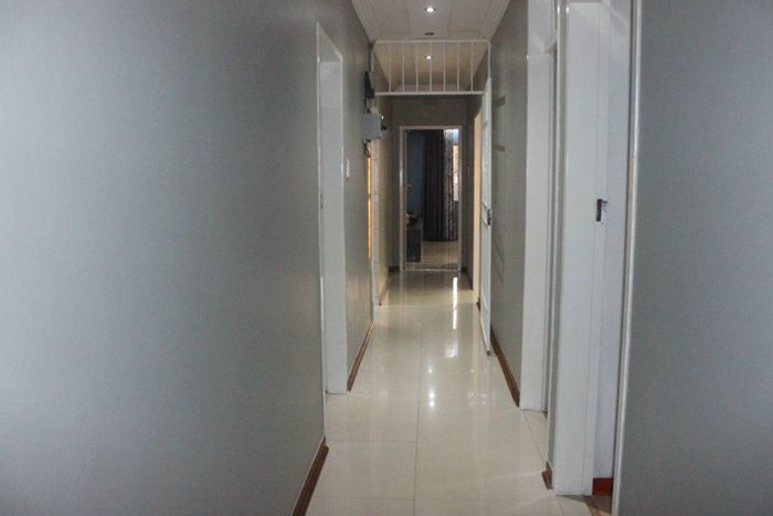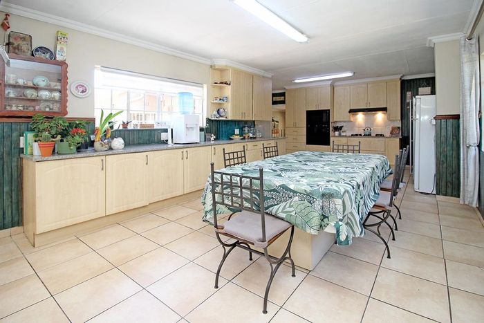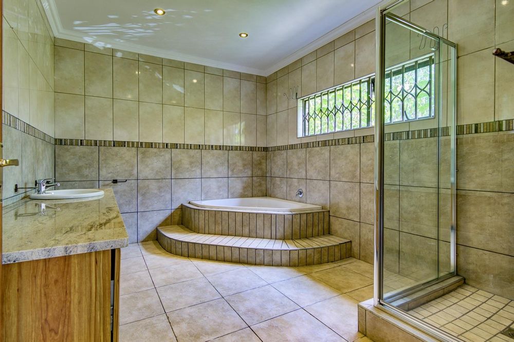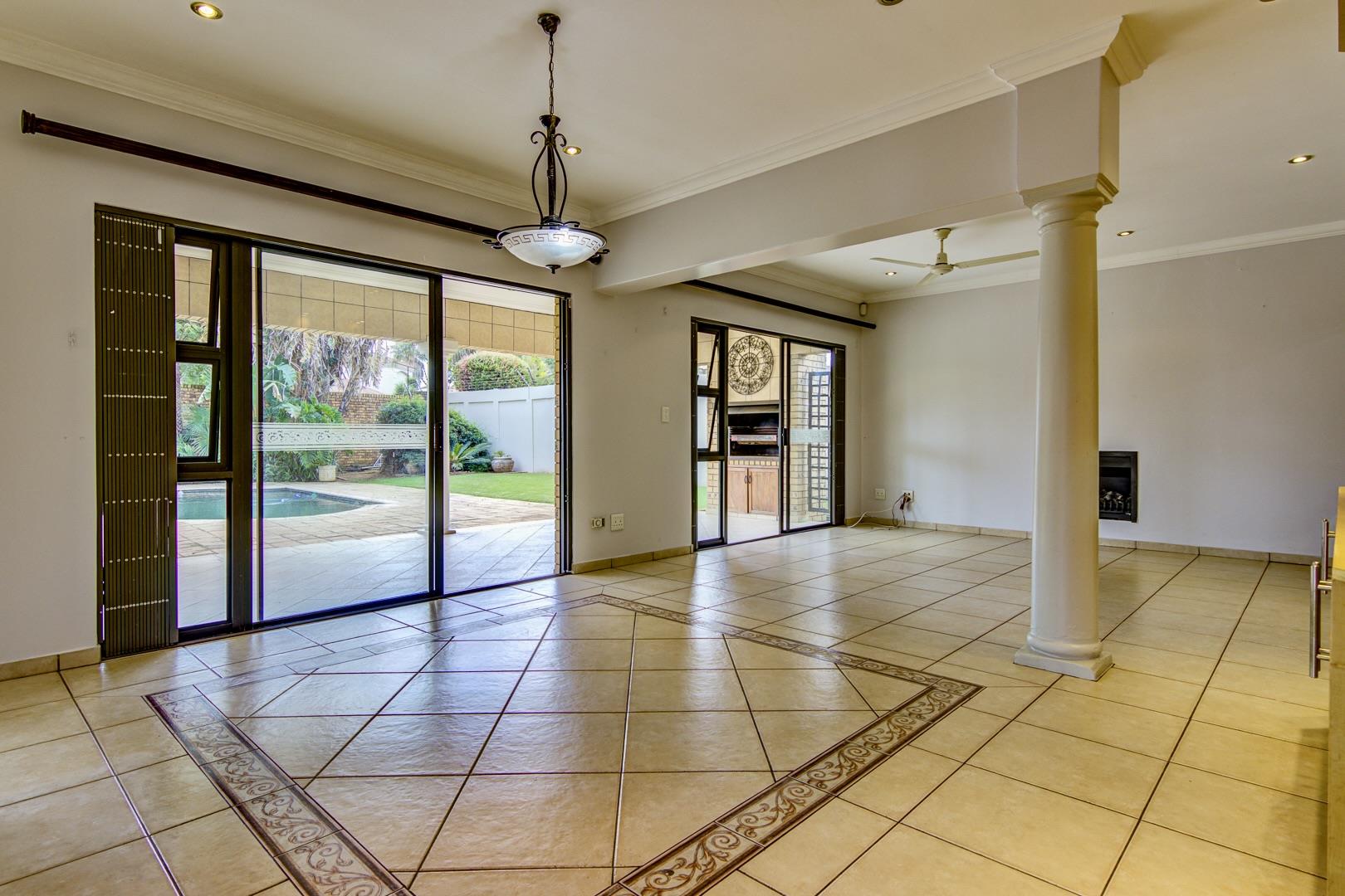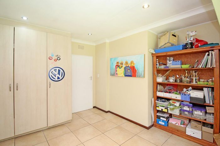 This welcoming, north facing home has an appealing layout ideal for relaxed family living. Downstairs, open plan living areas flow onto a long covered patio with built-in braai and a lovely view of the pool and landscaped garden. Watch the children swim and play from the open plan kitchen and scullery. Guest bathroom.