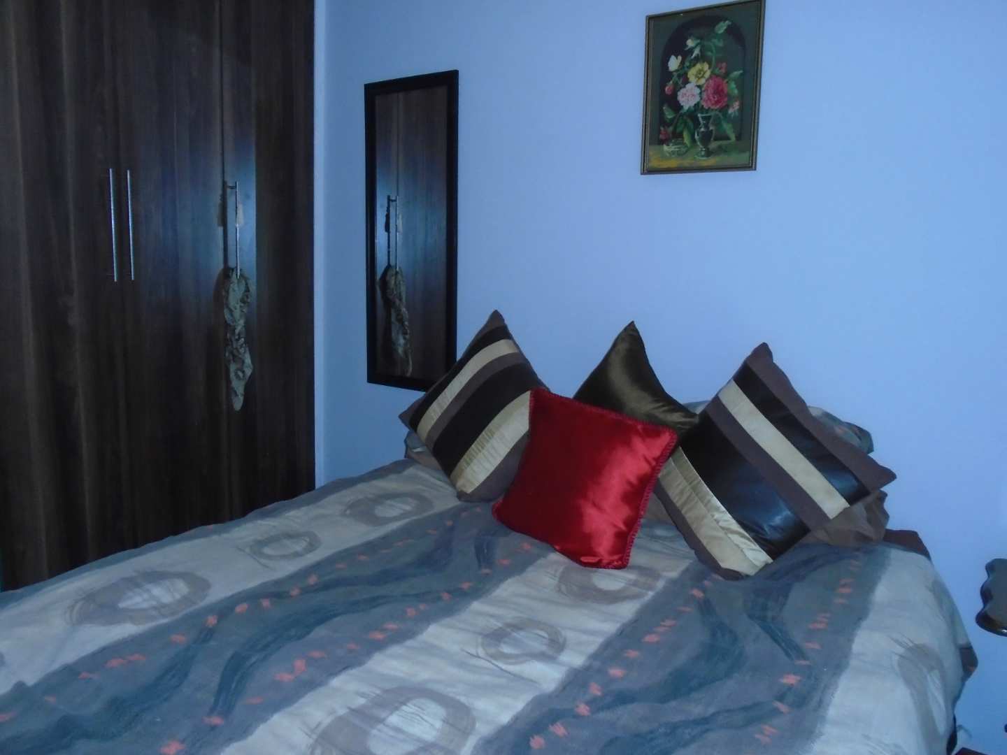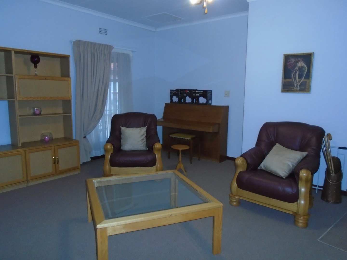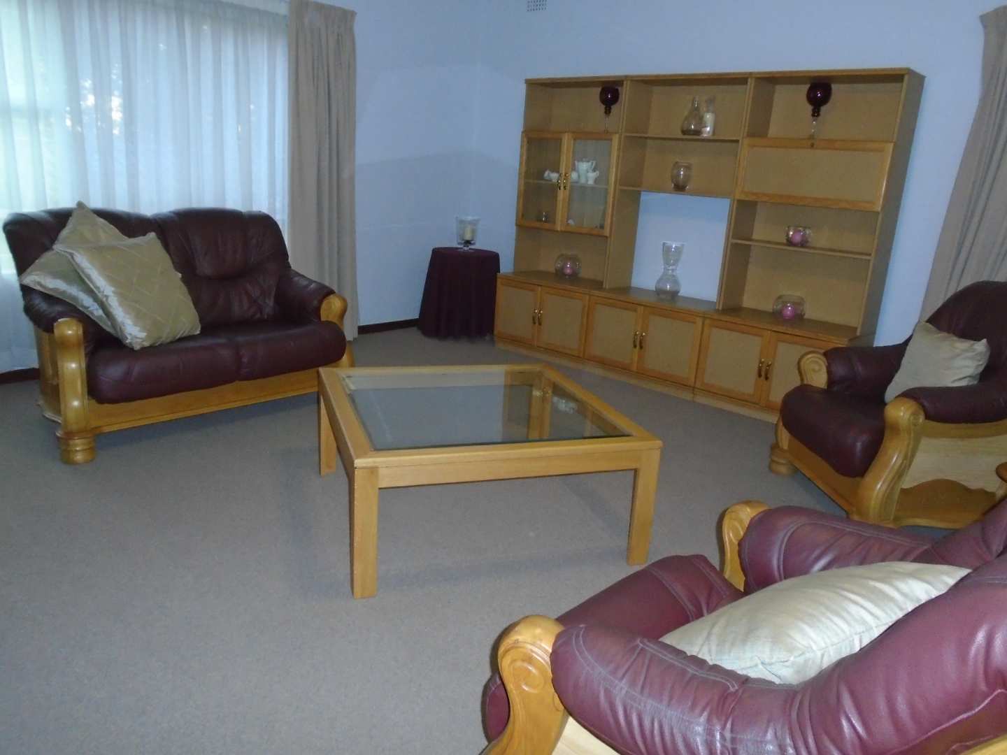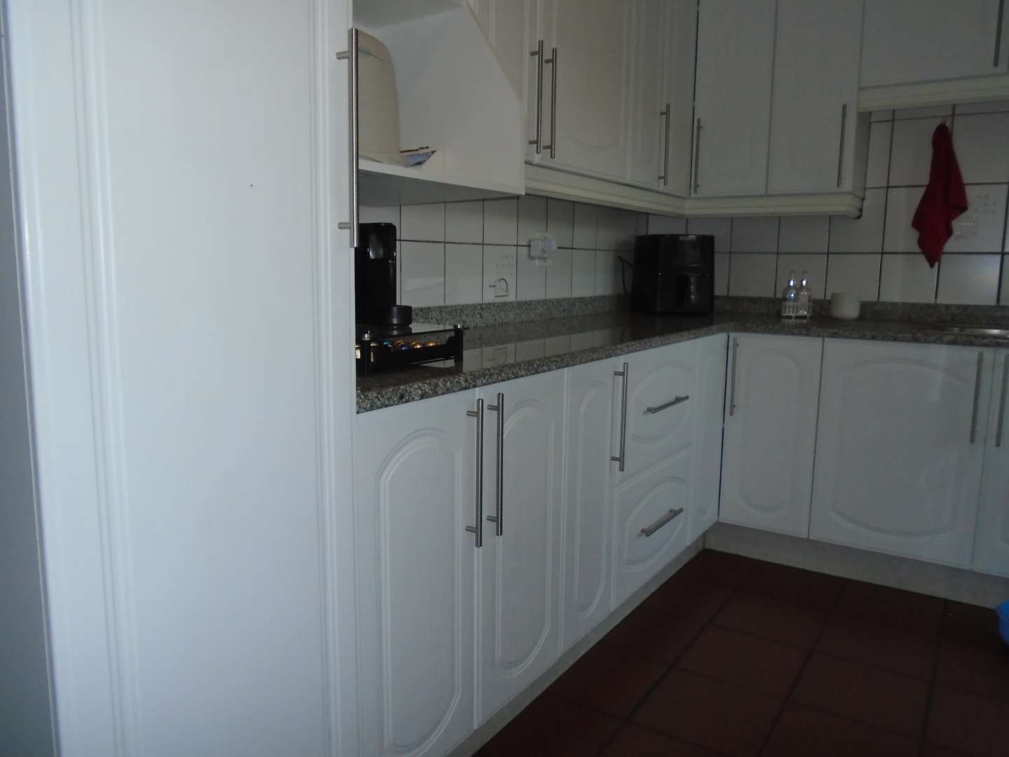 The open-plan dining area flows into a well-appointed kitchen, featuring melamine units and granite countertops, providing ample space for all your appliances. A convenient scullery complements the kitchen, adding extra functionality. For those who work from home, a tiled study with a movable cupboard, which is included with the property, offers a quiet workspace.