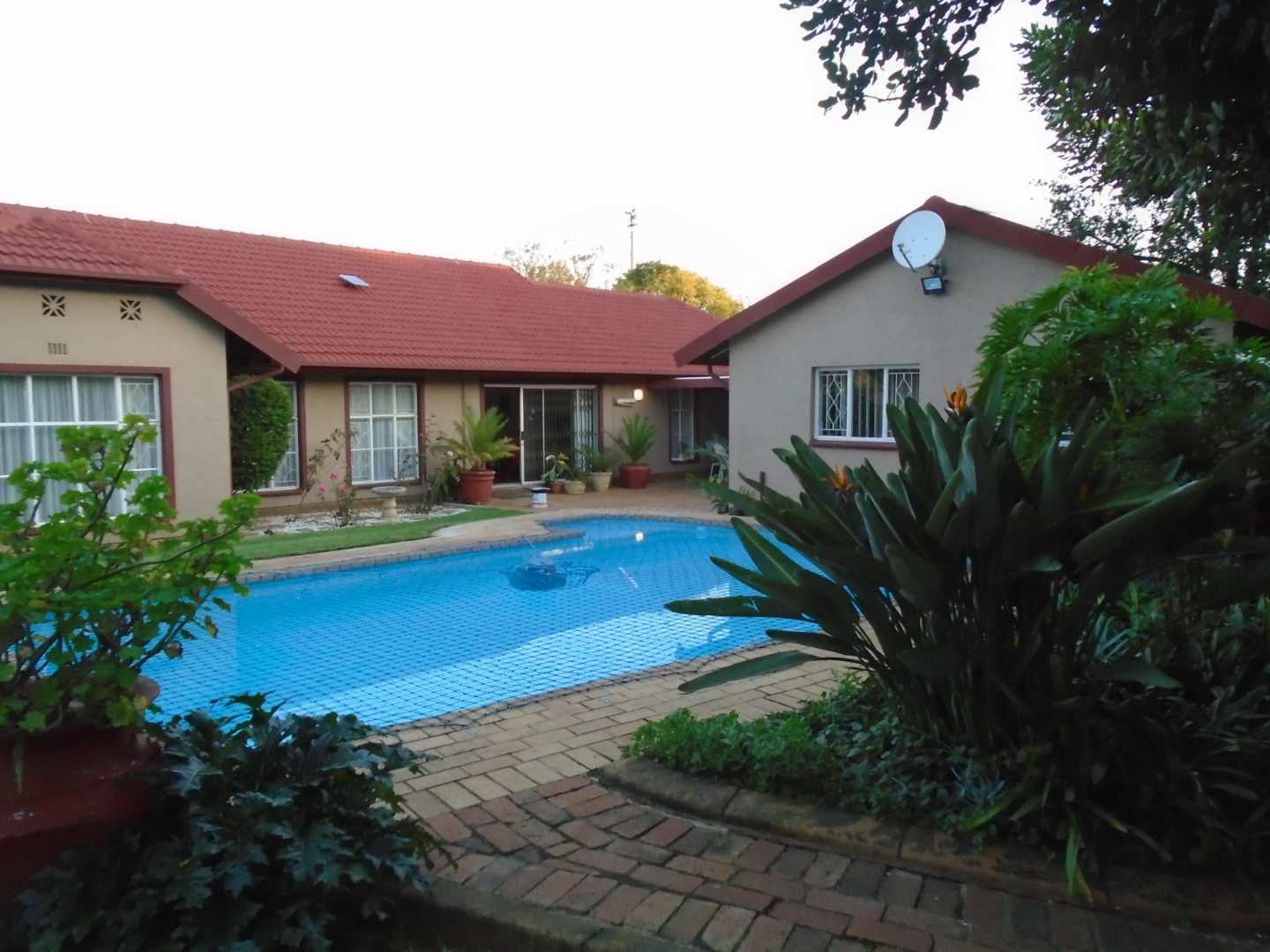 Step outside to enjoy a large swimming pool equipped with a safety net, ideal for family fun during warmer months. Additionally, the property includes a one-bedroom granny flat with a tiled lounge and an open-plan kitchen with melamine units. The bedroom offers built-in cupboards and is accompanied by a bathroom featuring a shower, toilet, washbasin, and vanity unit.