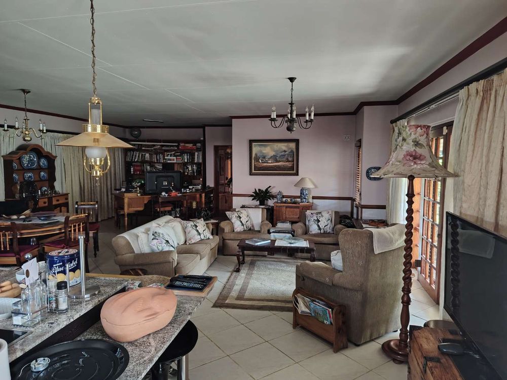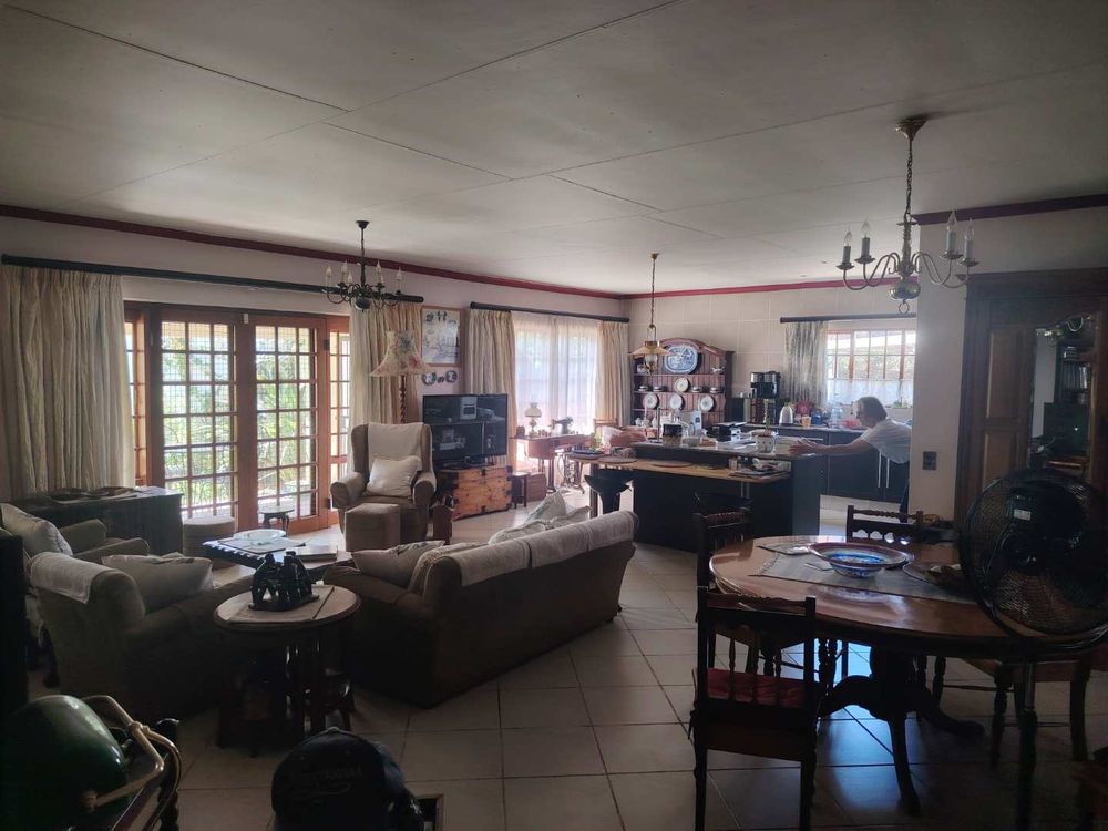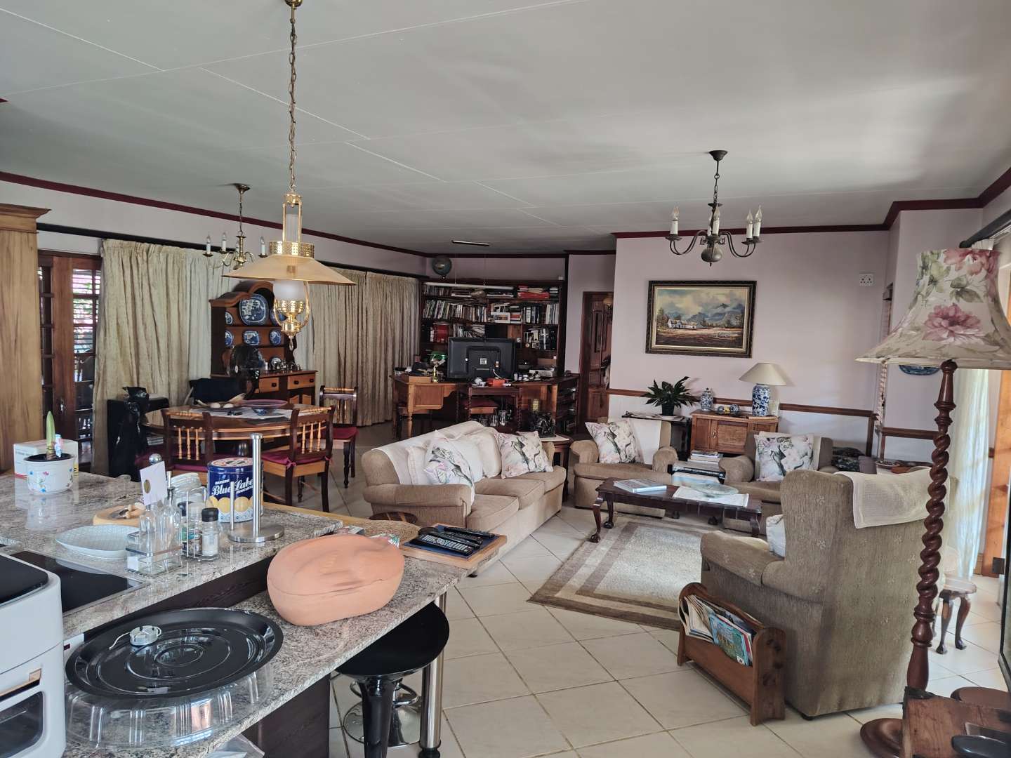 The home features a spacious open-plan layout, seamlessly connecting the kitchen, dining room, lounge, and study. The modern kitchen is fitted with granite countertops, a sleek glass four-plate stove, an undercounter oven, and ample built-in cupboards, with tiled floors and walls.