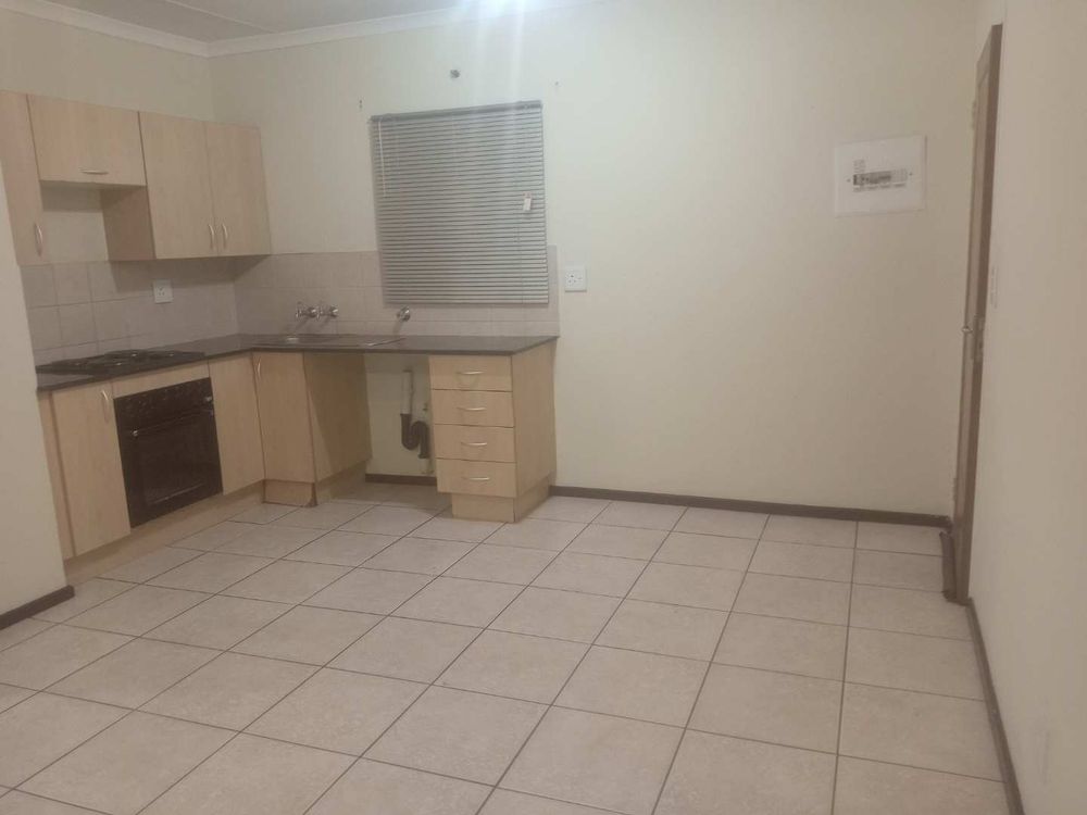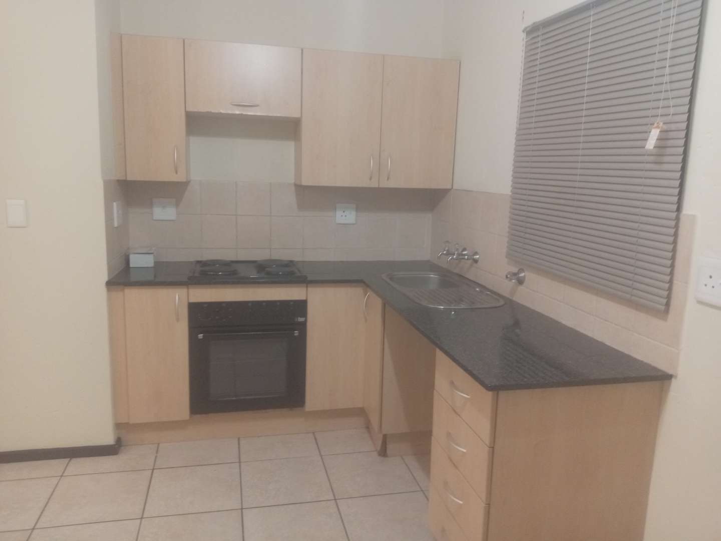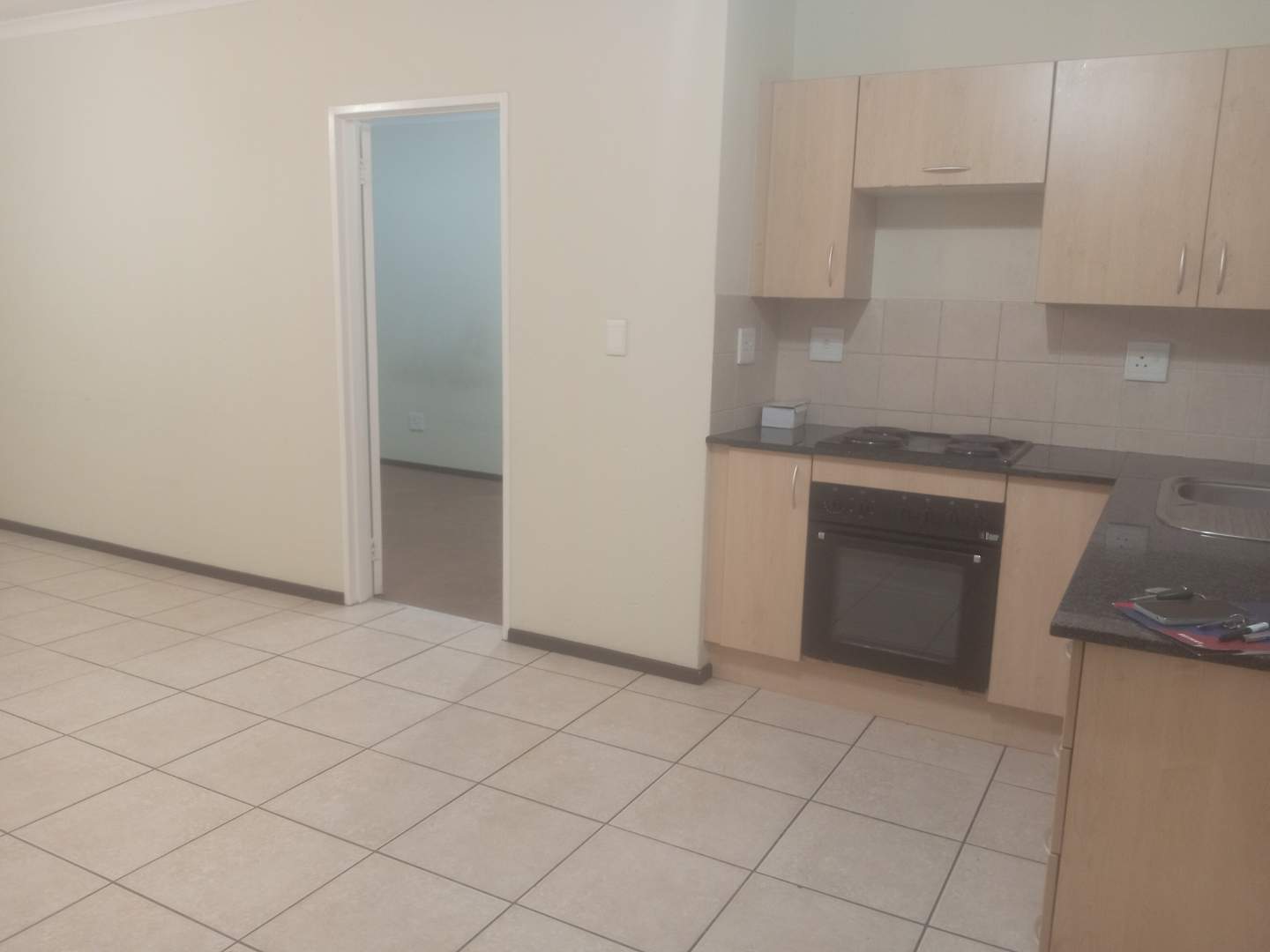 Step into the well-appointed kitchen, which features stylish tiling, a single sink, and modern appliances including a four-plate stove and an under-counter oven. The open-plan lounge, also elegantly tiled, provides a spacious area for relaxation and entertainment.
