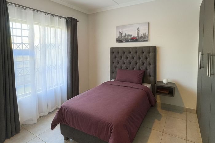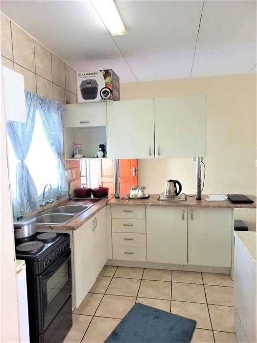 Three-bedroom home with en-suite, tiled bathrooms, furnished kitchen, open lounge, paved yard, near schools, shopping, fuel stations, and major roads.
