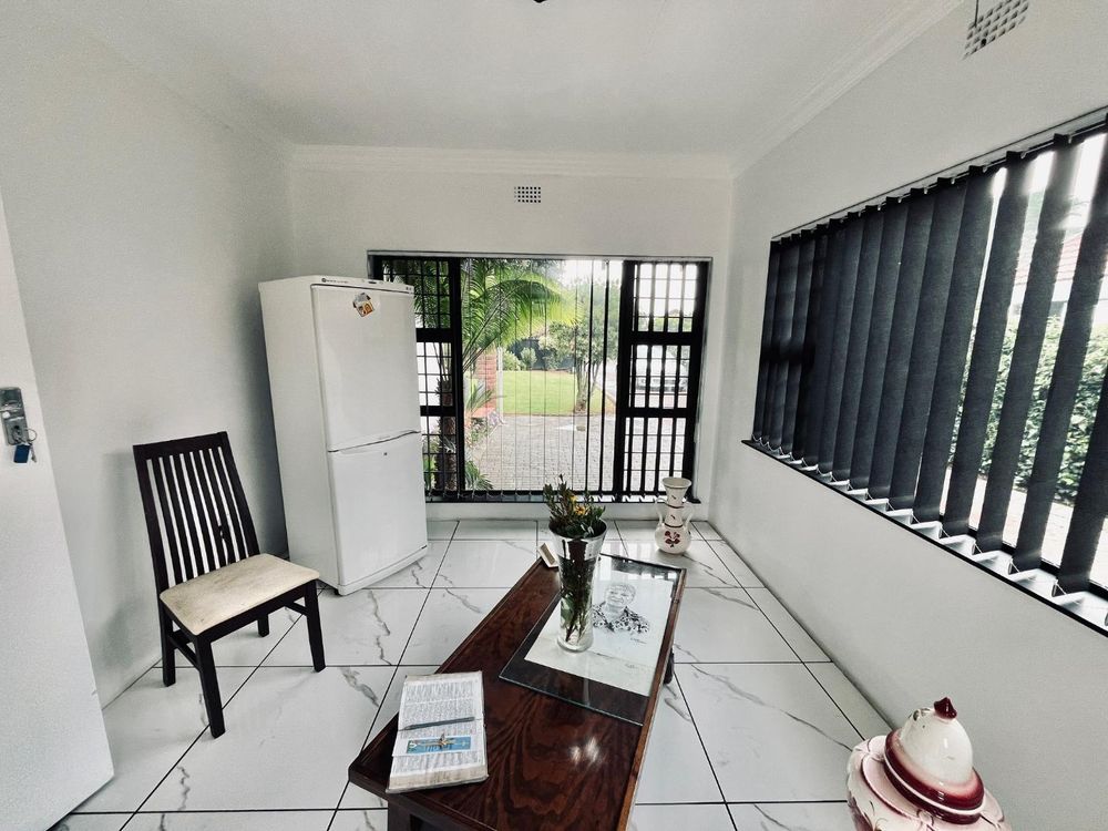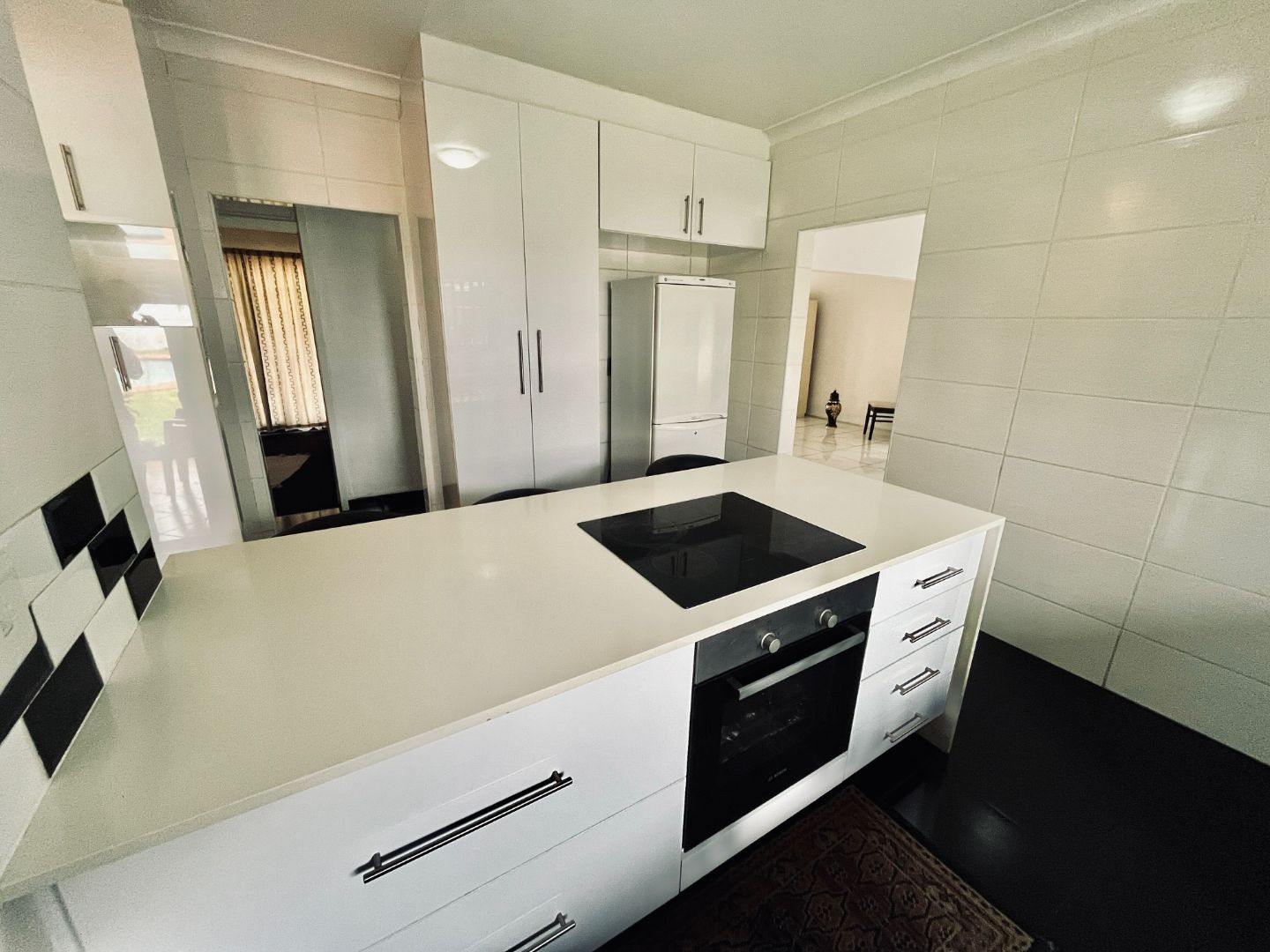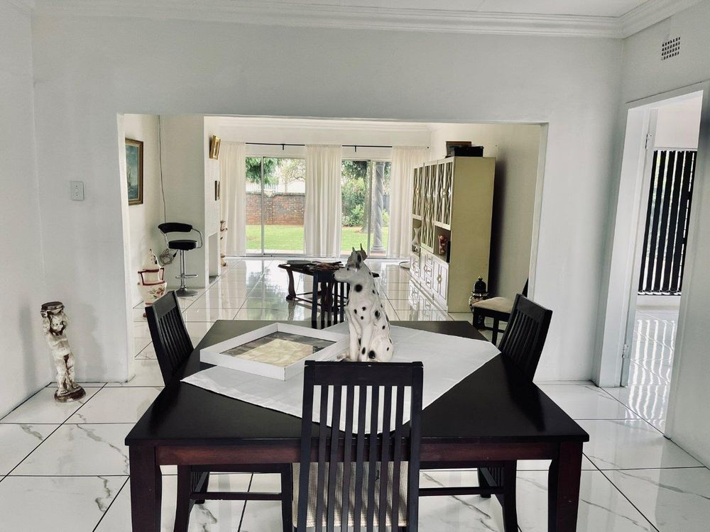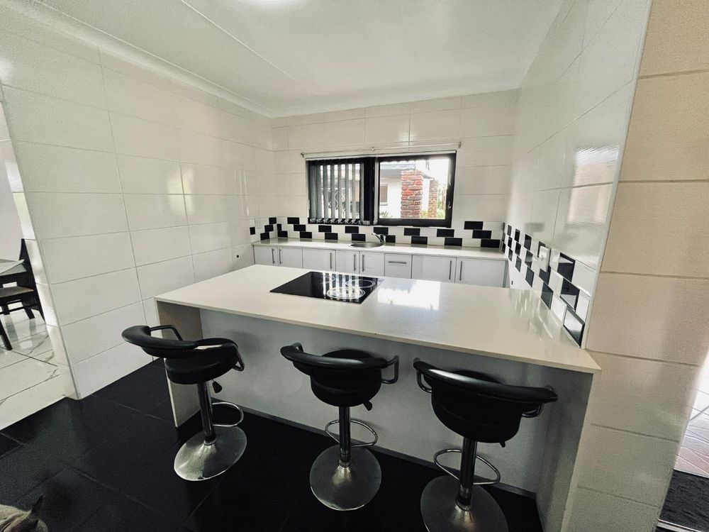 The home offers a large open-plan lounge with tiled floors and sliding doors that open onto the garden. The dining room is also open plan and has aluminium sliding windows overlooking the backyard.