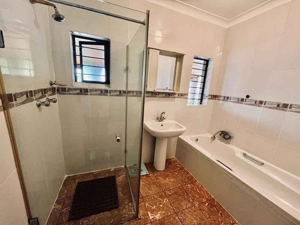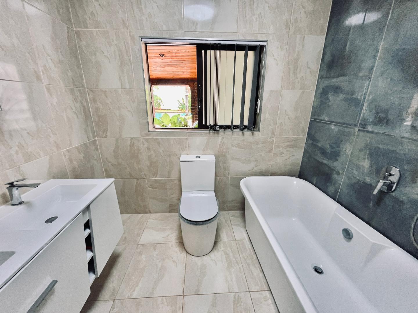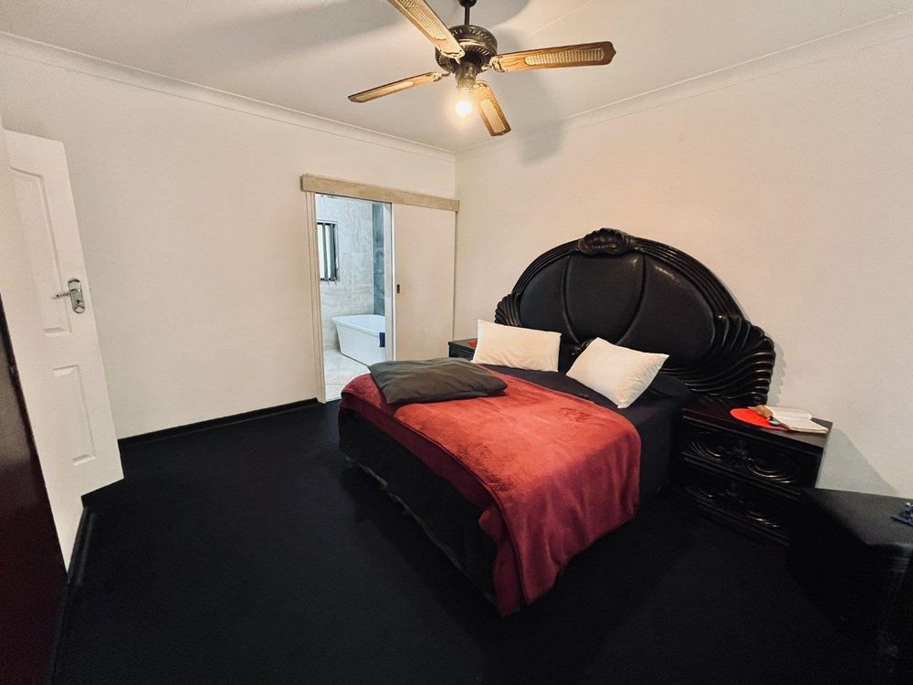 The main bedroom is north-facing with aluminium windows, built-in cupboards, carpeted floors, a ceiling fan, and a TV connection. It also has a modern en-suite bathroom with tiled floors and walls, a bath with hand shower, toilet, and double basin.