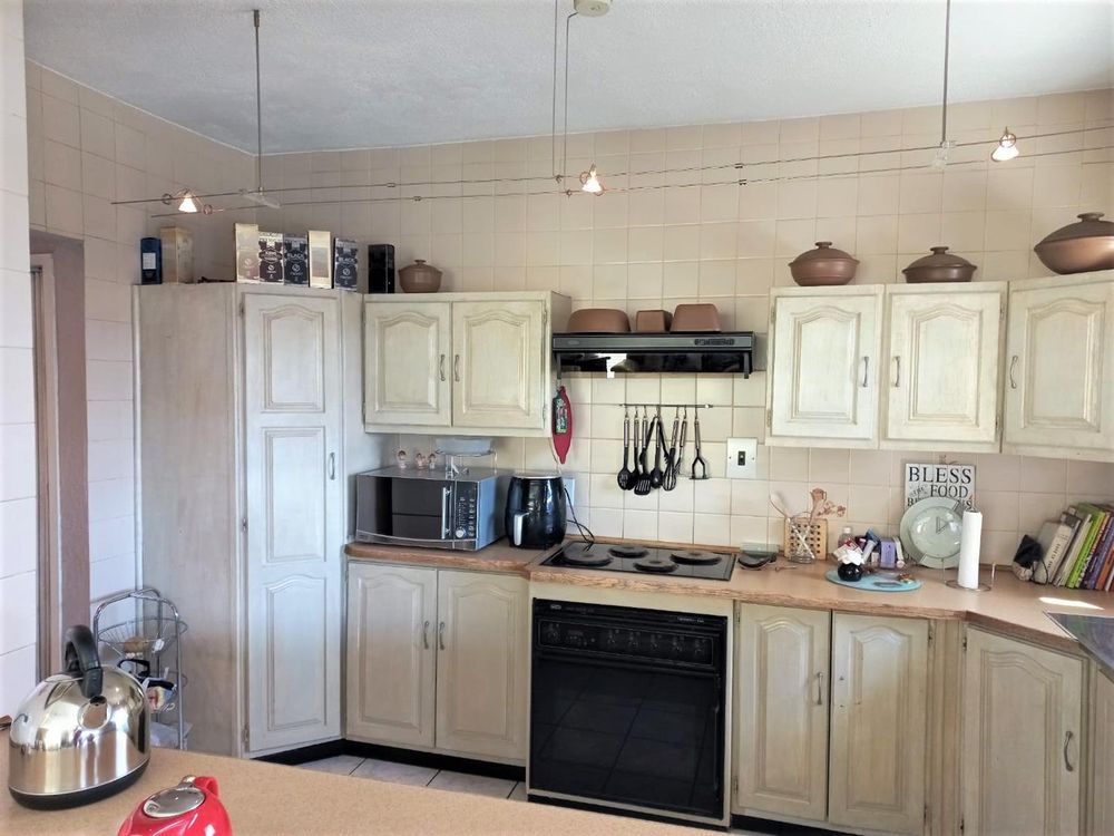 The well-designed kitchen offers ample appliance space and features a convenient breakfast nook nestled between the lounge and kitchen. Easy access to the courtyard from the kitchen extends your living space outdoors effortlessly. A guest toilet conveniently located near the stairway ensures convenience, while security measures such as a perimeter wall, electric fencing, and remote gate entrance provide peace of mind. A double remote garage offers secure parking for your vehicles.