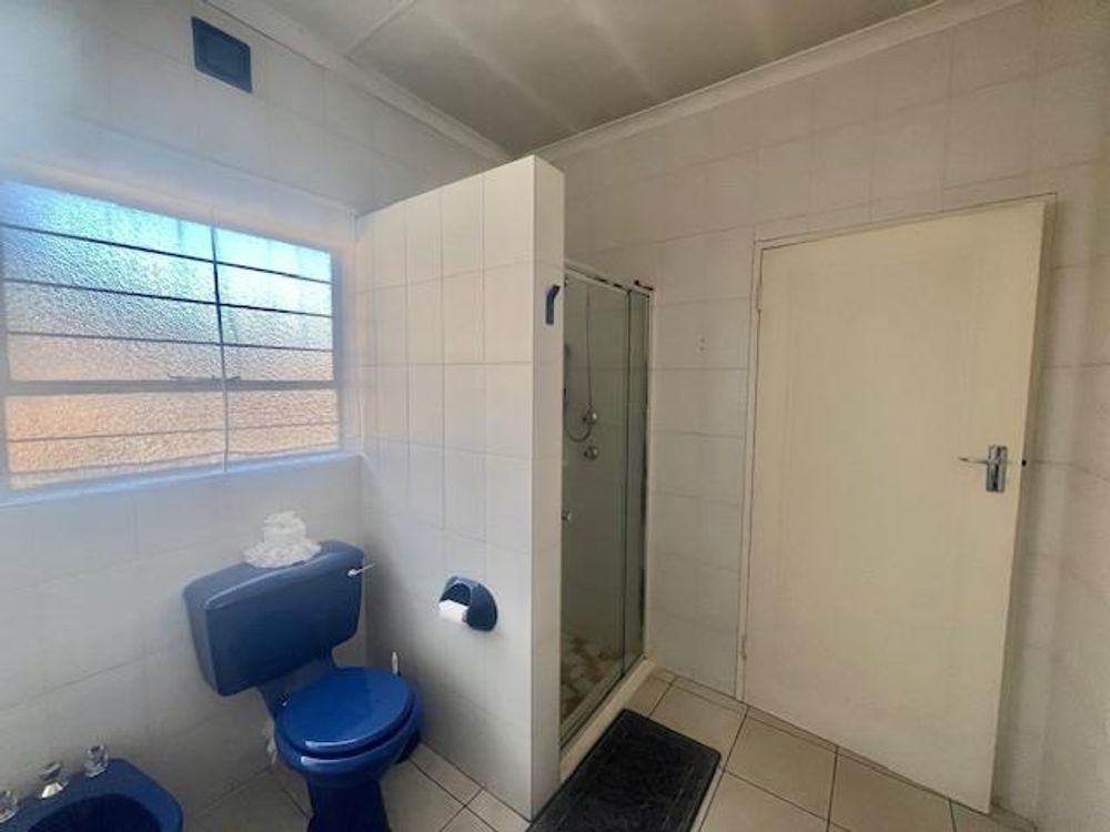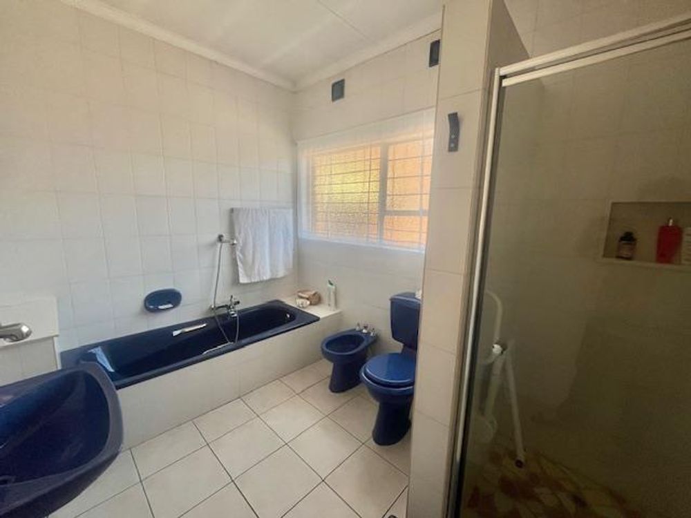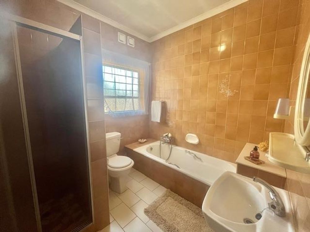 The property boasts two full bathrooms, thoughtfully designed for convenience. The spacious en-suite bathroom includes a shower, bath, basin, and toilet, all beautifully tiled to the ceiling. The second bathroom also offers a bath, shower, single vanity basin, and toilet, complemented by an additional guest toilet in the passage—all with tiled floors and walls for easy maintenance.
