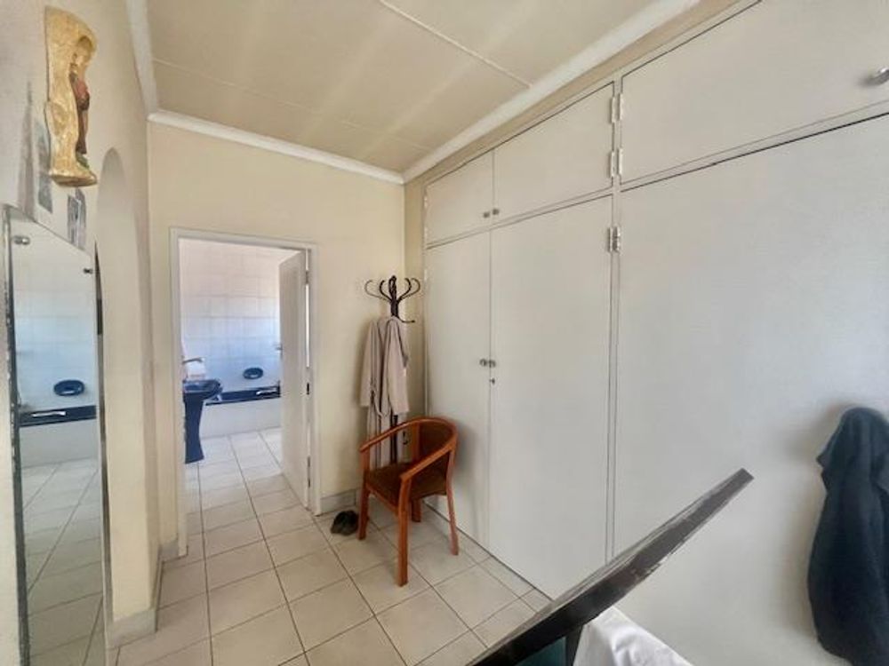 The main bedroom is a generous retreat, northeast facing to capture warmth during the chilly winter months. It features tiled floors and an arched entry into a dressing room with ample cupboard space. A large window offers views of the front garden, complete with curtain rails for privacy. Two additional northeast-facing bedrooms provide built-in cupboards and tiled floors, perfect for family or guests.