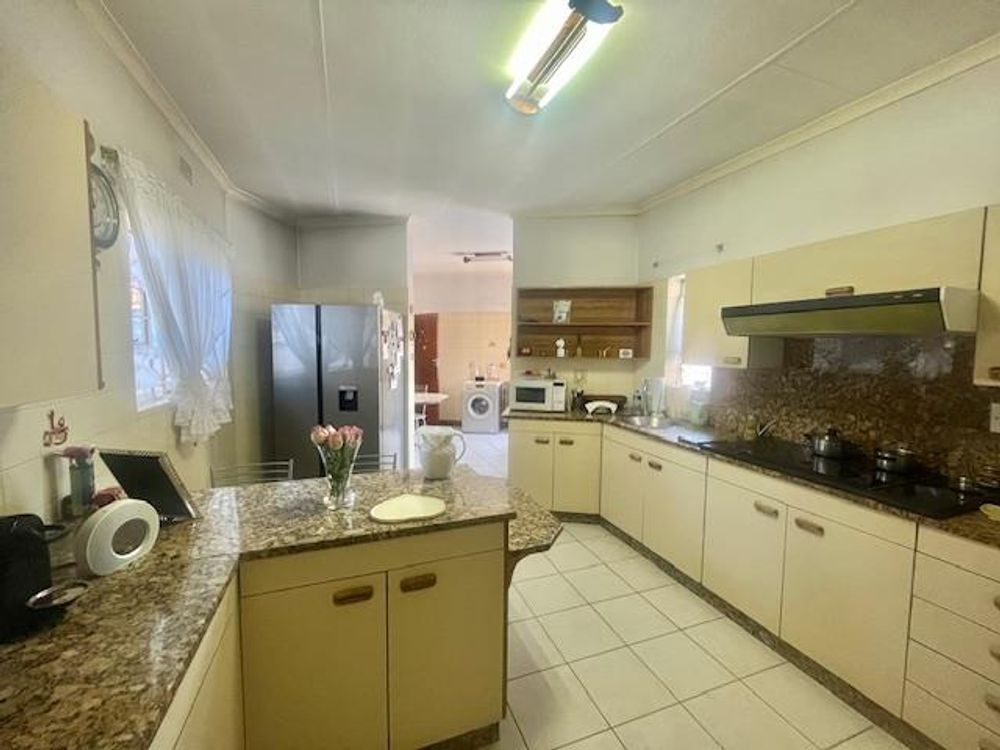Convenience extends to the neat double garage with automated wood roller doors and extra open parking on a paved driveway. The modern open-plan kitchen is a chef's delight, equipped with solid wooden cupboards, granite tops, a four-plate electric stove with an extractor fan, and a double eye-level oven. The breakfast nook and medium-sized walk-in pantry add functionality and charm. Adjacent to the kitchen is a spacious laundry area with connection points for a dishwasher and washing machine, as well as a double basin and access to the paved outdoor washing line.