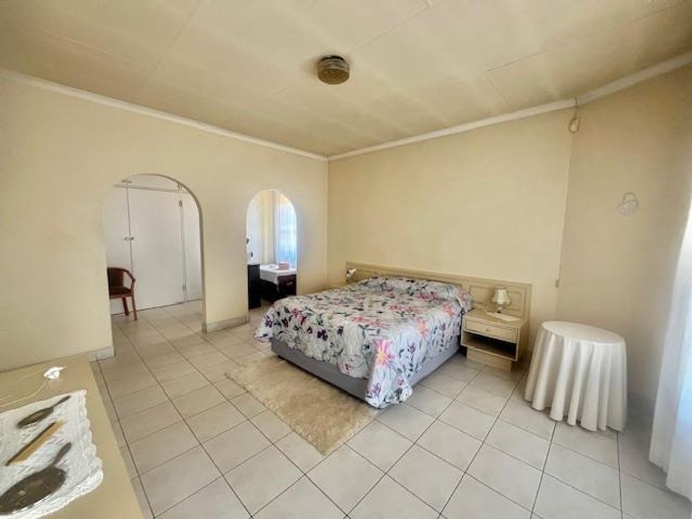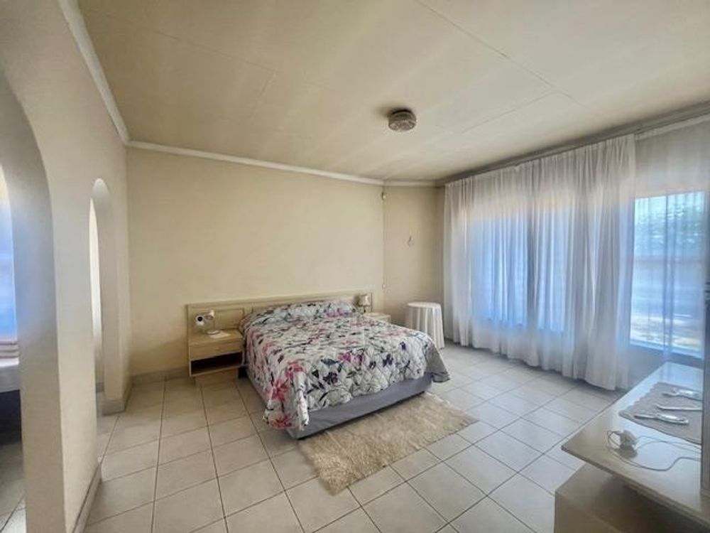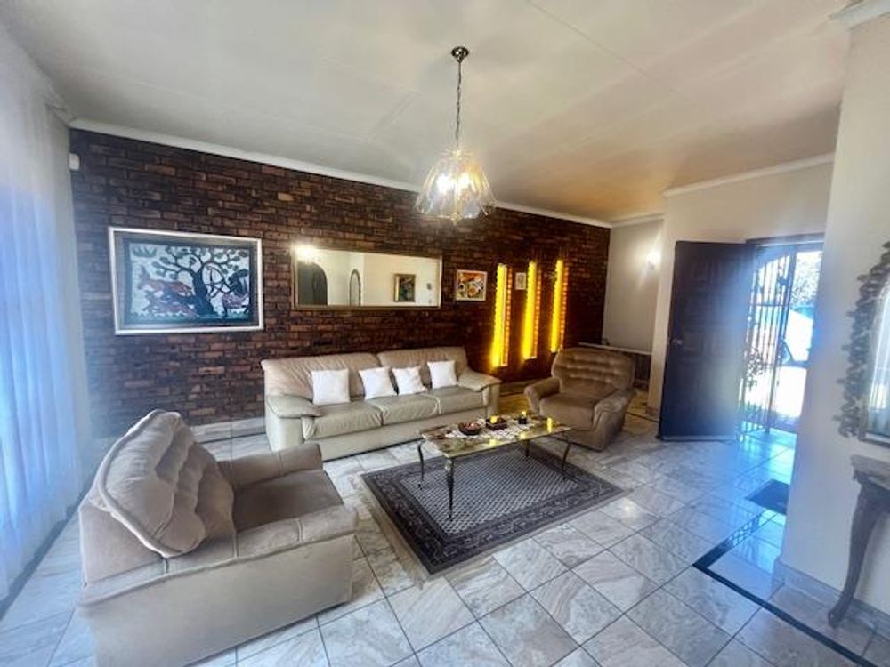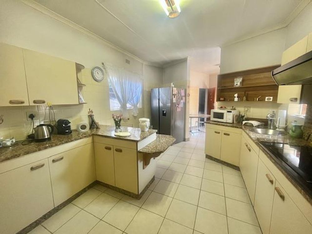 Nestled within a secure, enclosed boomed area with access control, this home provides peace of mind with security doors and burglar bars on open windows. Step inside to find an inviting open-plan lounge, TV room, and dining room, all adorned with tiled floors. Some rooms feature fitted blinds while others have curtain rails, offering a touch of elegance and versatility.